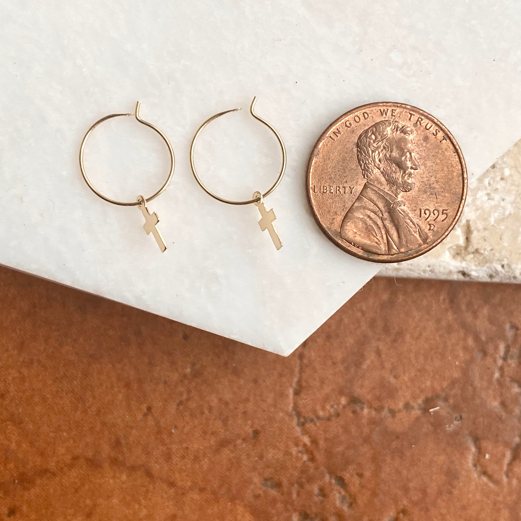 14KT Yellow Gold Dangling Cross Charms Mini Hoop Earrings