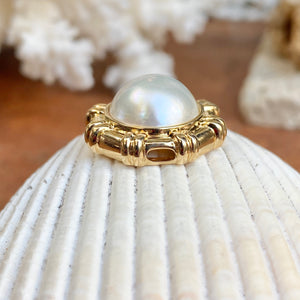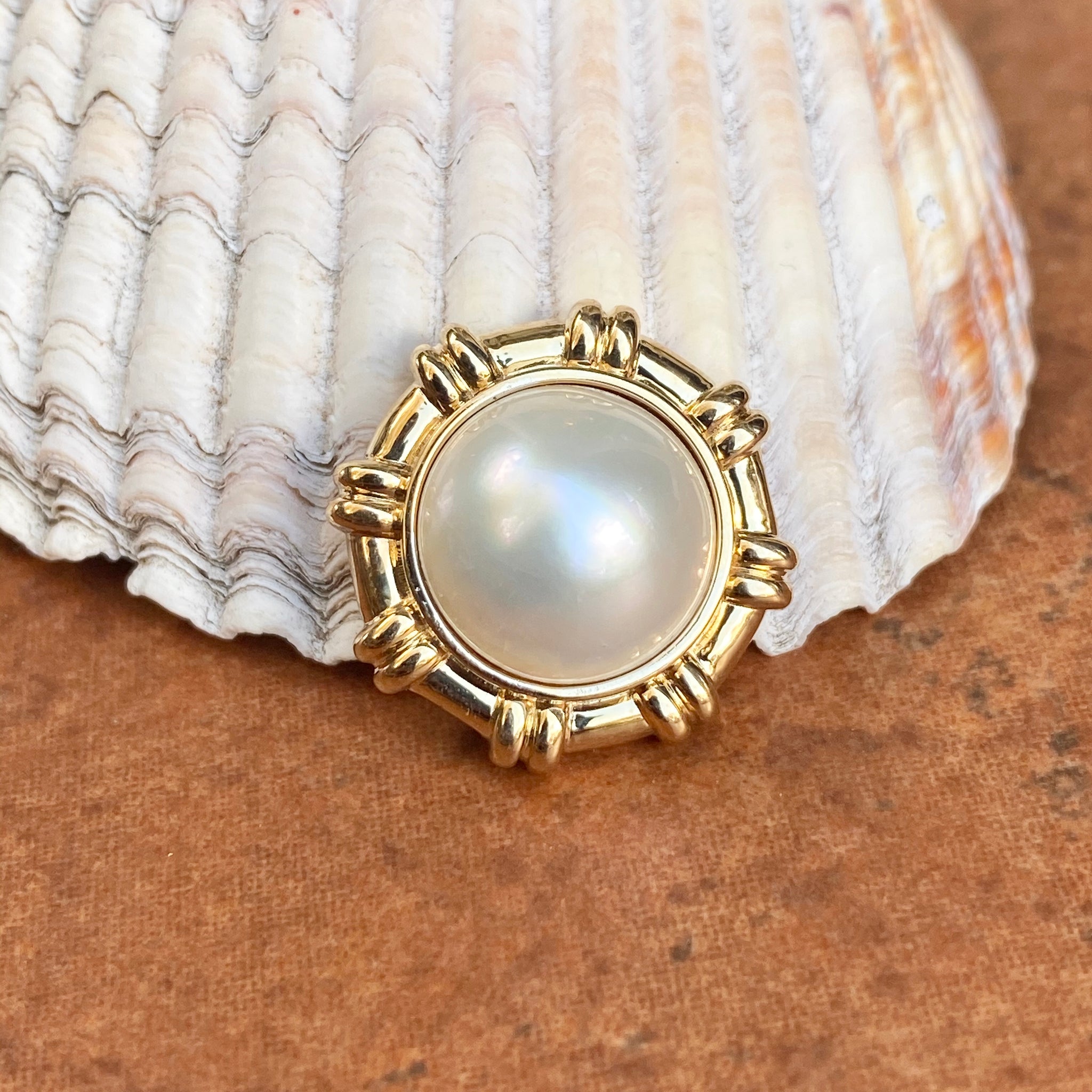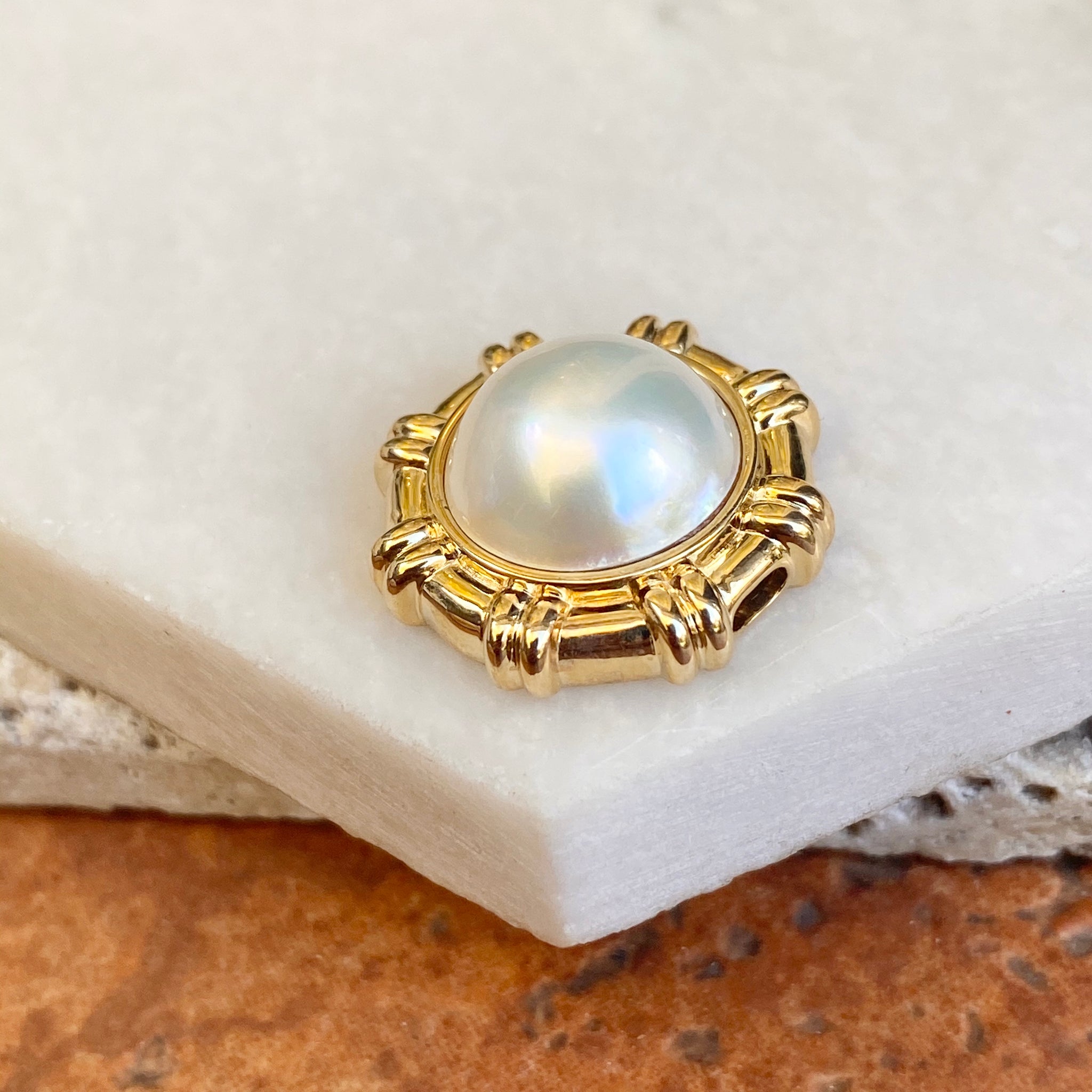 Polished 14KT yellow gold genuine, white Mabe pearl pendant slide. Pretty, large Mabe pearl surrounded with textured, detailed frame.