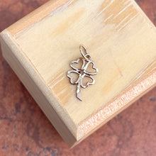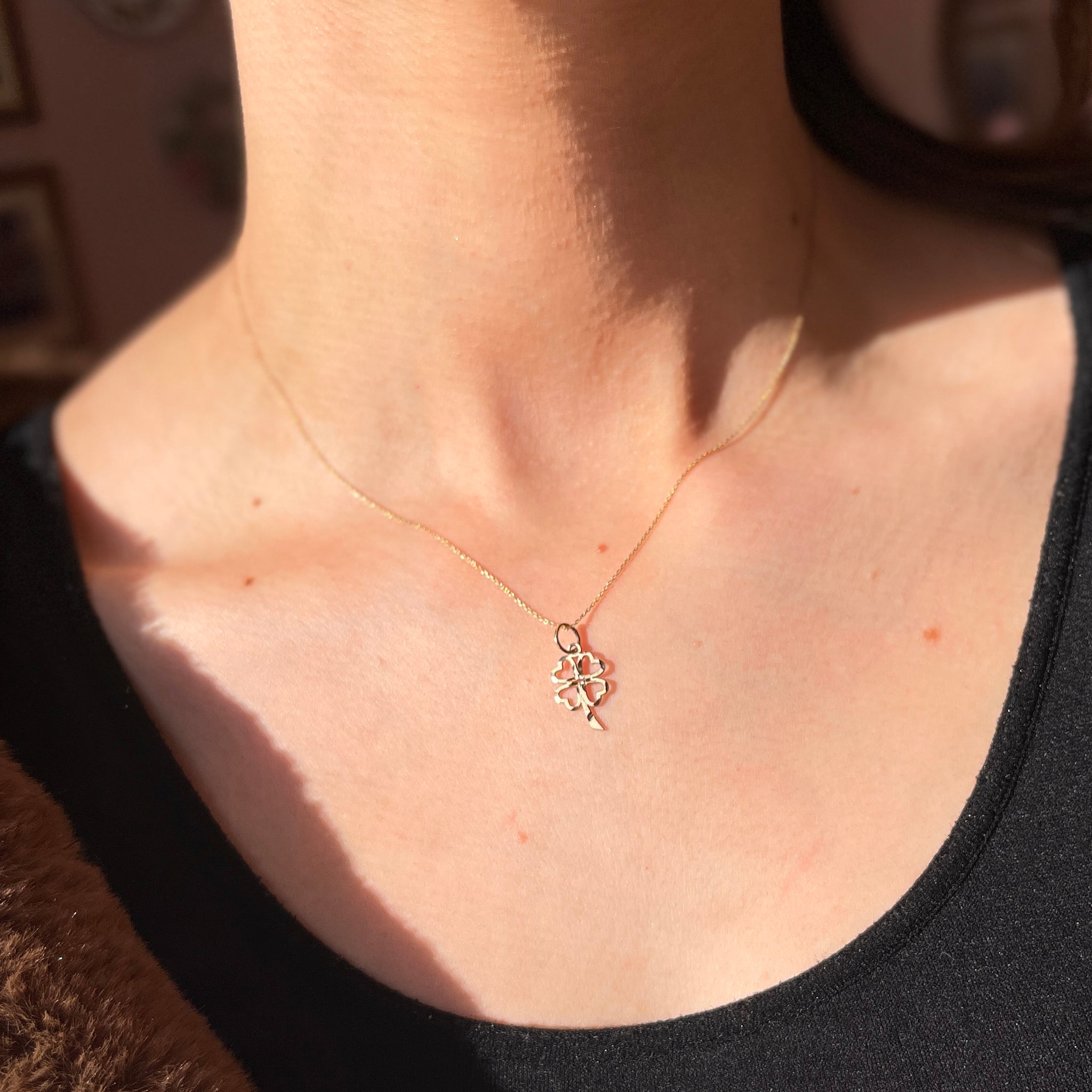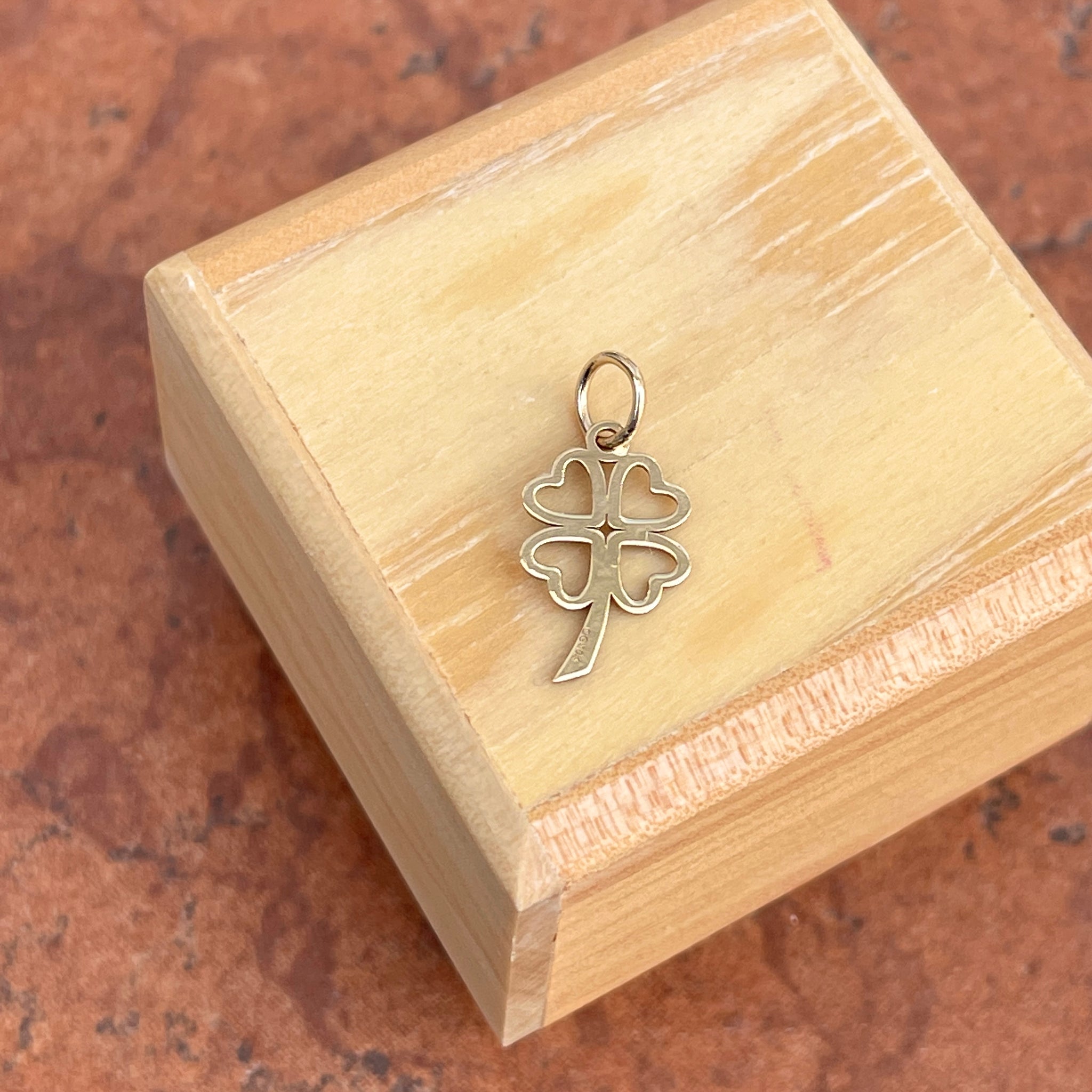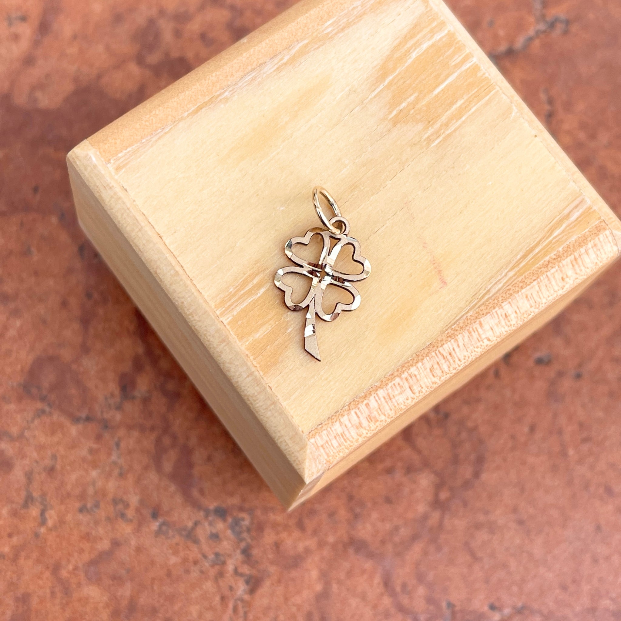 10KT yellow gold diamond-cut + satin-finished 4-leaf clover lucky pendant charm. Each leaf is heart-shaped! This charm looks great on a thin chain by itself, or wear combined with special charms to create an interesting conversation piece necklace. Also available in 10KT white gold.