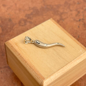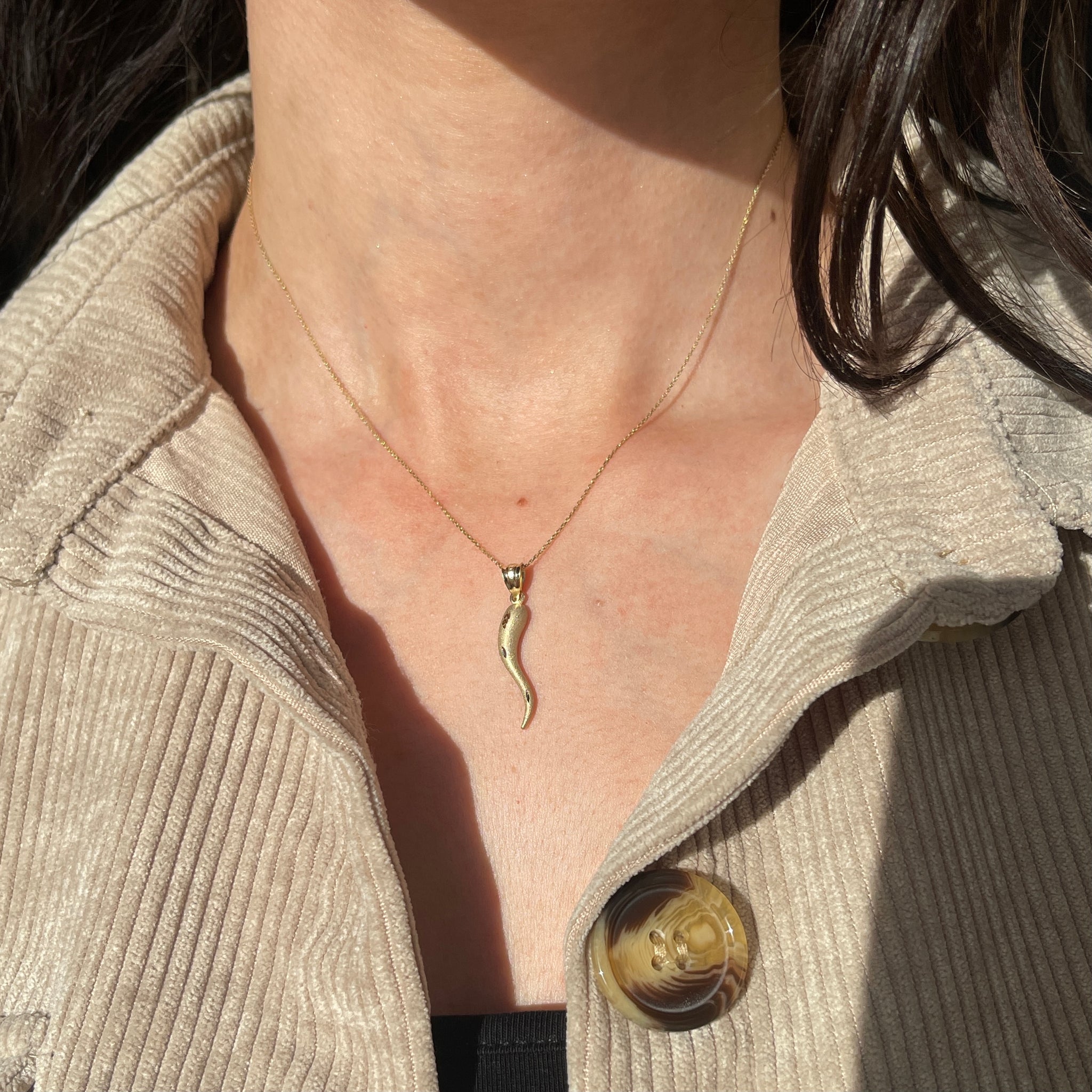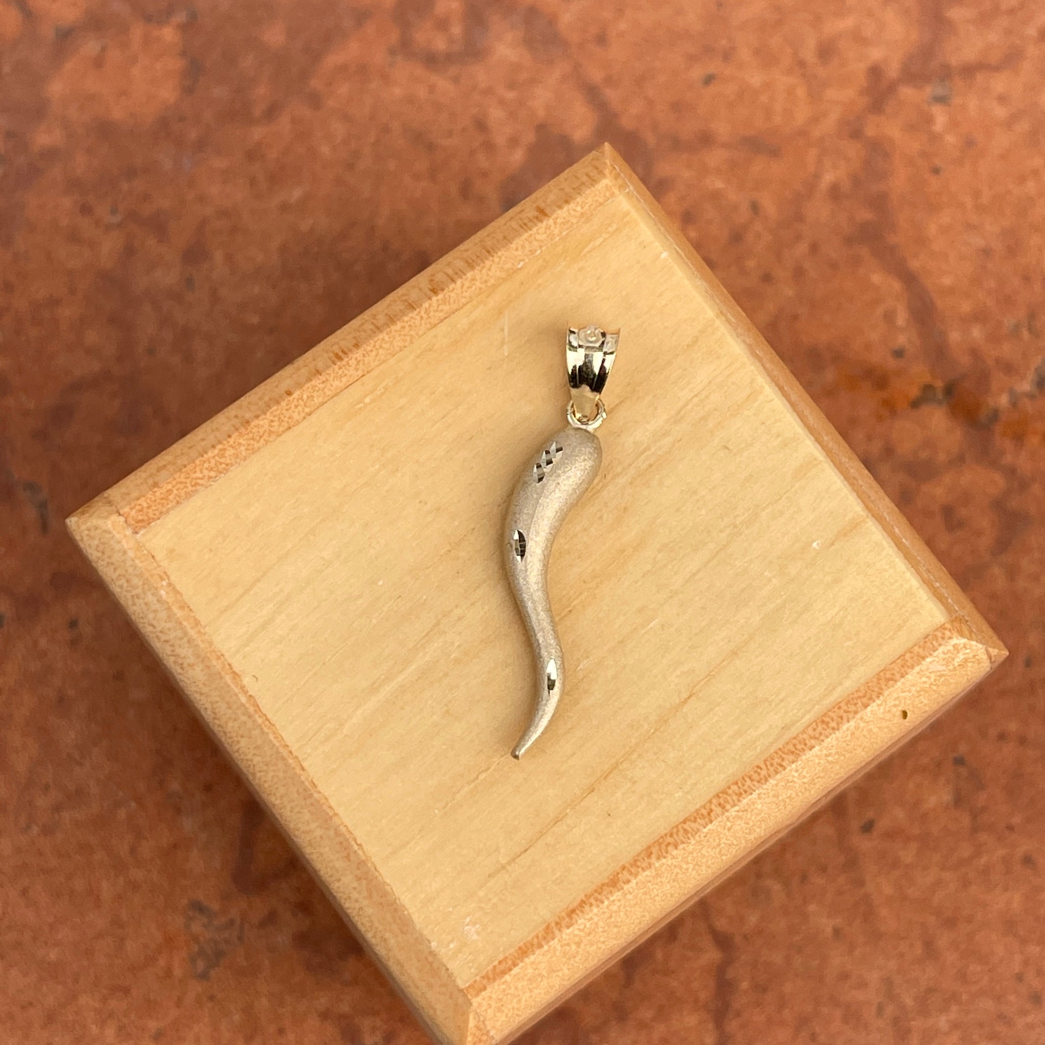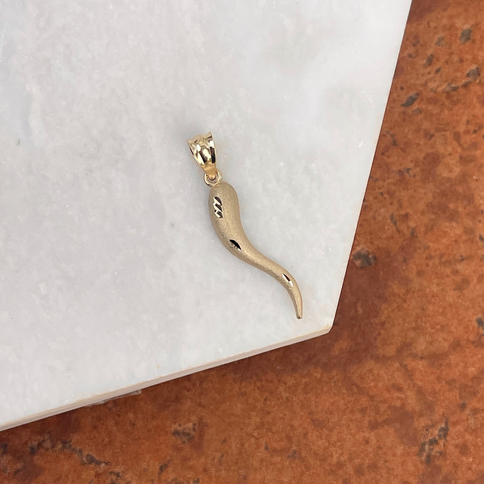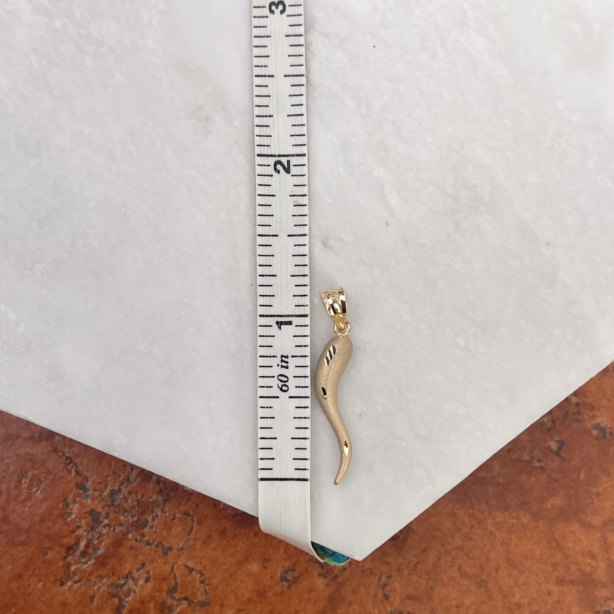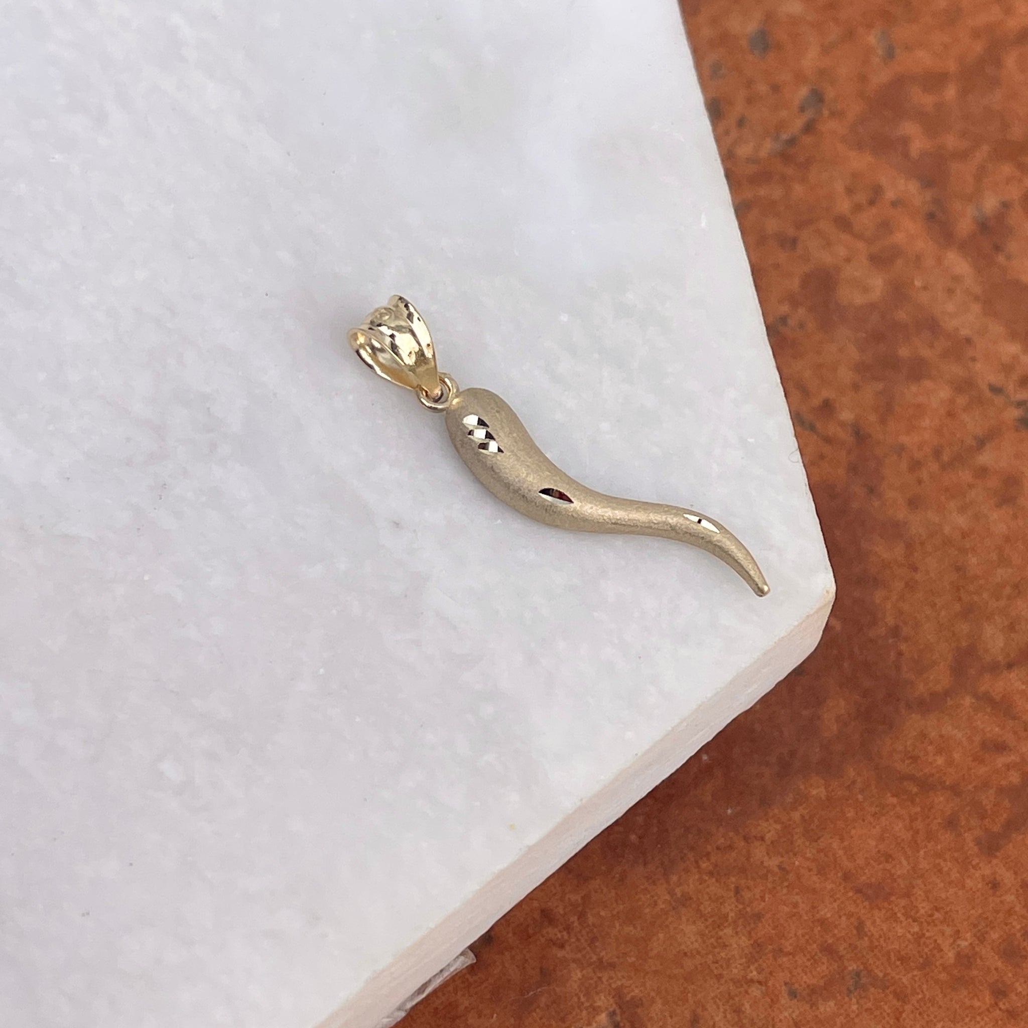 Satin 14KT yellow gold solid diamond-cut "Cornicello" Italian horn pendant. Symbol of Italy worn to protect against evil. Cornicello: meaning little horn in Italian. Pair it with one of our yellow gold chains to complete the look!