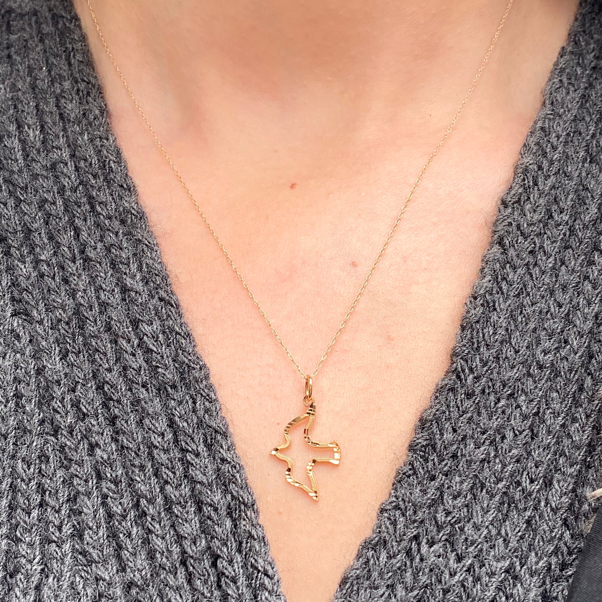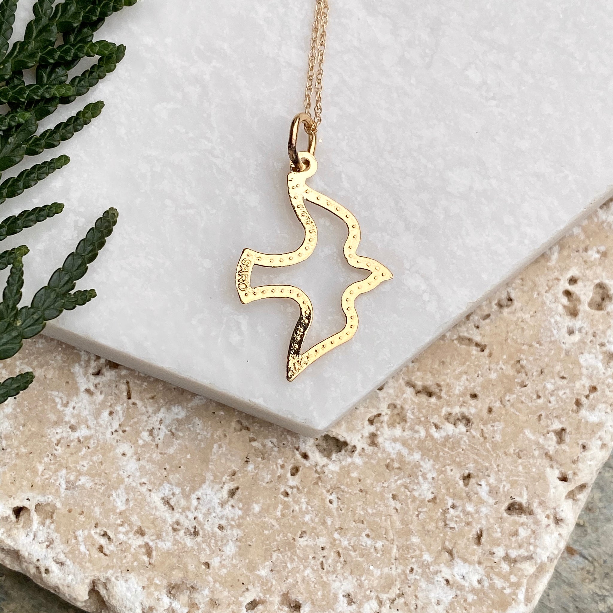 Satin + diamond-cut 14KT yellow gold dove "Holy Spirit" pendant on a thin, 14KT yellow gold cable chain necklace. This holy dove charm necklace makes a special + meaningful gift for the holidays, birthdays, etc.! Model is wearing a 18" chain length.