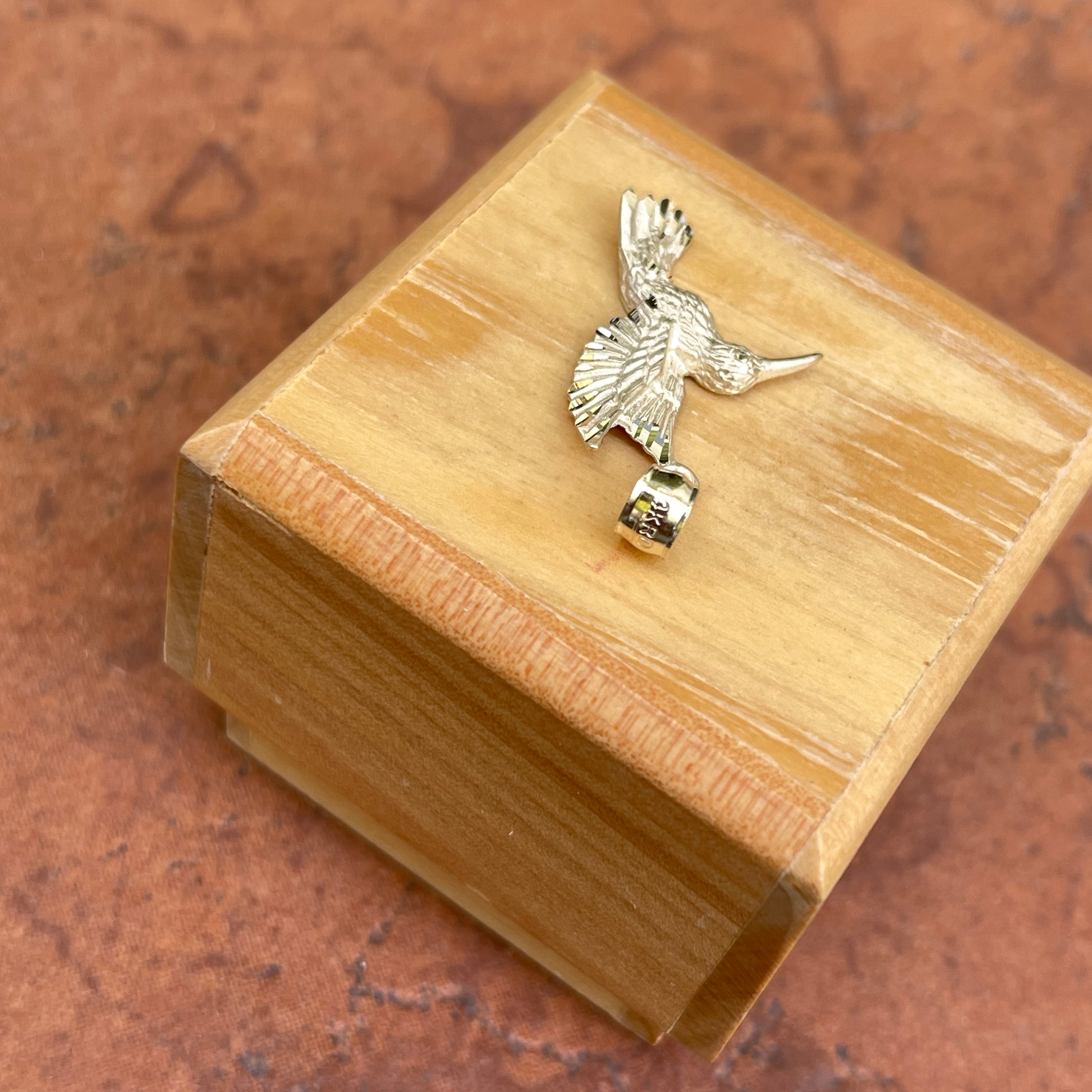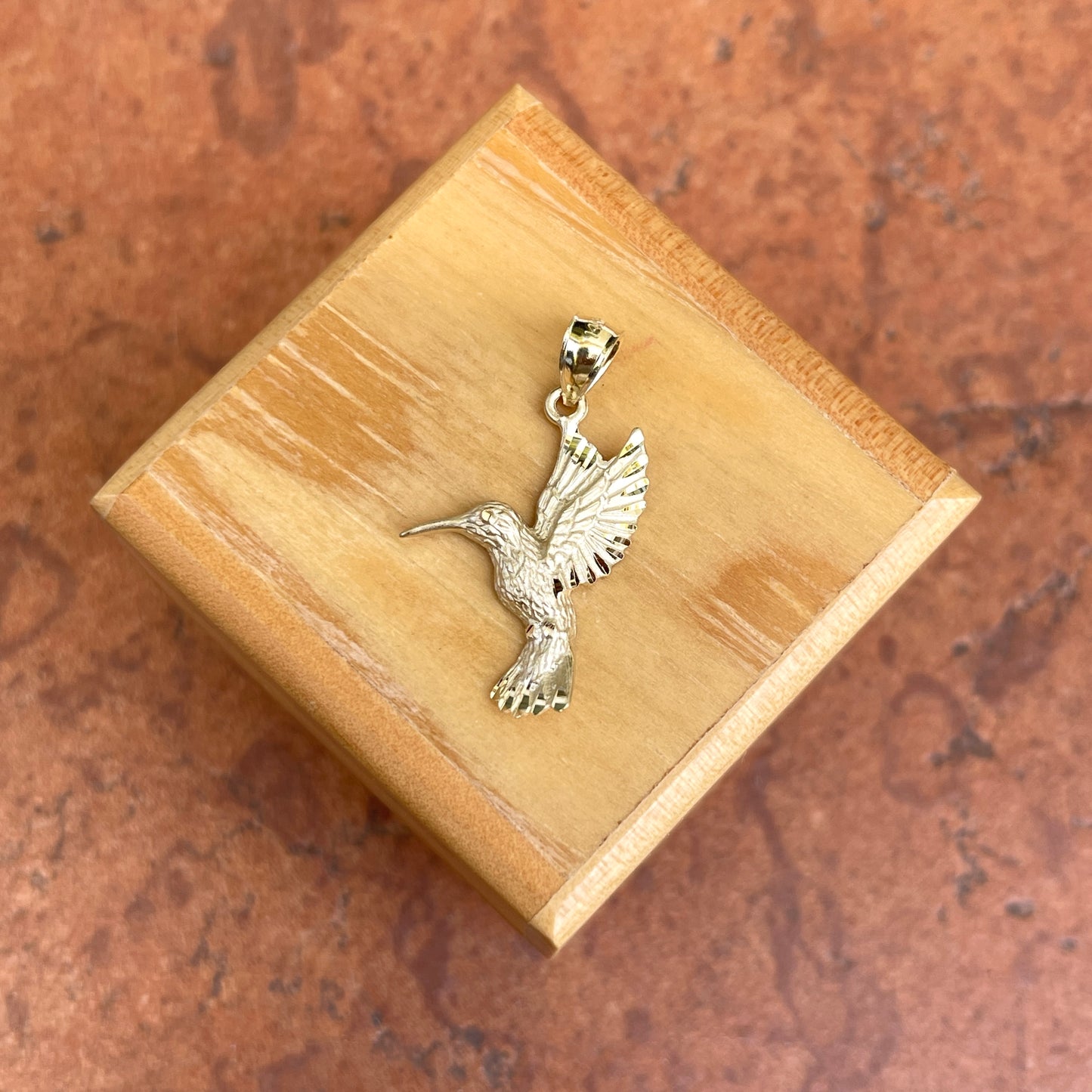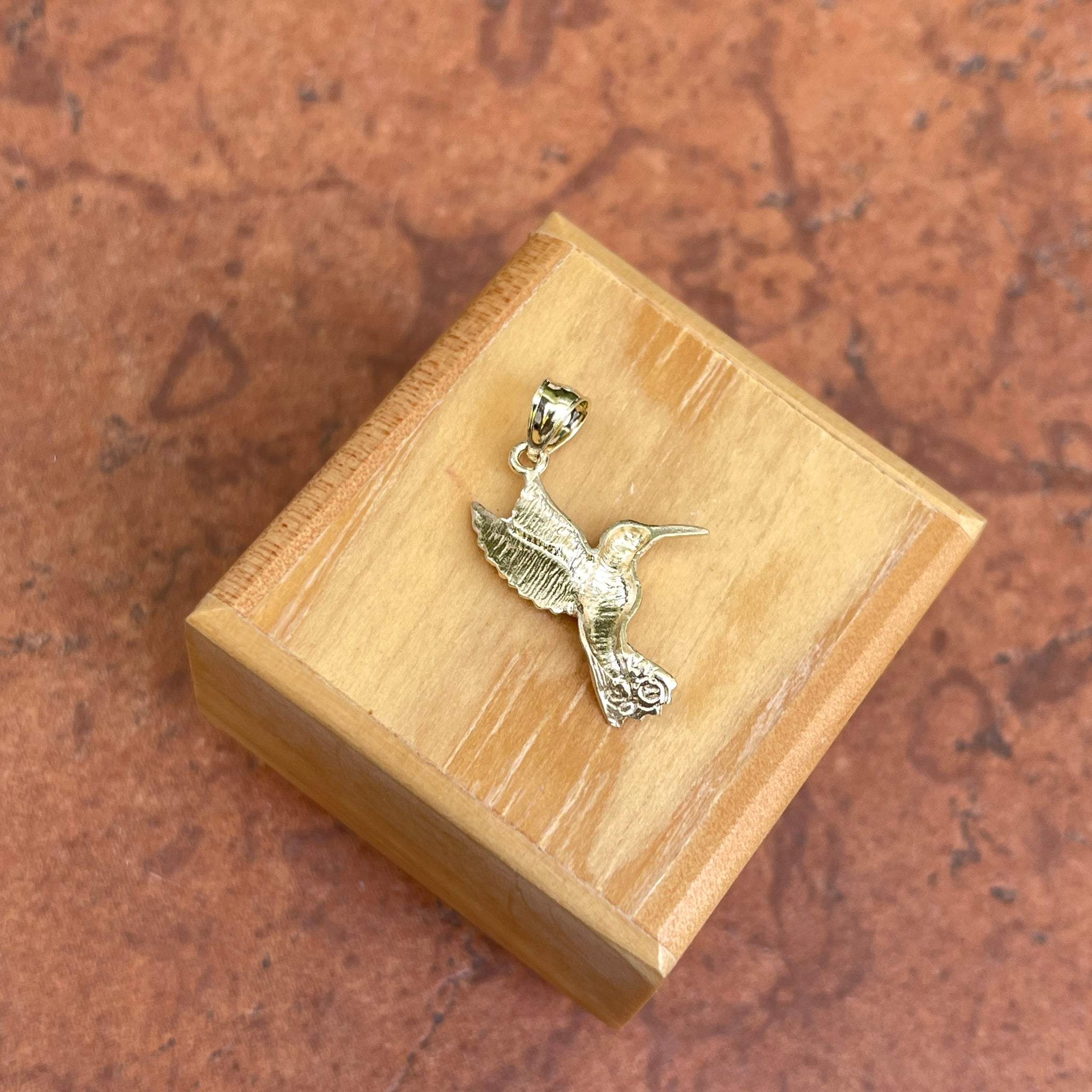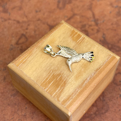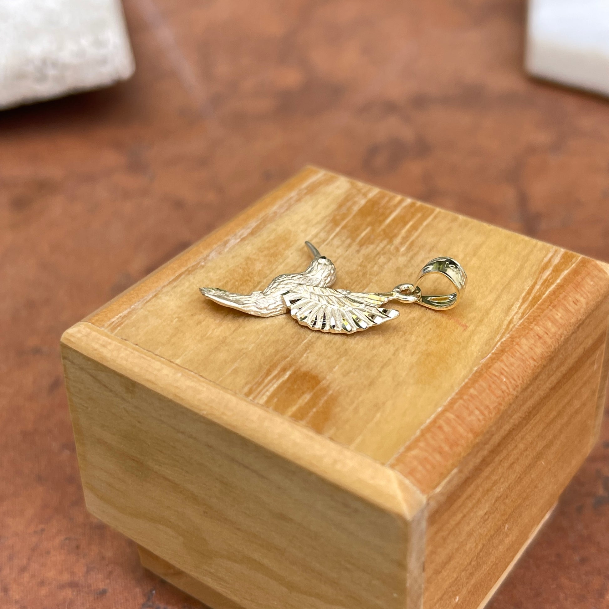 14KT yellow gold flying, diamond-cut detailed hummingbird pendant. An adorable, highly detailed and solid pendant for the hummingbird lover.