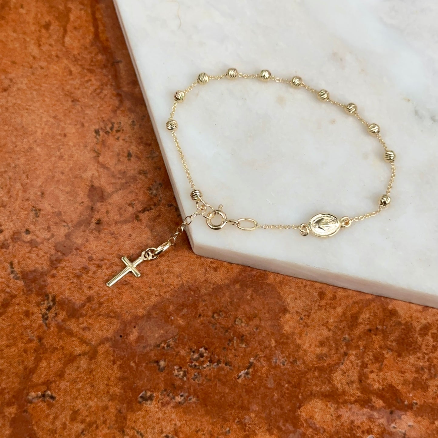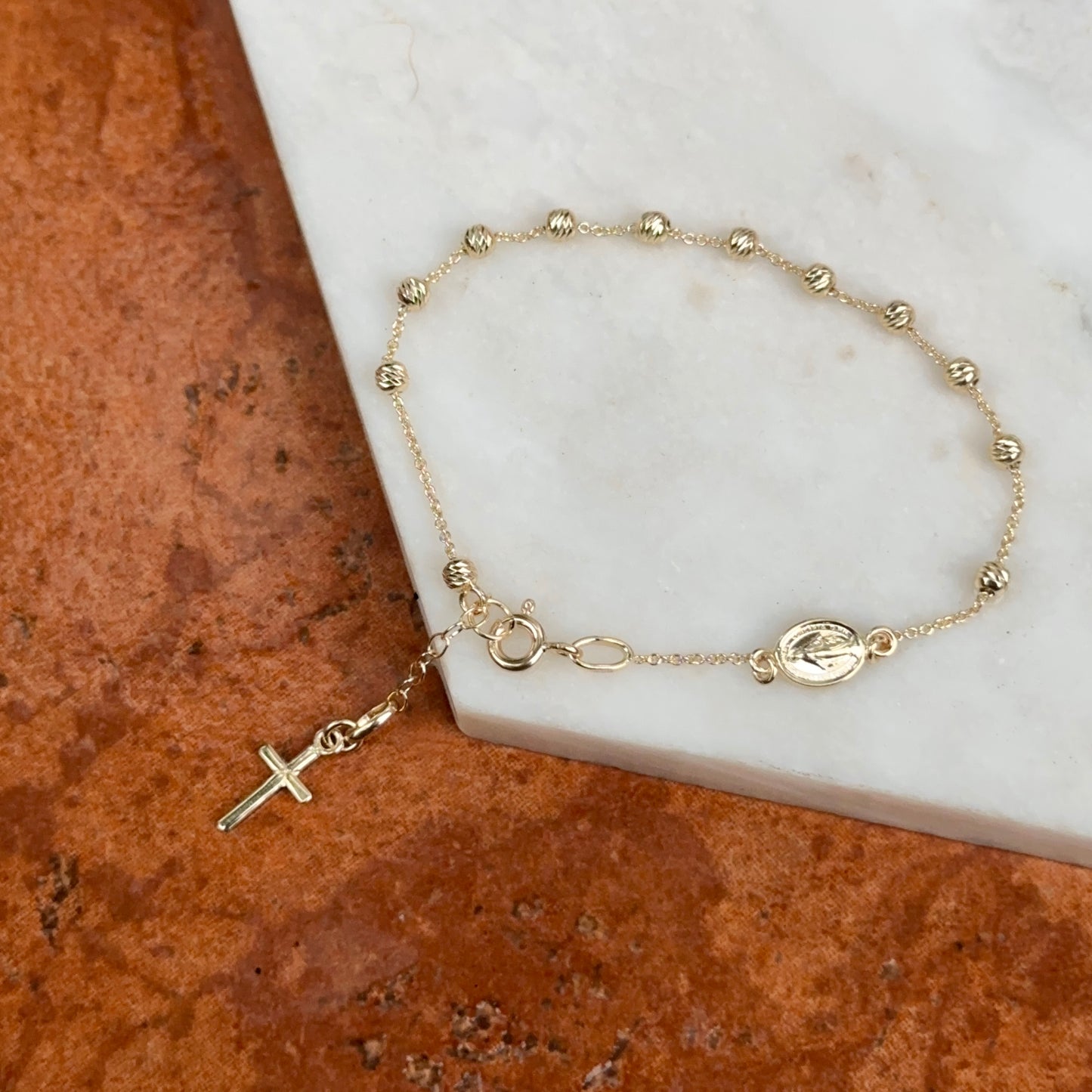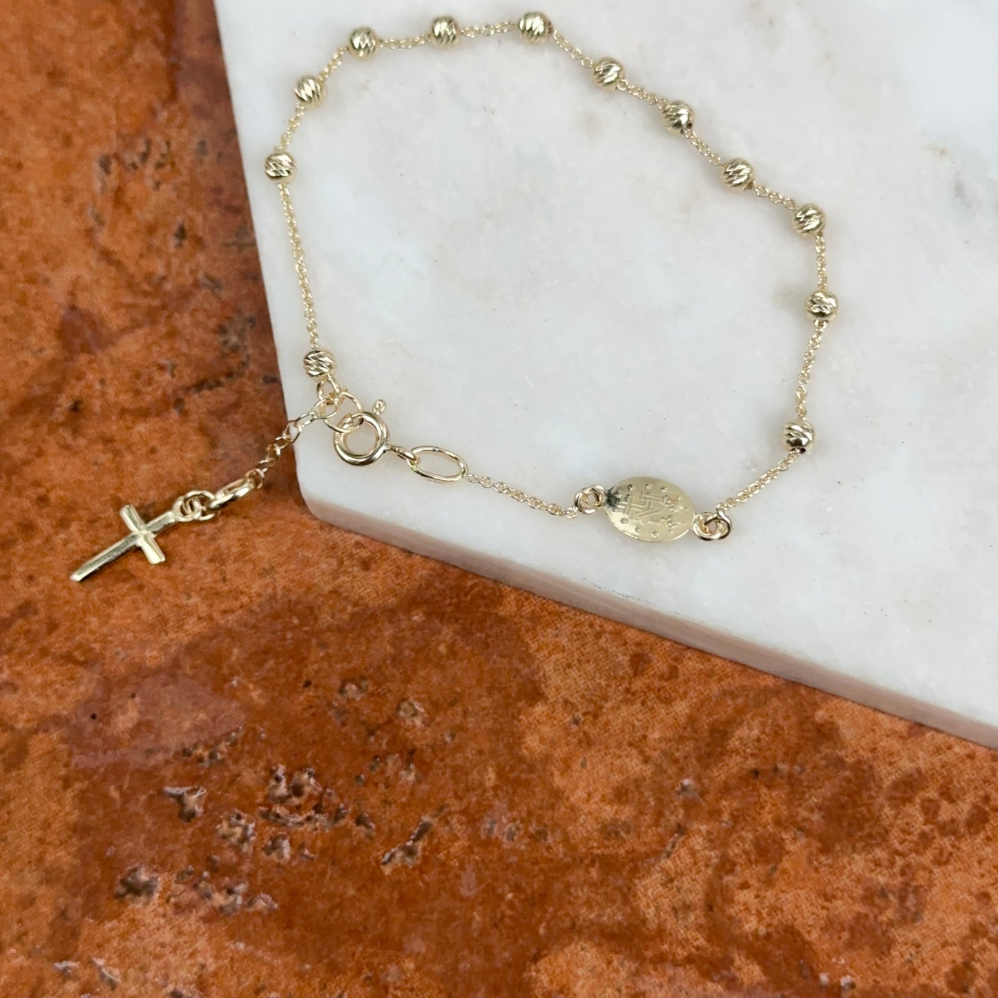 14KT yellow gold chain bracelet with beads, cross charm + Miraculous Medal with diamond-cut detailing. Makes a great gift for 1st communion, holidays, or birthday!