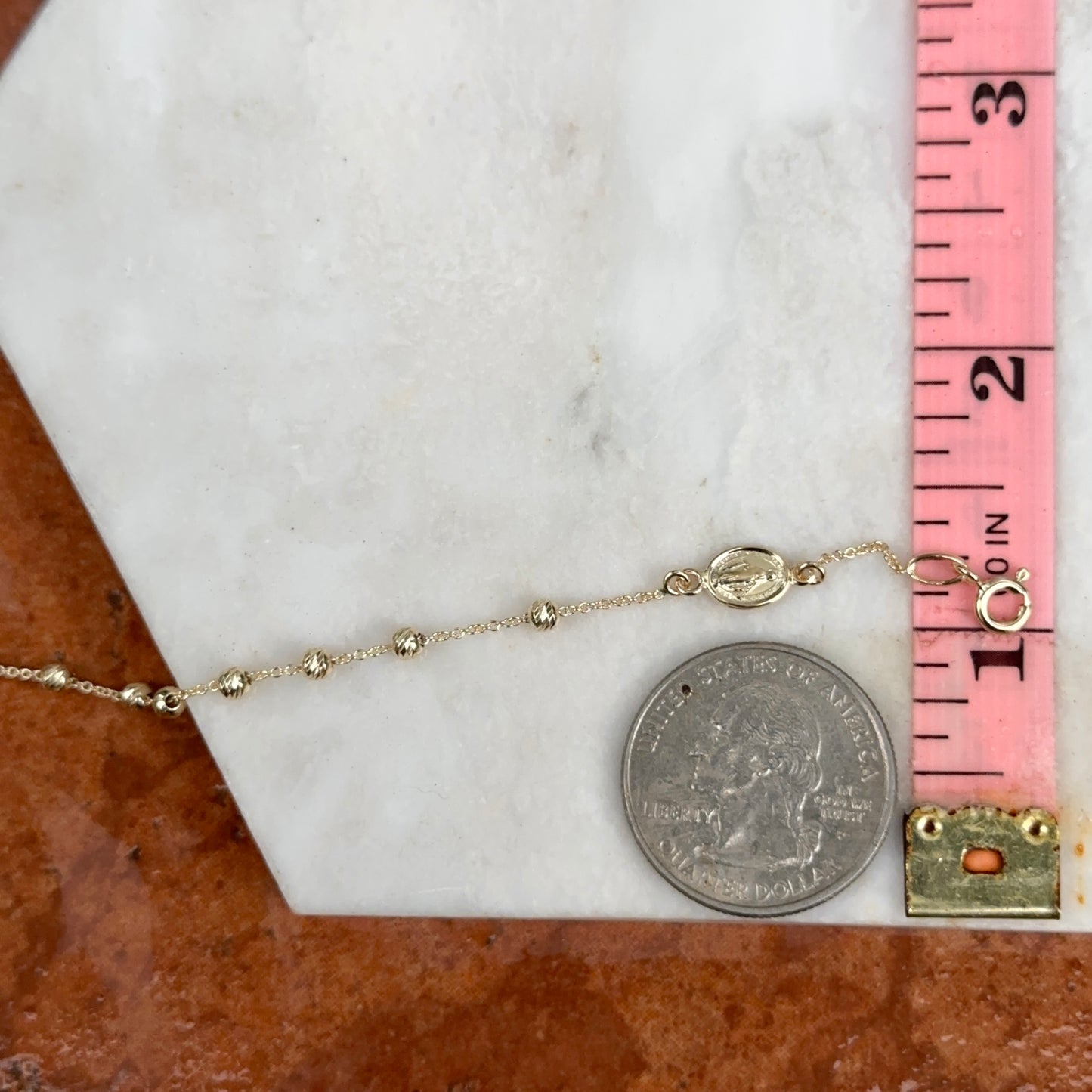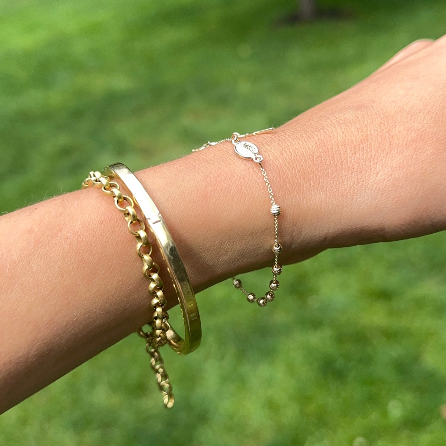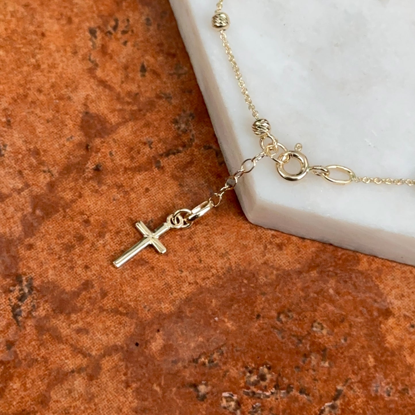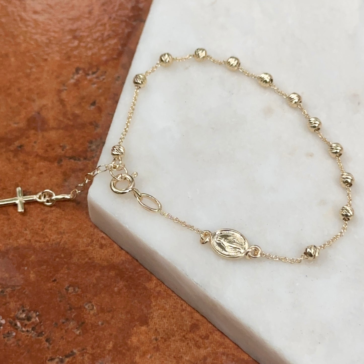 14KT yellow gold chain bracelet with beads, cross charm + Miraculous Medal with diamond-cut detailing. Makes a great gift for 1st communion, holidays, or birthday!
