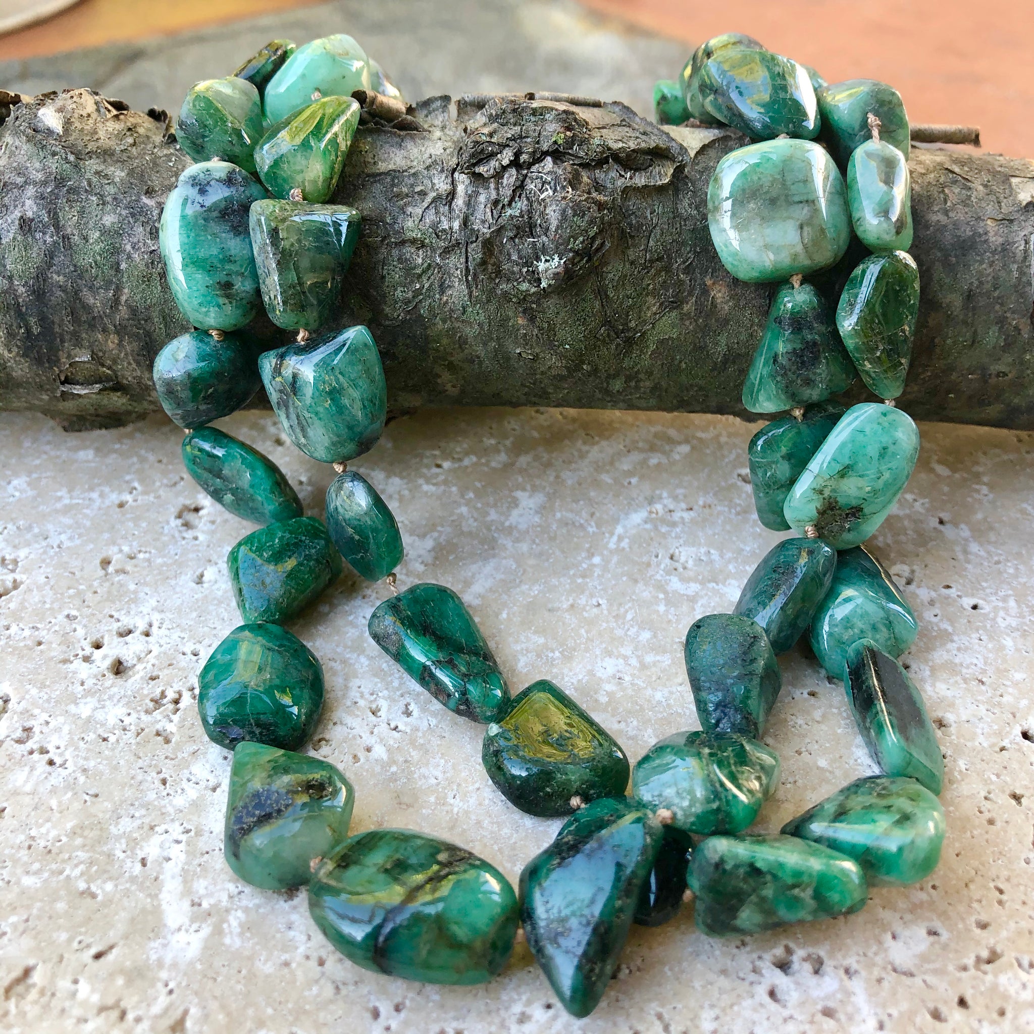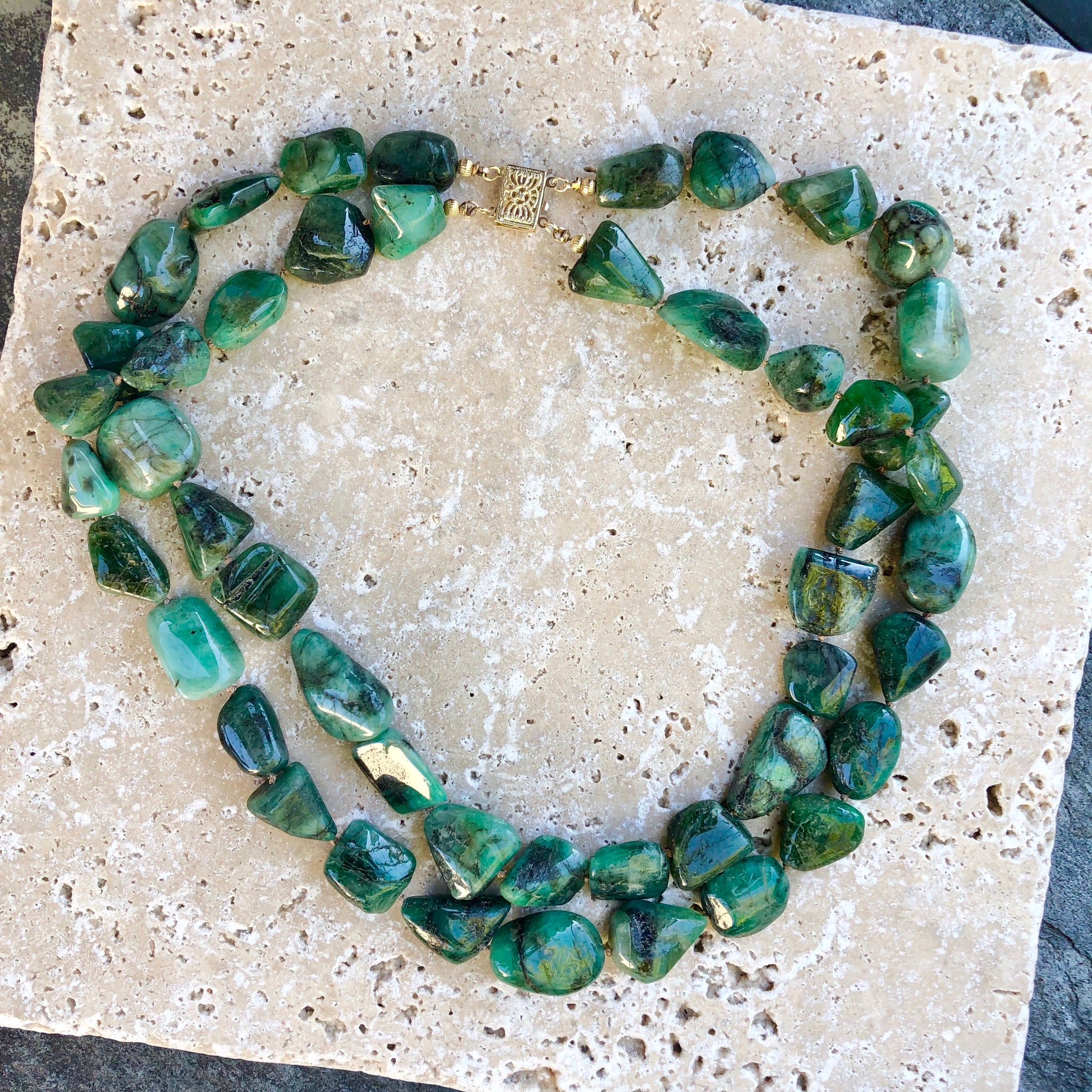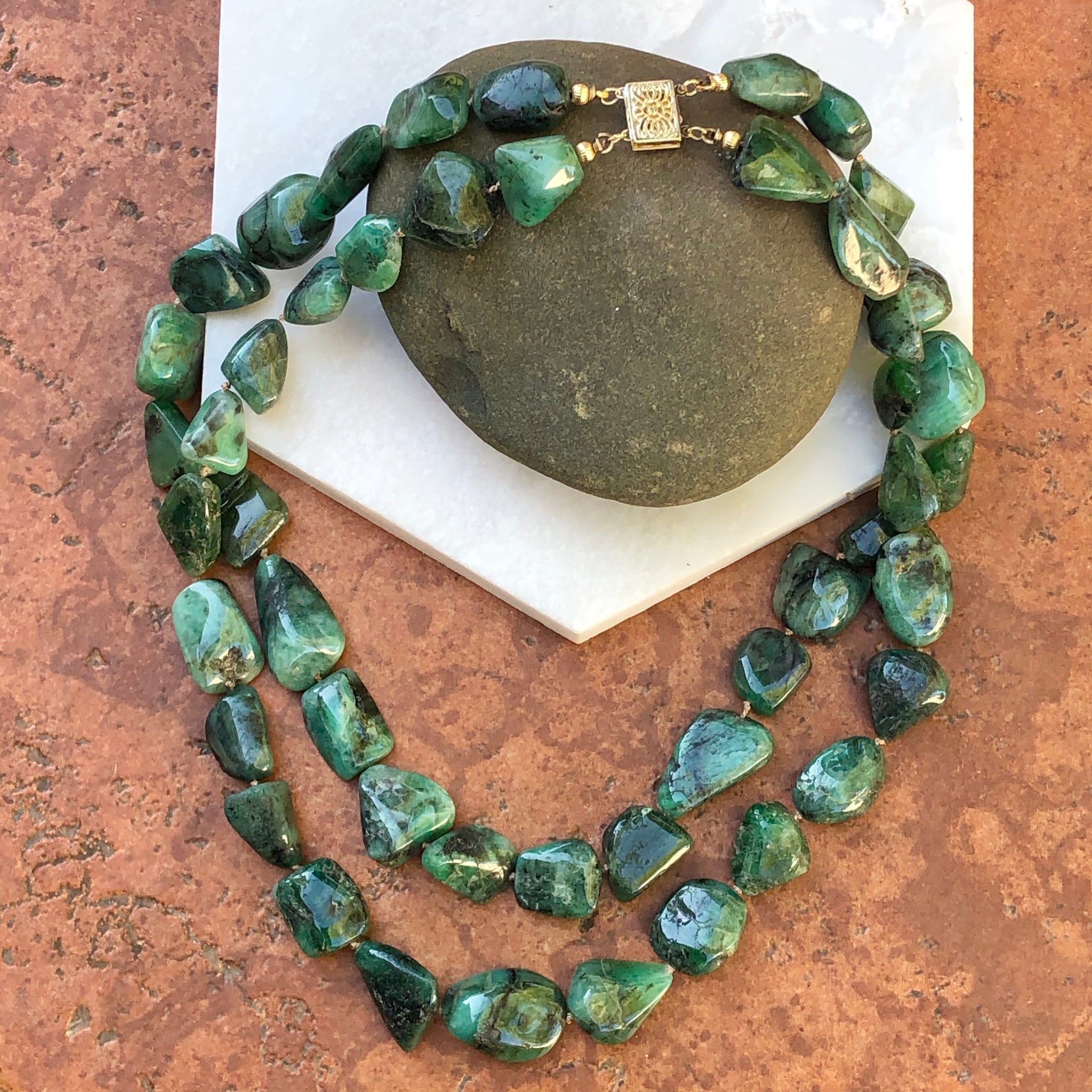 Beautiful green-toned chunky, abstract-shaped emerald link necklace with 14KT yellow gold clasp. A beautifully versatile piece with the option to wear the strands twisted or loose!