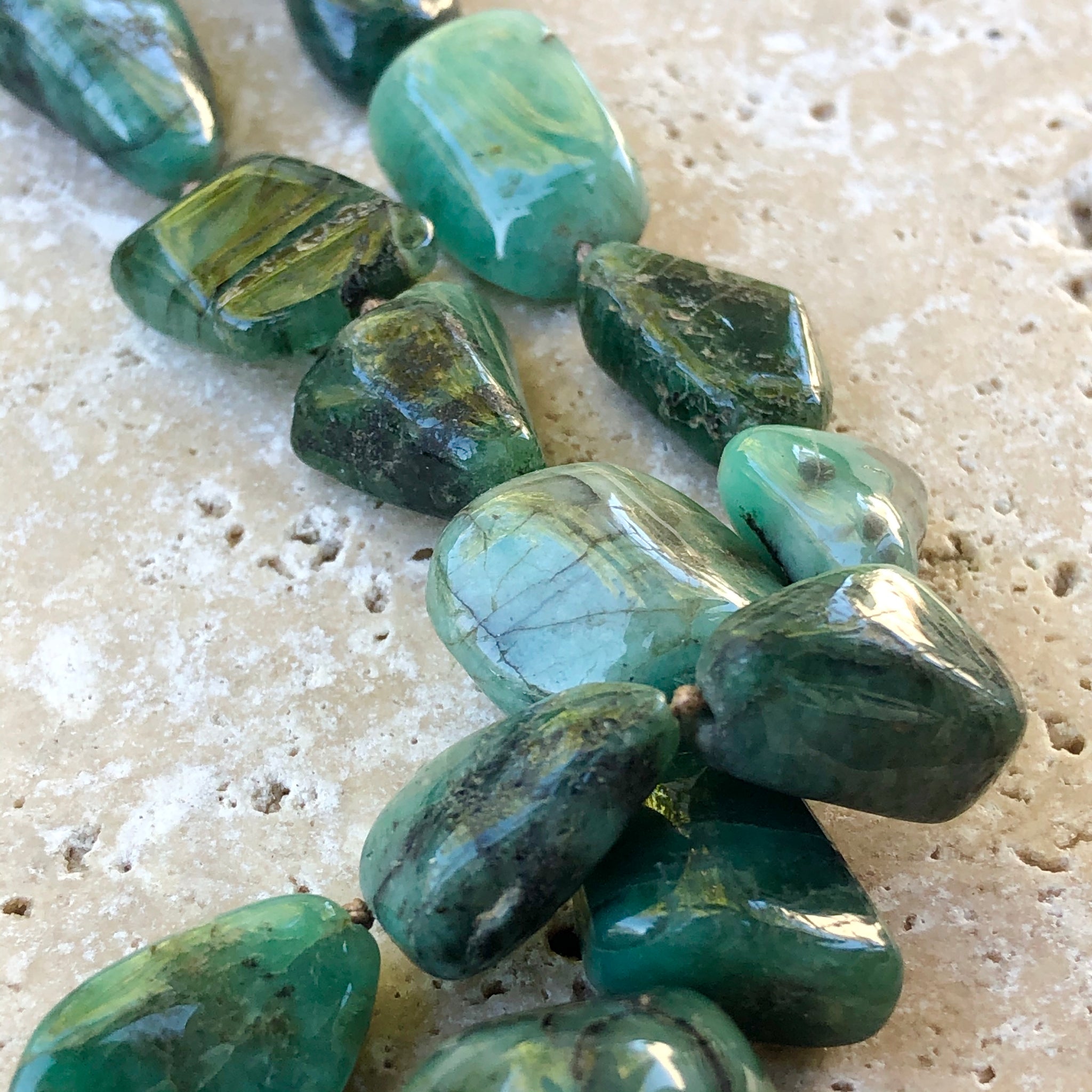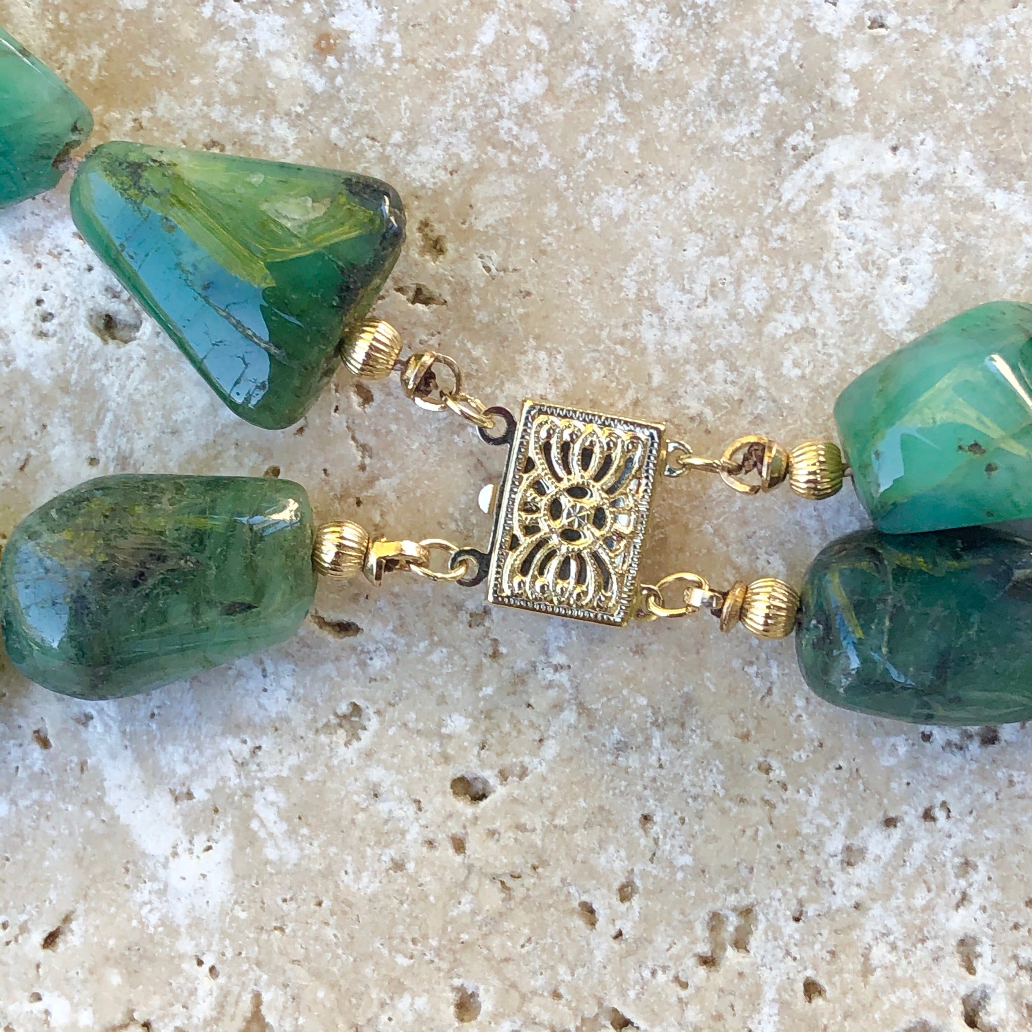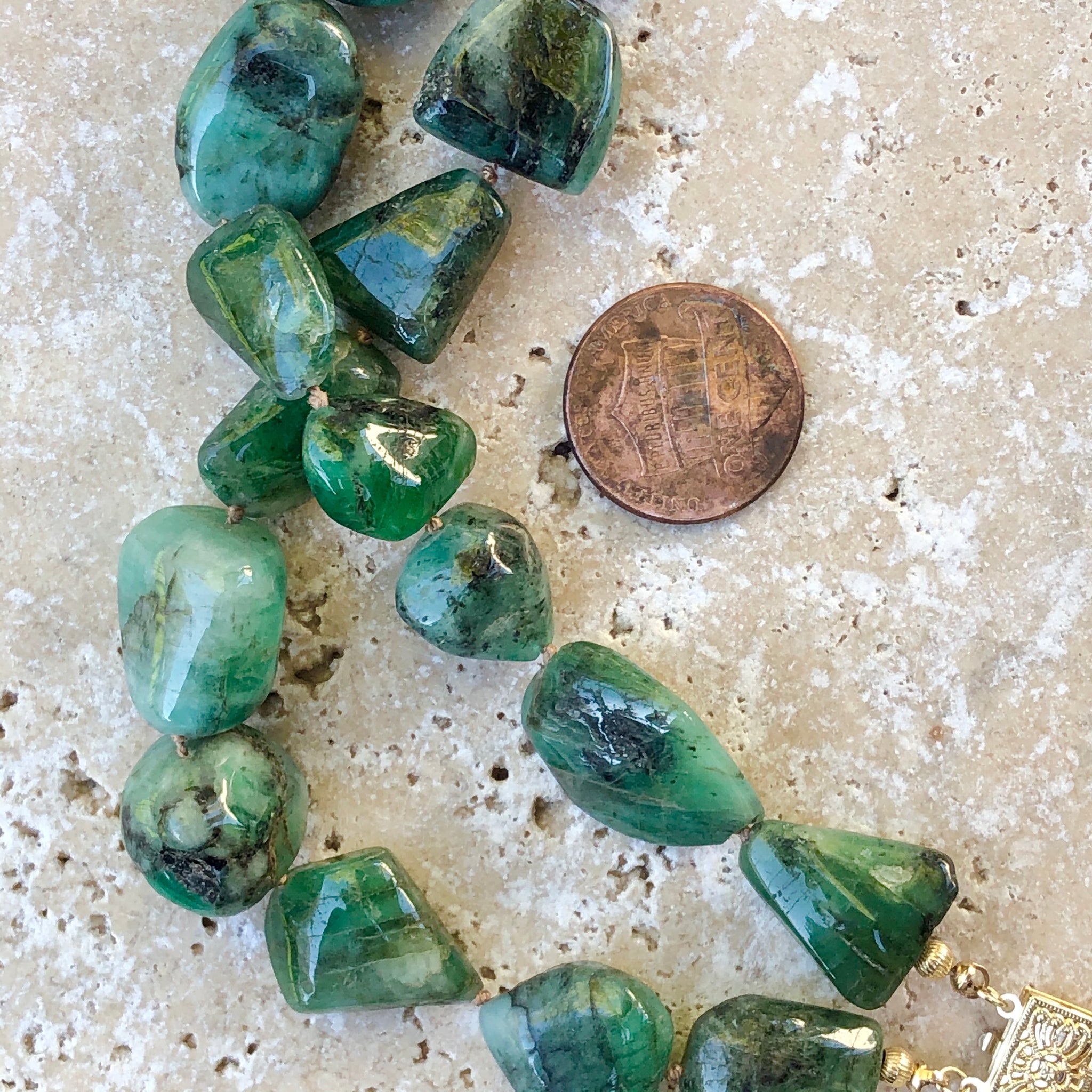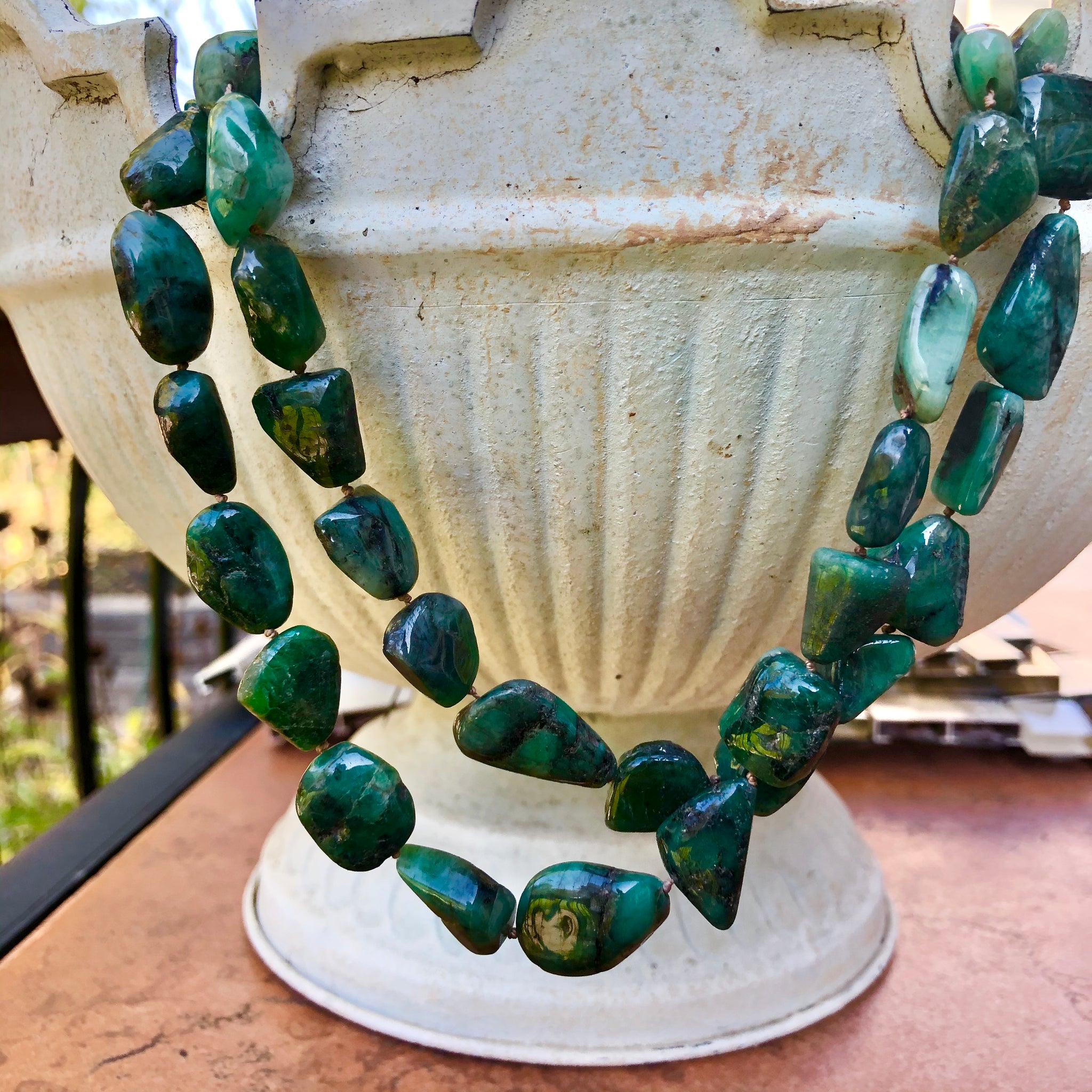 Beautiful green-toned chunky, abstract-shaped emerald link necklace with 14KT yellow gold clasp. A beautifully versatile piece with the option to wear the strands twisted or loose!