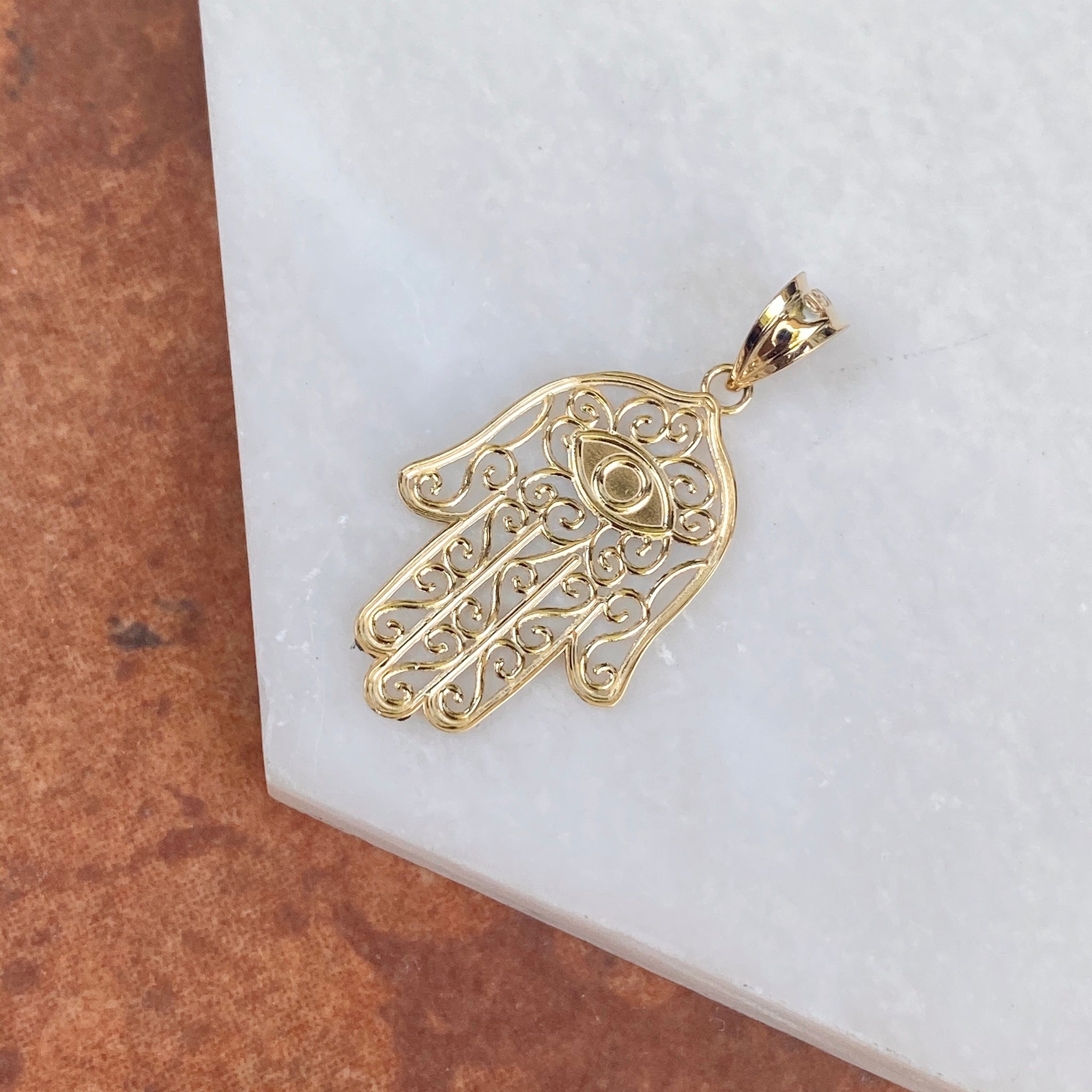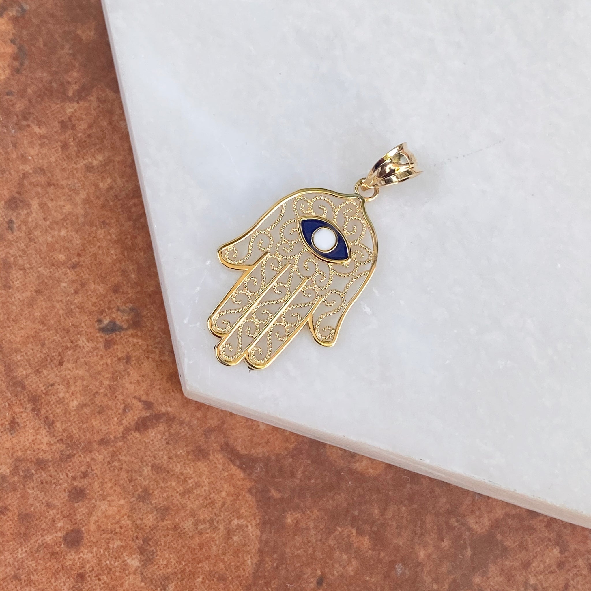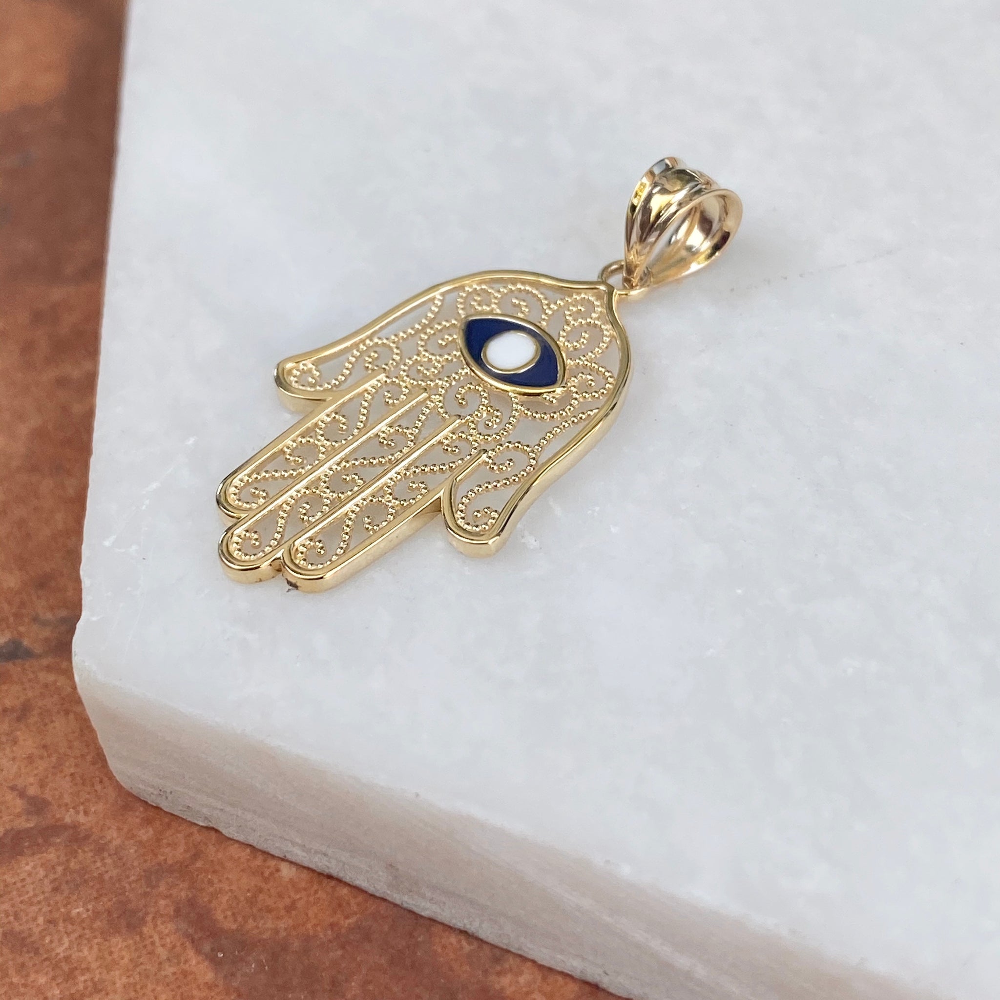 14KT Yellow Gold Filigree + Blue Enamel Evil Eye Hamsa Pendant Charm