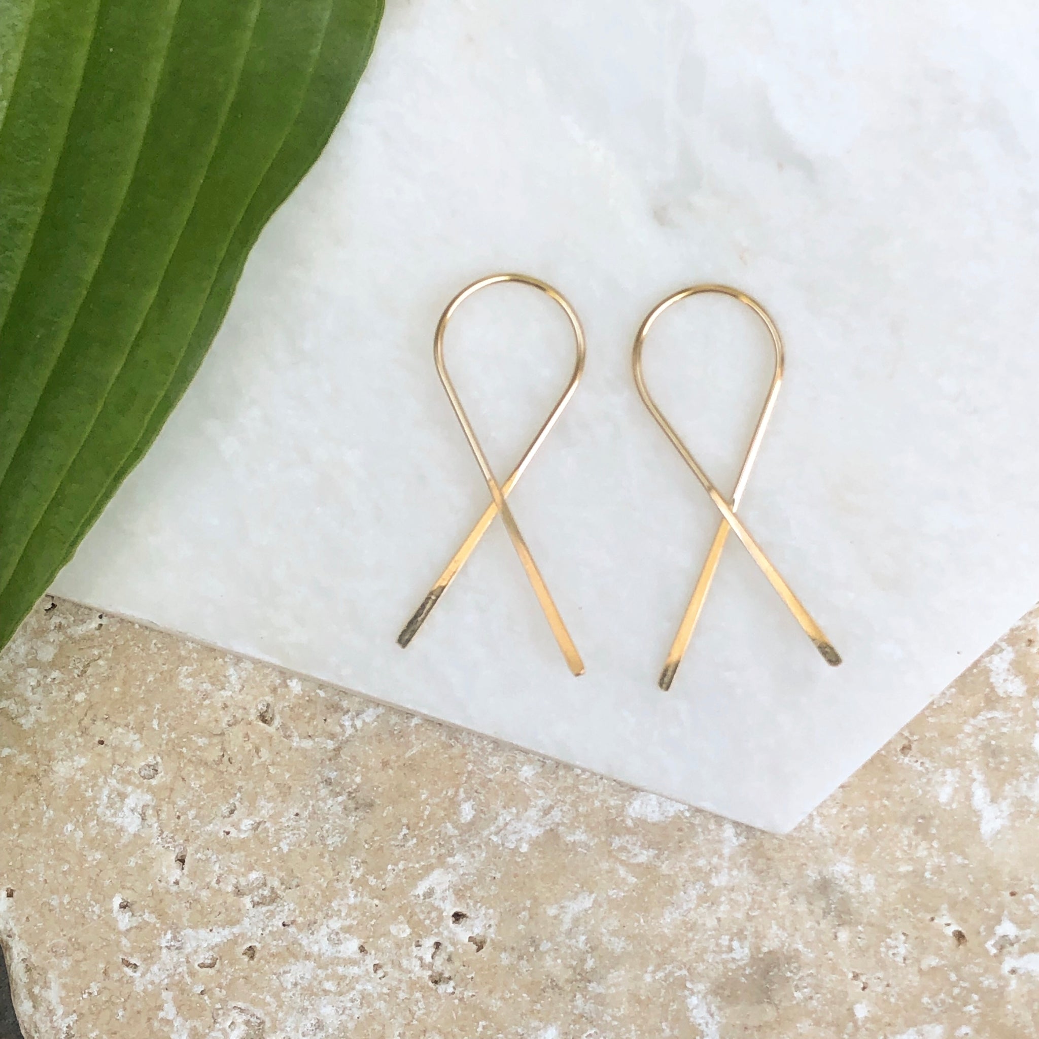 14KT yellow gold filled threader ribbon ear wire threader earrings. Ribbon shape can be used to symbolize an awareness ribbon.
