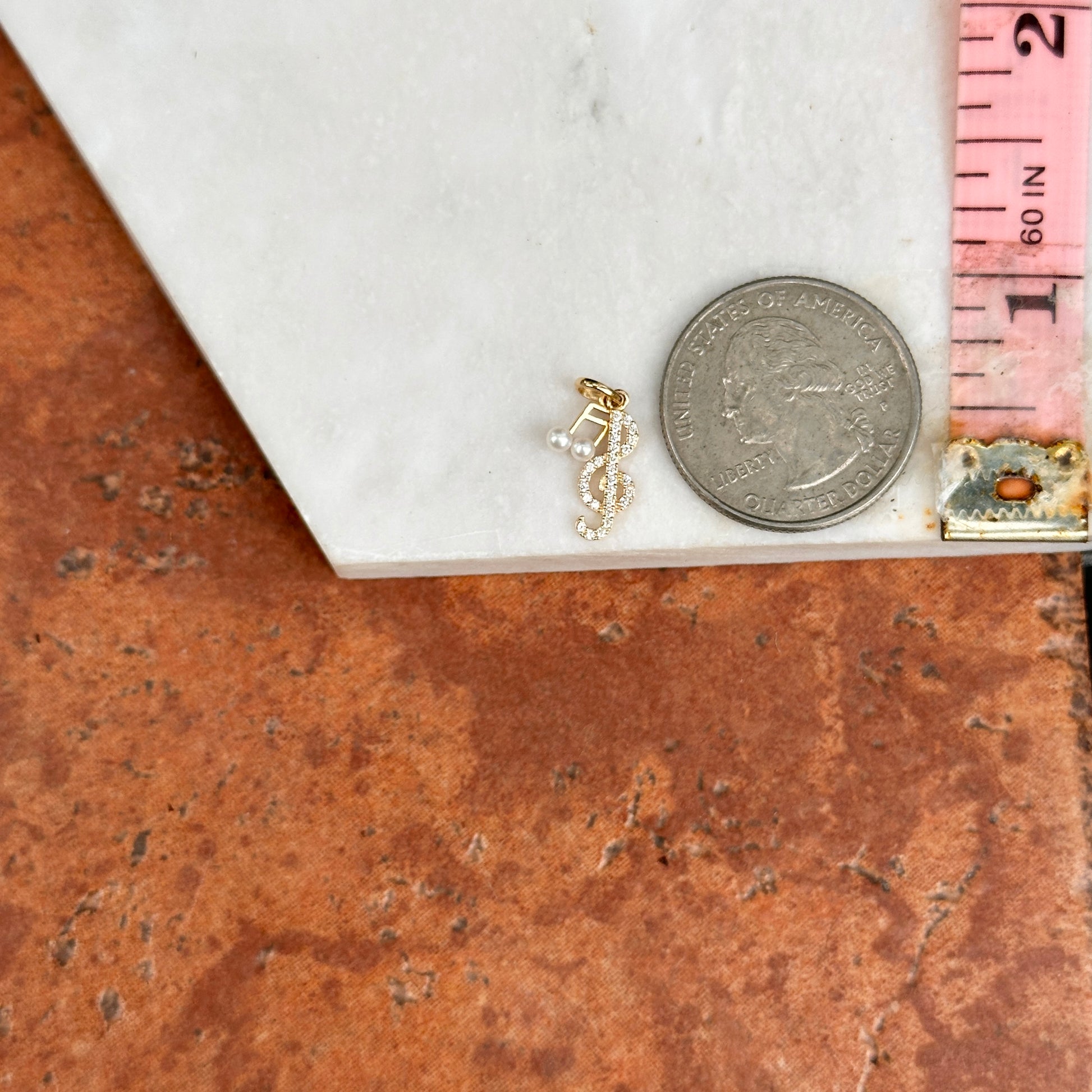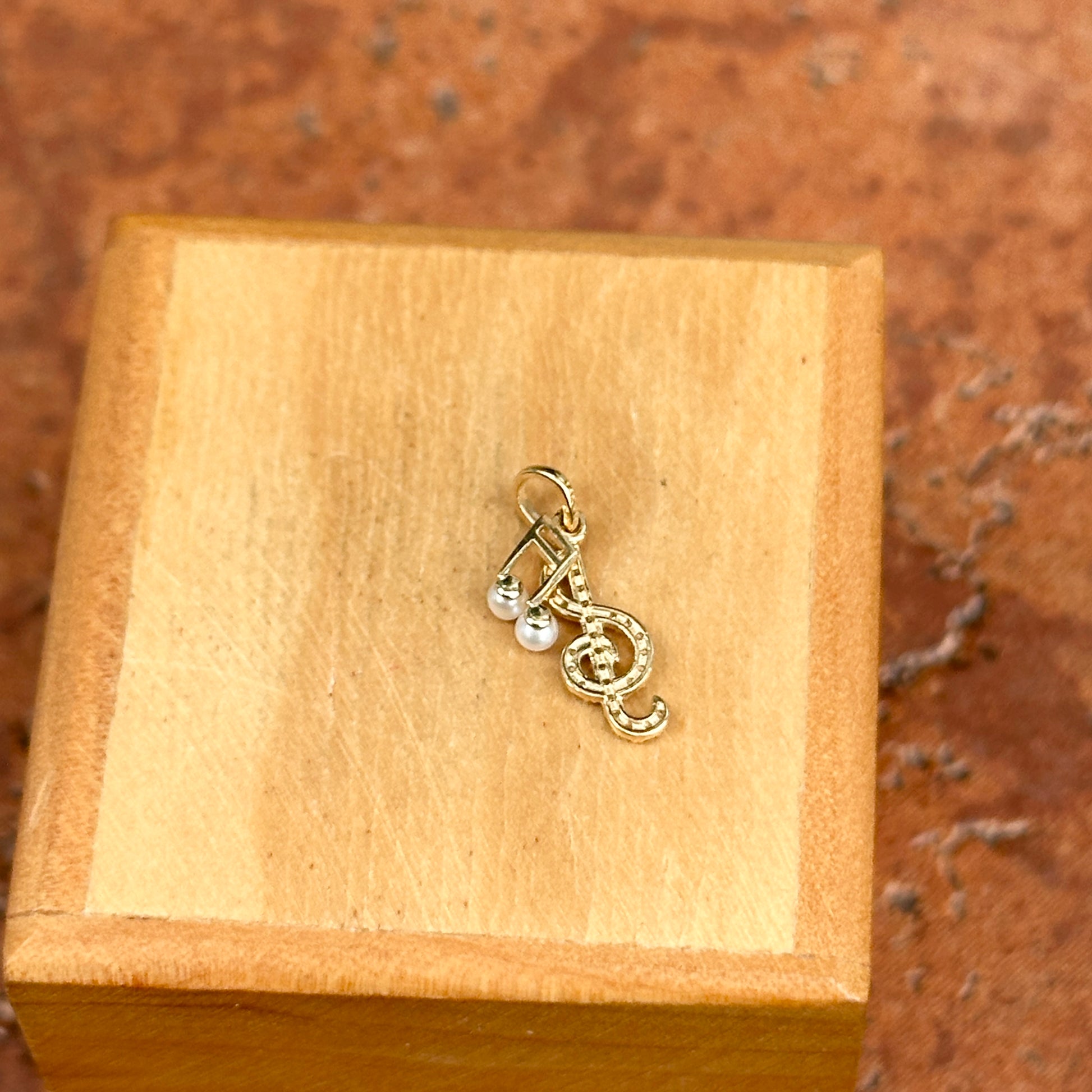 14KT Yellow Gold Freshwater Cultured Pearl Music Note + CZ Treble Clef Charm Pendant
