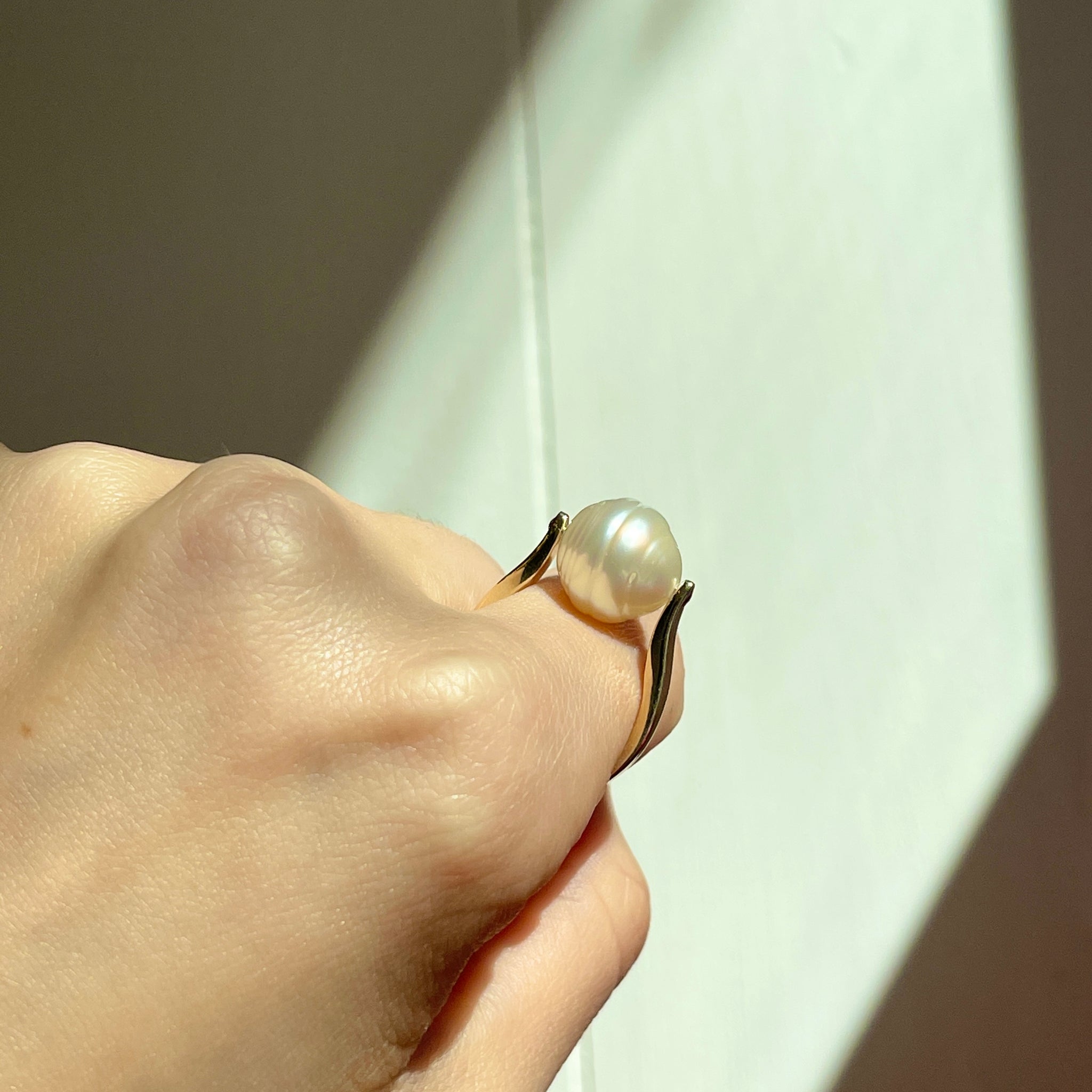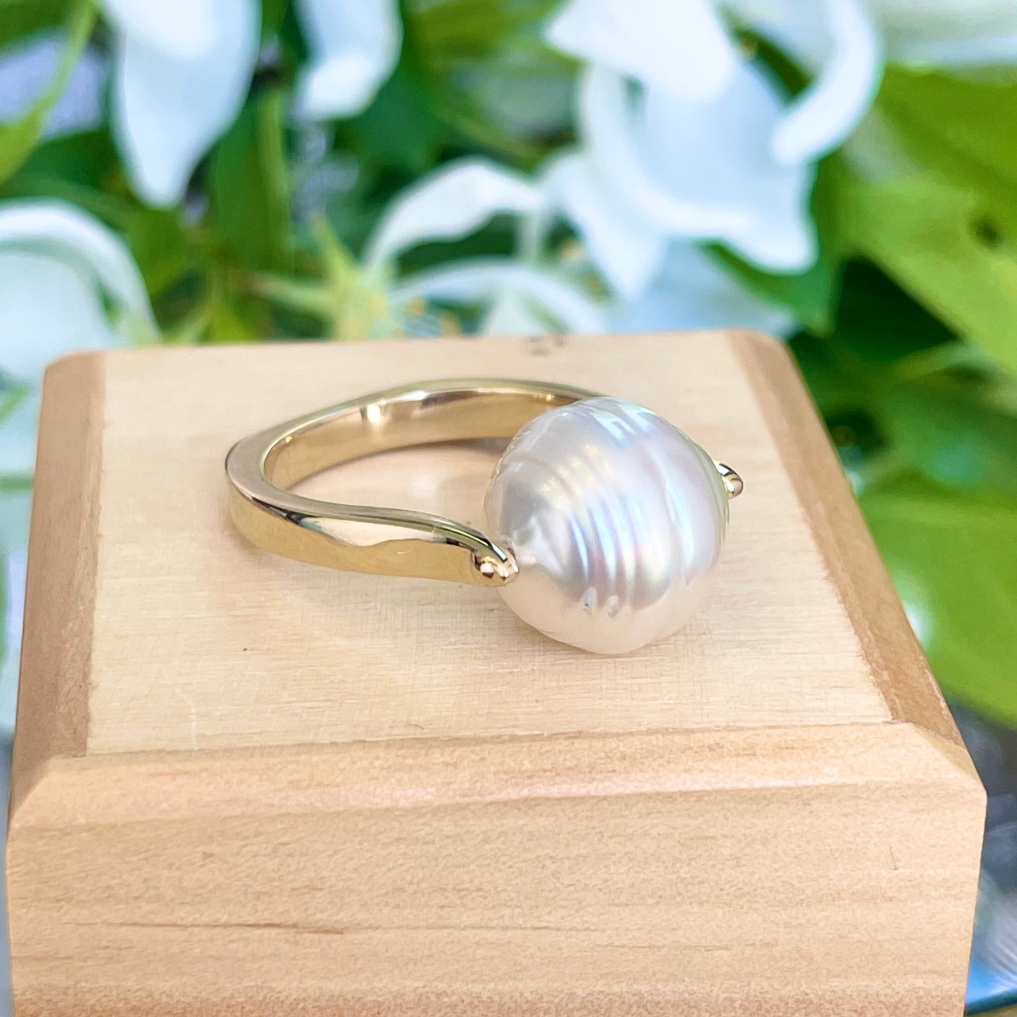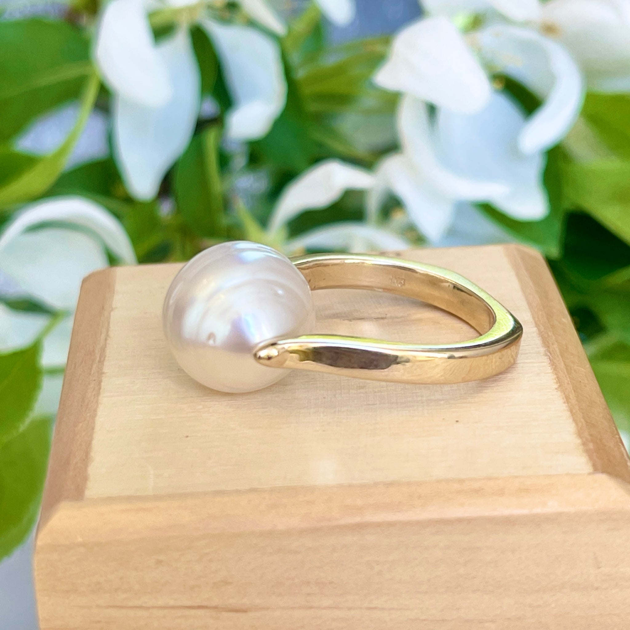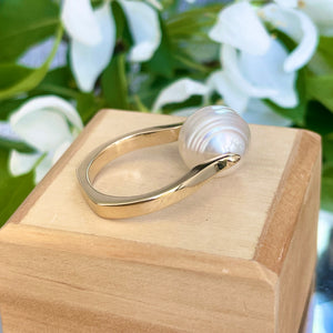 14KT yellow gold + genuine, white Paspaley South Sea Pearl unique design ring. "Fashion" quality Paspaley Pearl. Paspaley Pearls are considered to be the finest South Sea pearls available.