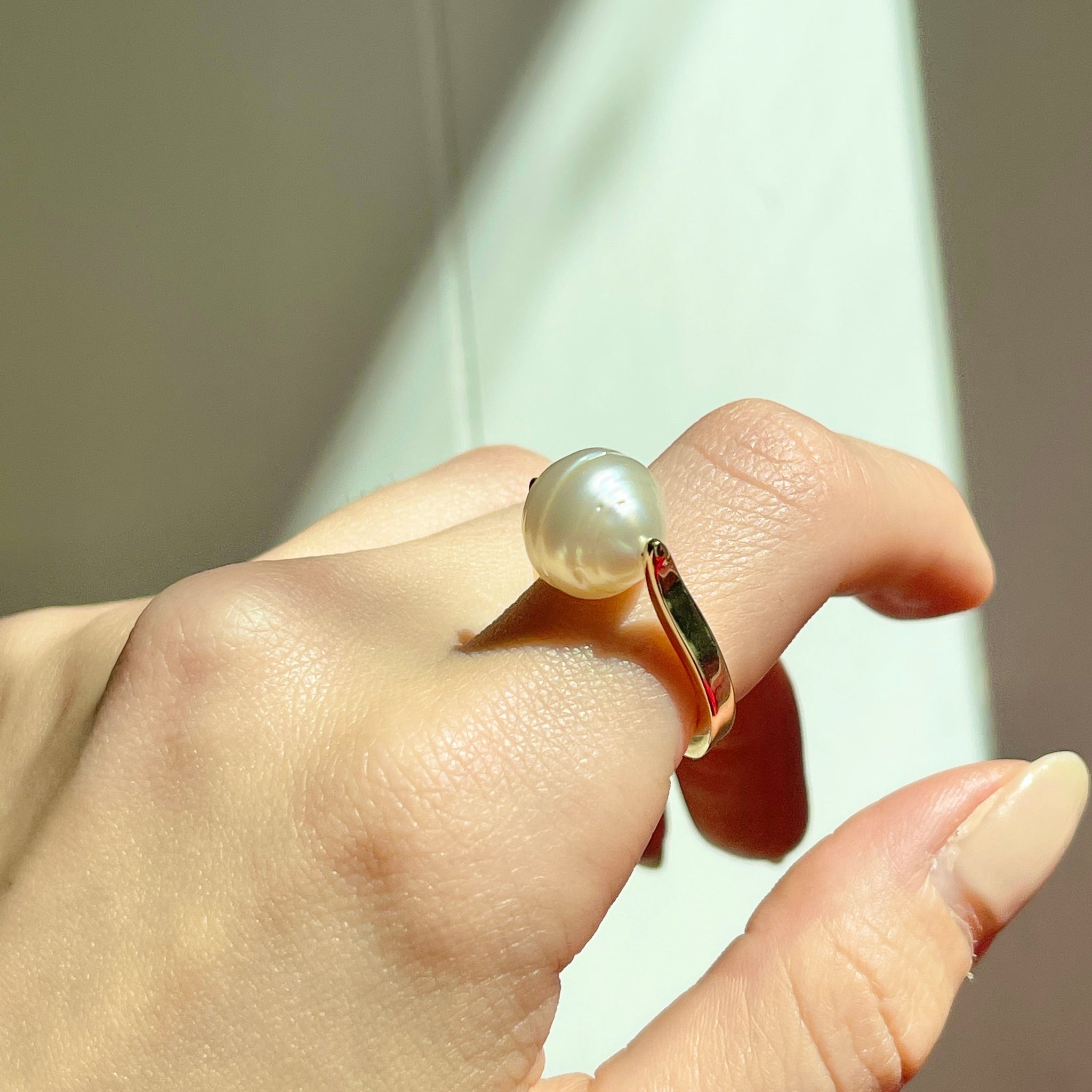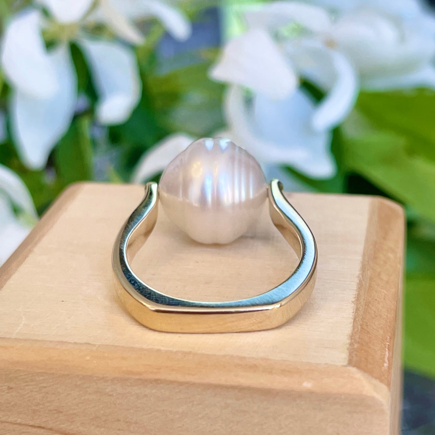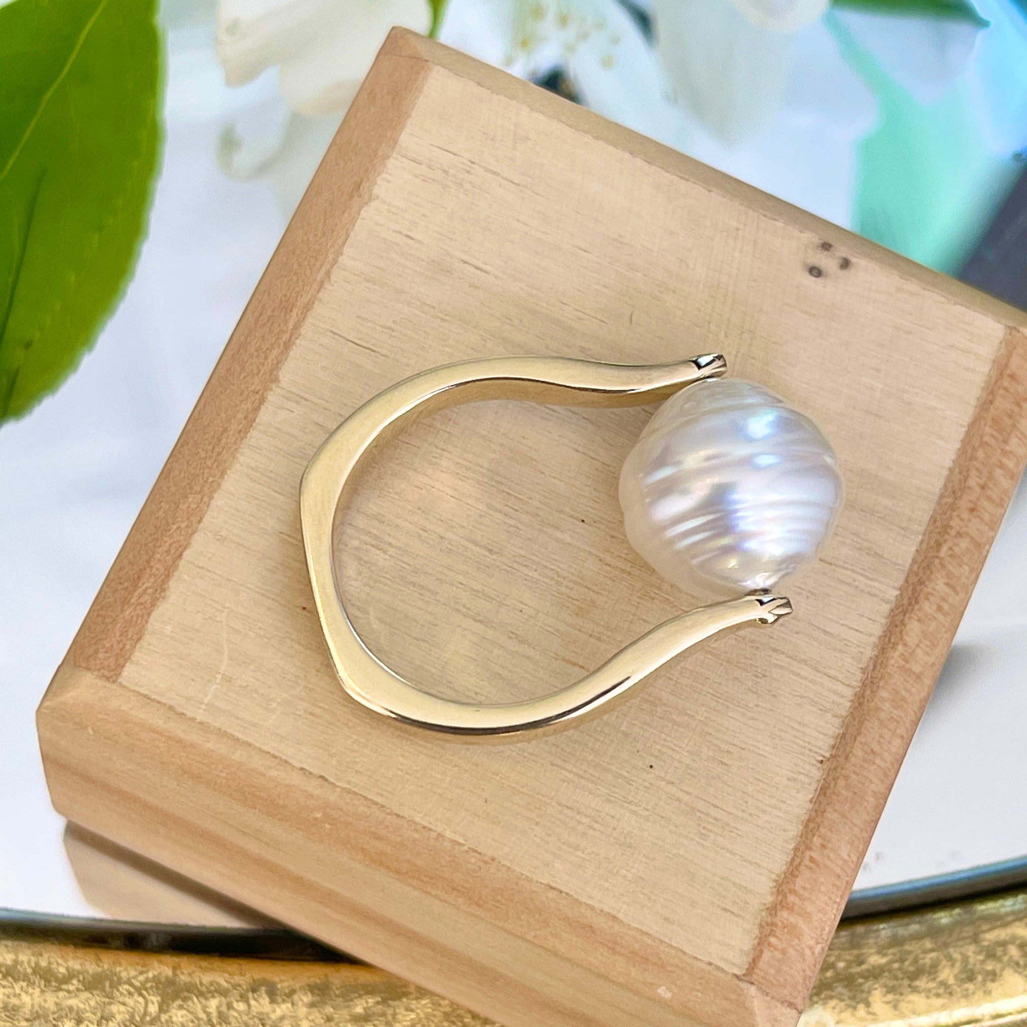 14KT yellow gold + genuine, white Paspaley South Sea Pearl unique design ring. "Fashion" quality Paspaley Pearl. Paspaley Pearls are considered to be the finest South Sea pearls available.