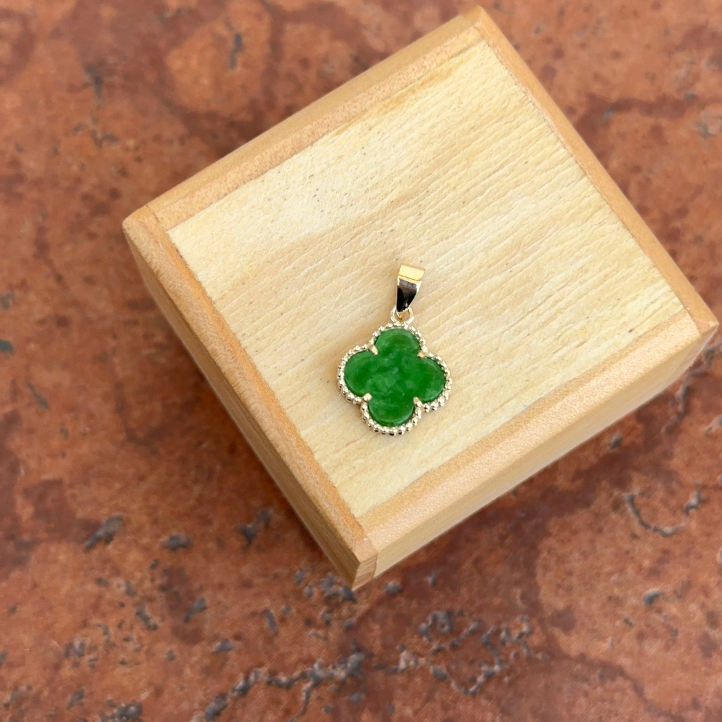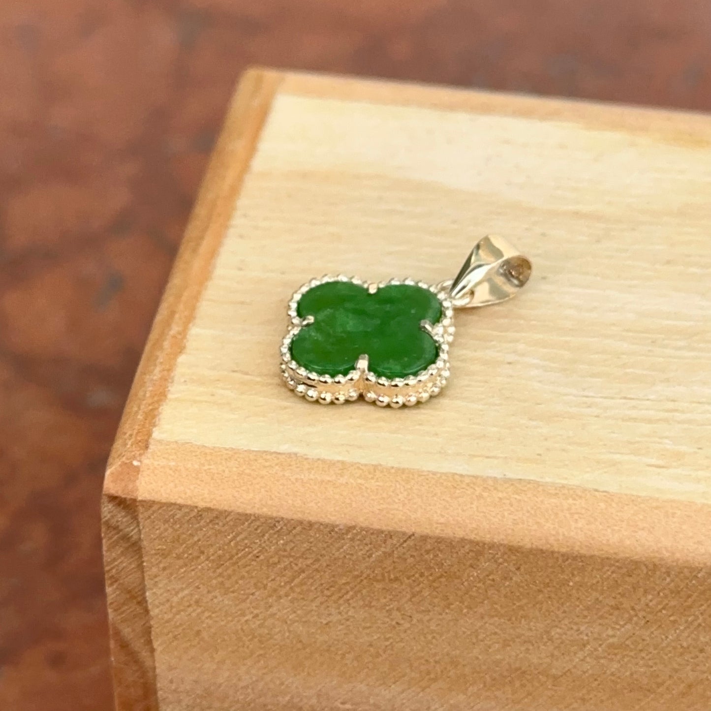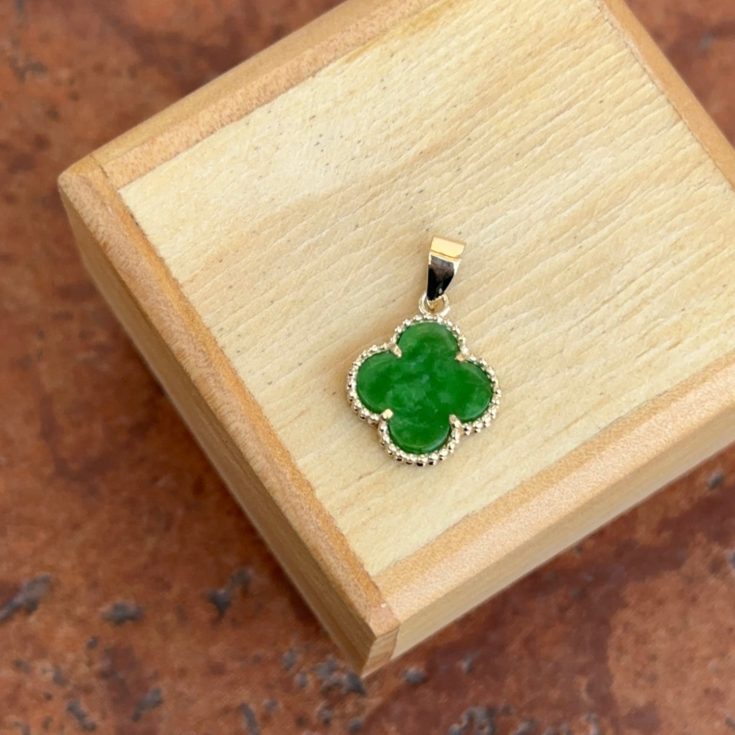 14K yellow gold dyed green jade, Irish, lucky, 4-leaf clover charm pendant with beaded edge detailing.