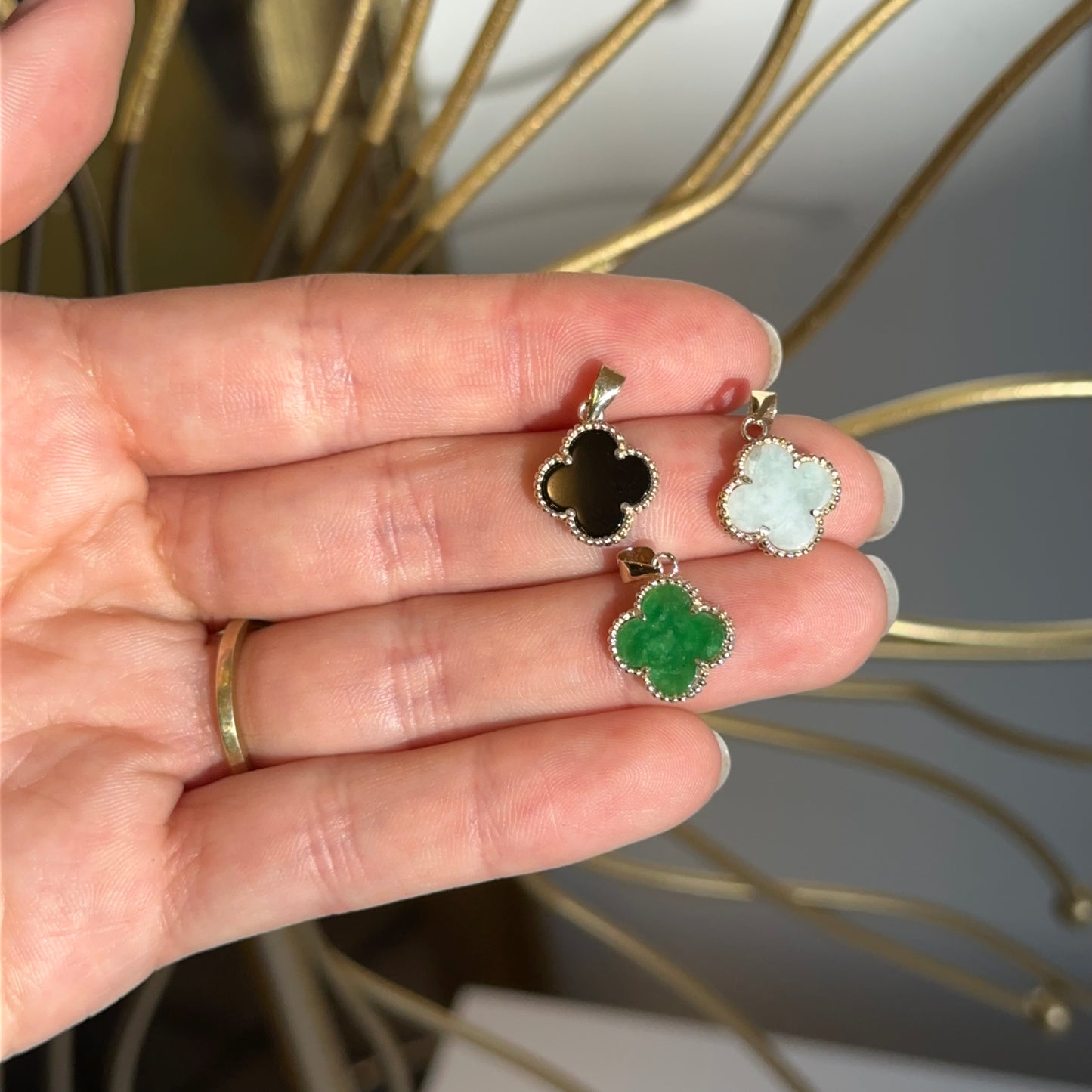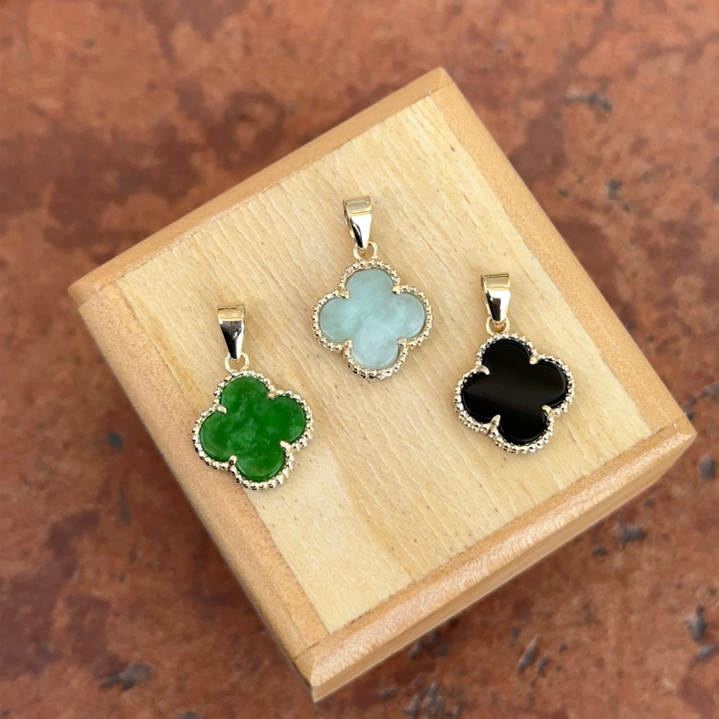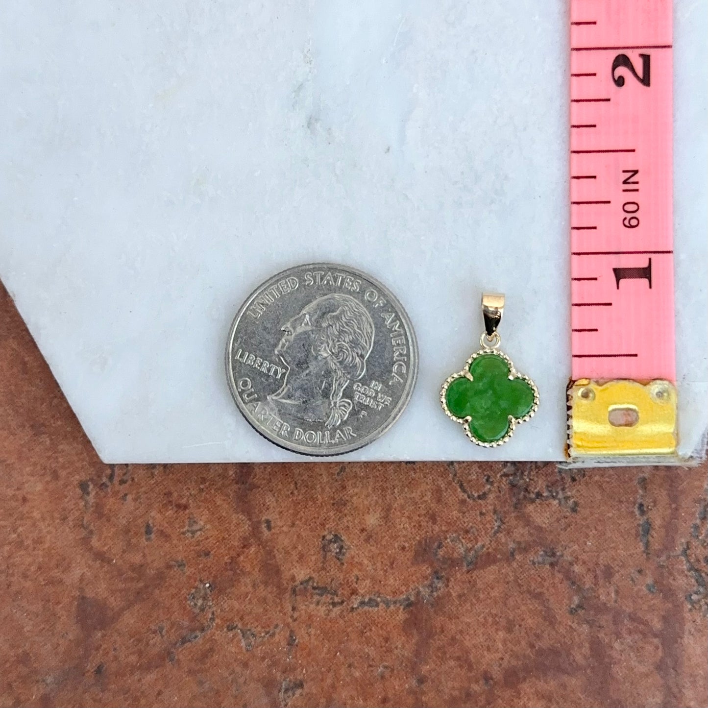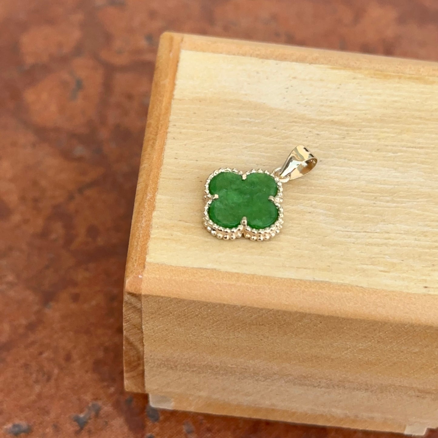 14K yellow gold dyed green jade, Irish, lucky, 4-leaf clover charm pendant with beaded edge detailing.