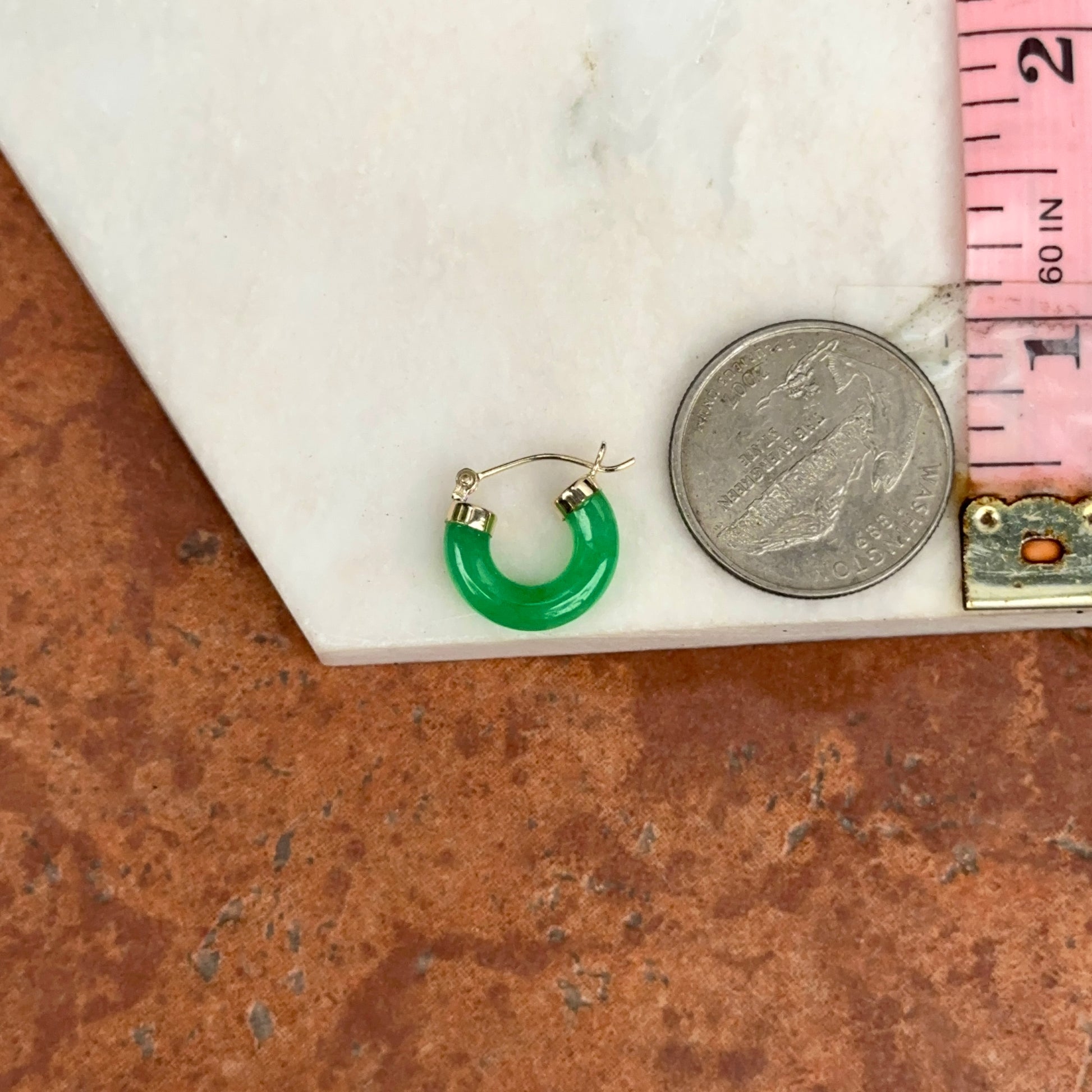 14KT Yellow Gold Green Jade Tube Hoop Earrings 15mm