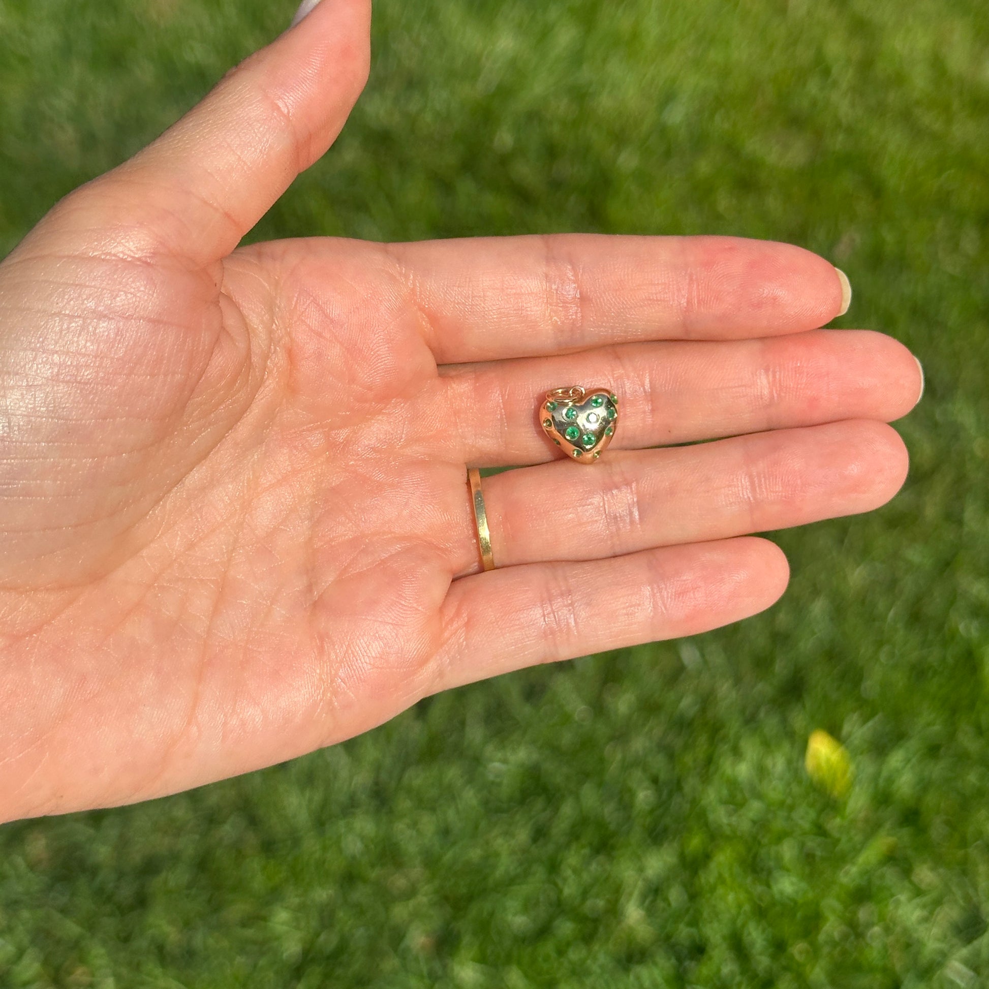 14K yellow gold puffed heart pendant charm with gypsy-set, genuine emeralds on the front and a flat, open gallery back side to allow light to pass through the gemstones and bring on more sparkle!
