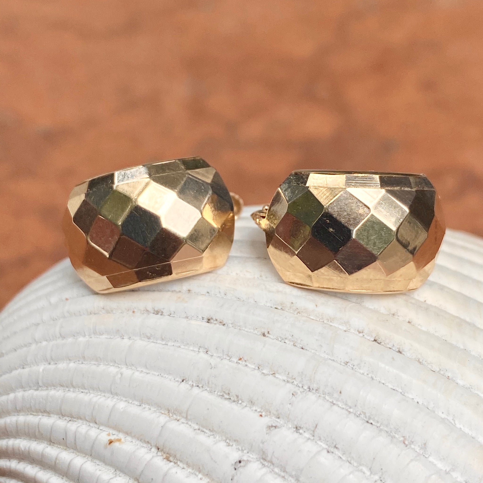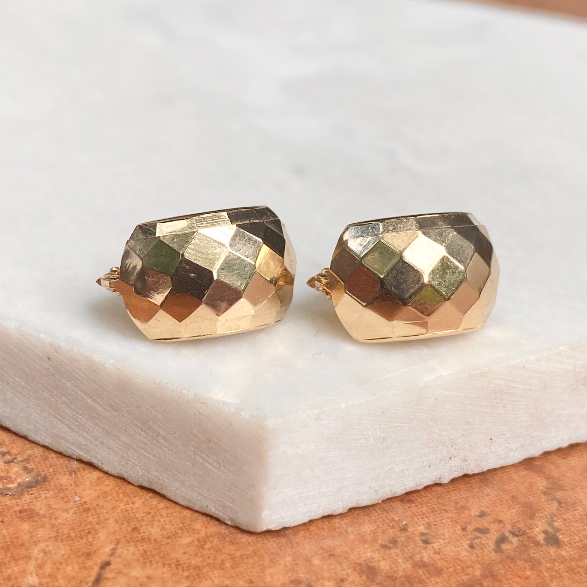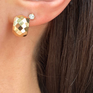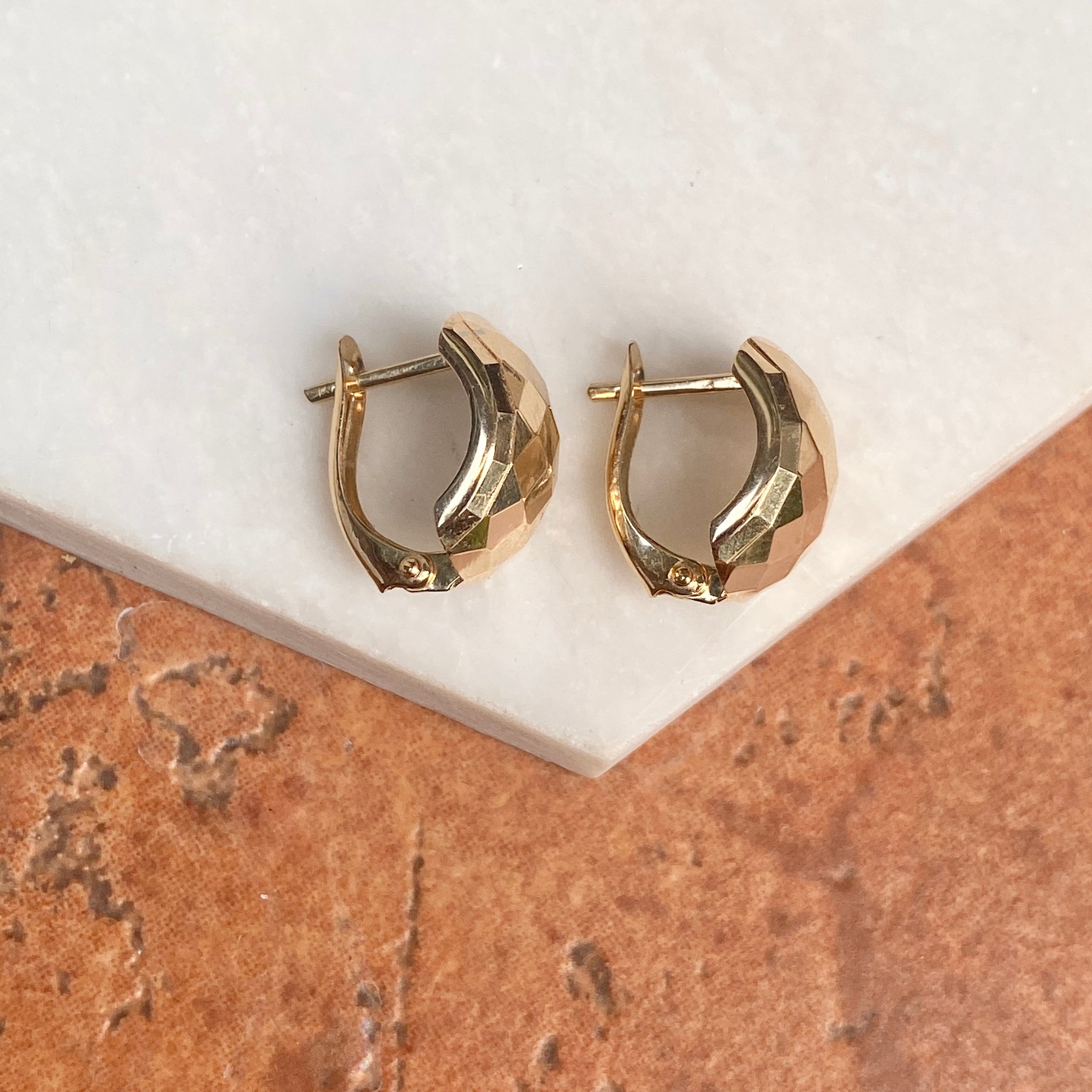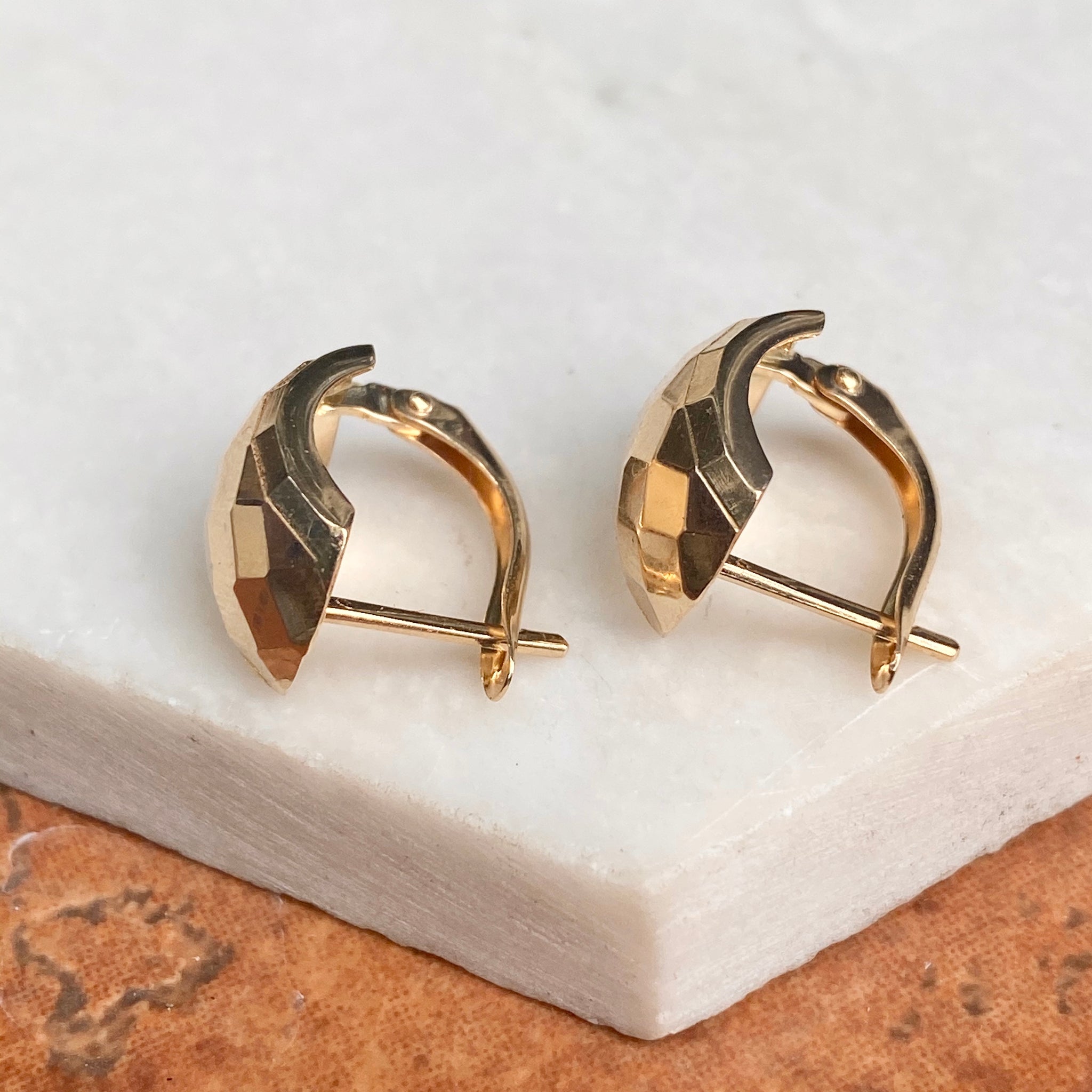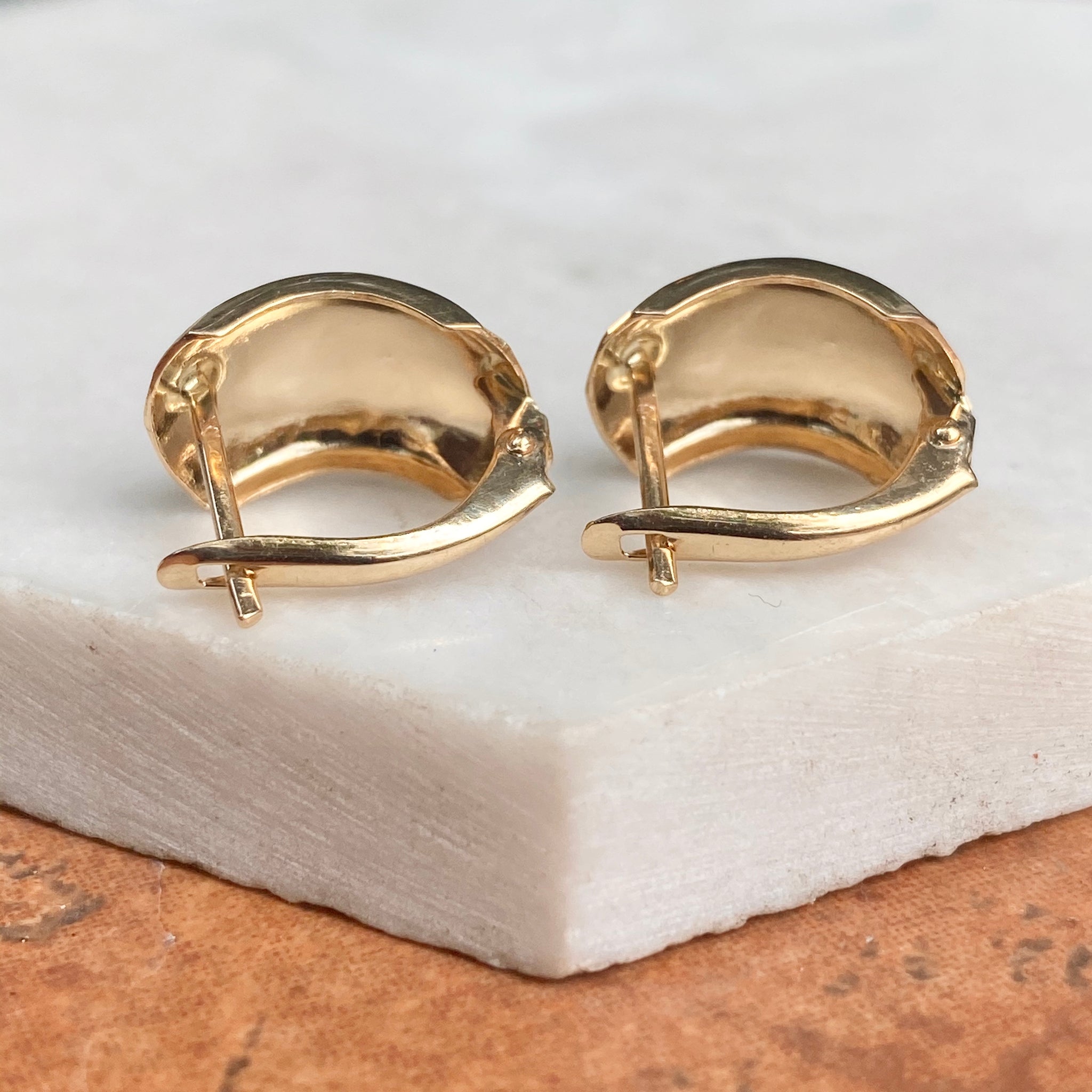 High polished 14KT yellow gold hinged lever back earrings with hammered effect. Easily add on your own charms to these lever backs to instantly change-up your look!