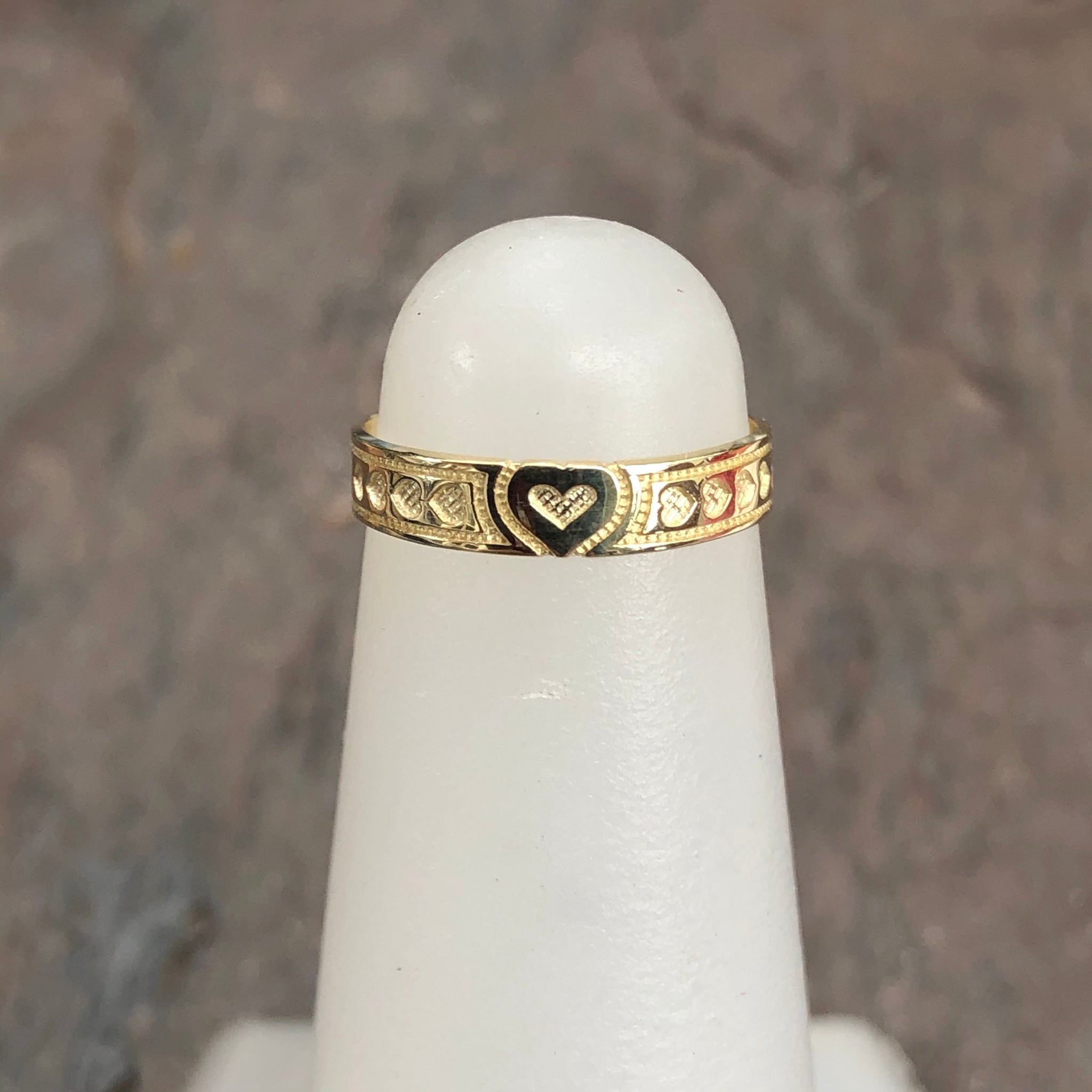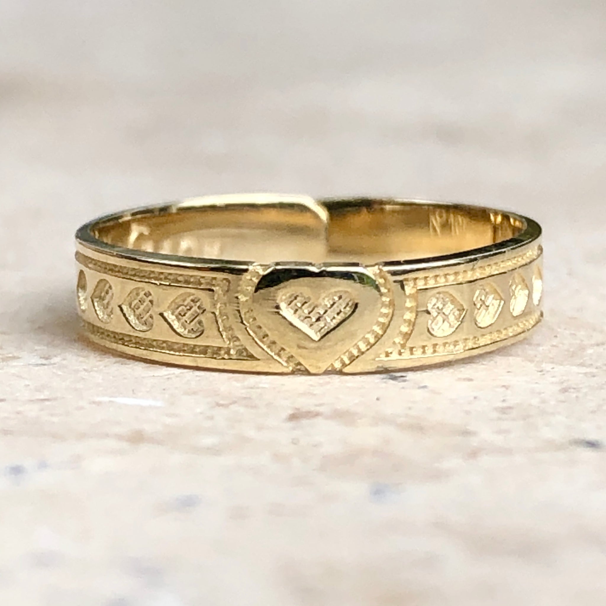 14KT yellow gold toe ring with embossed patterned hearts design. Perfect for that upcoming beach vacation. Wear in the water without fear of tarnishing!