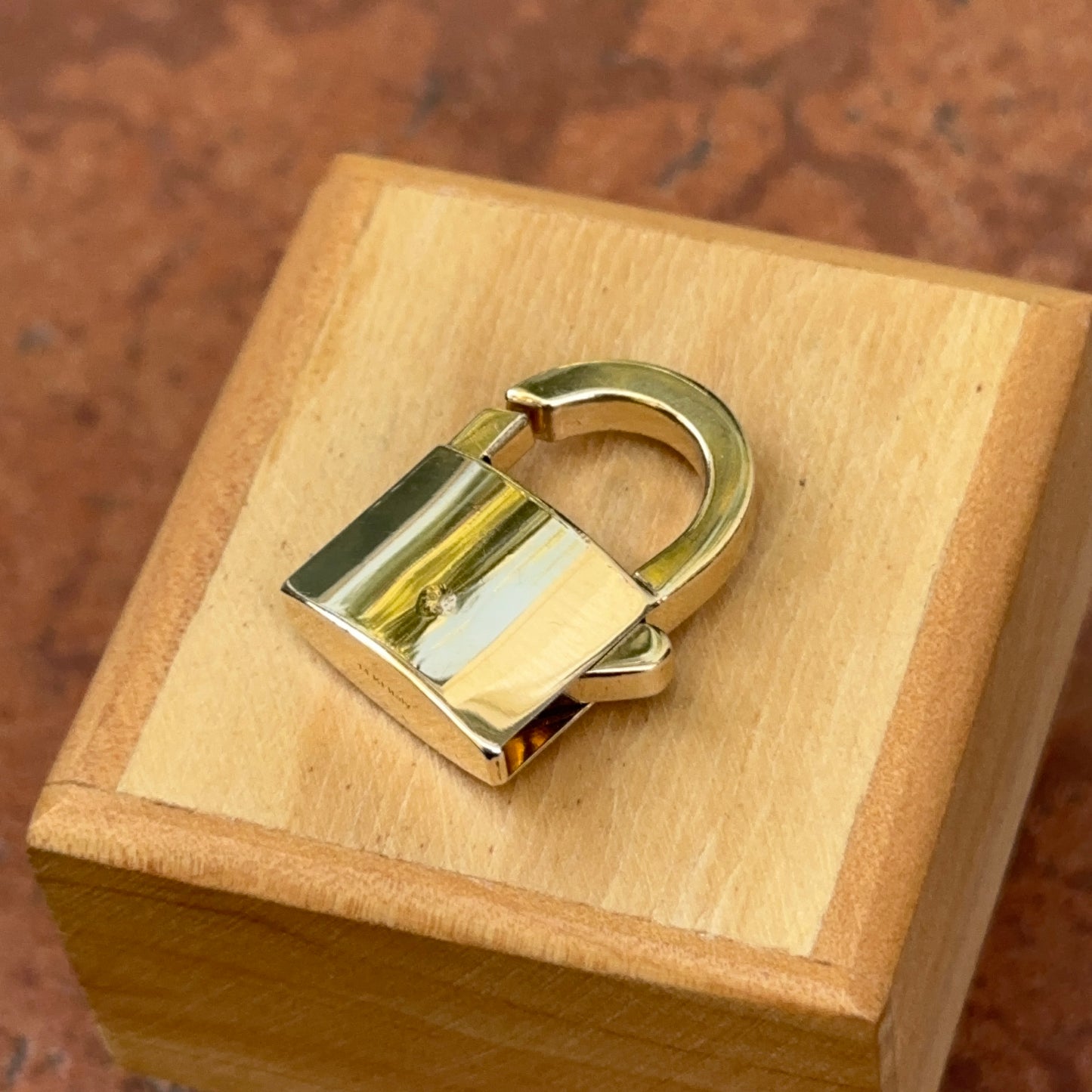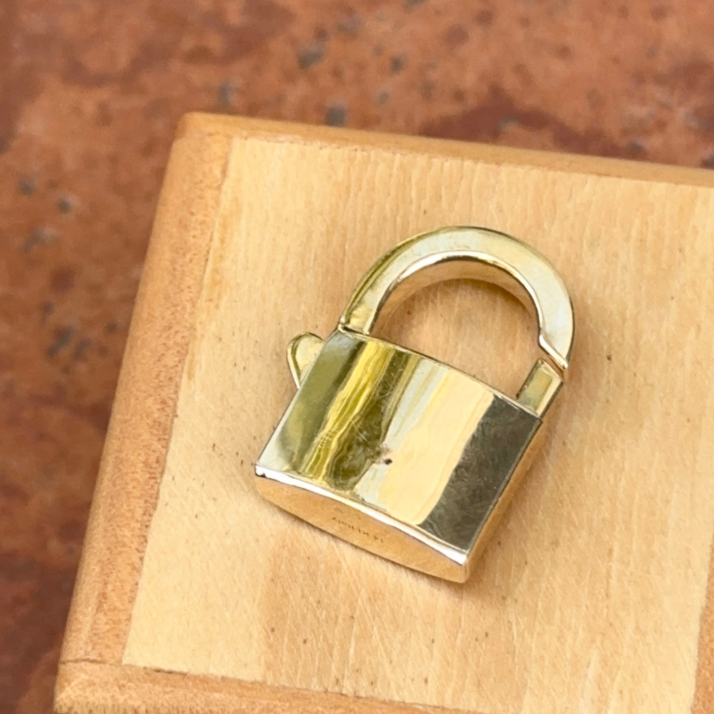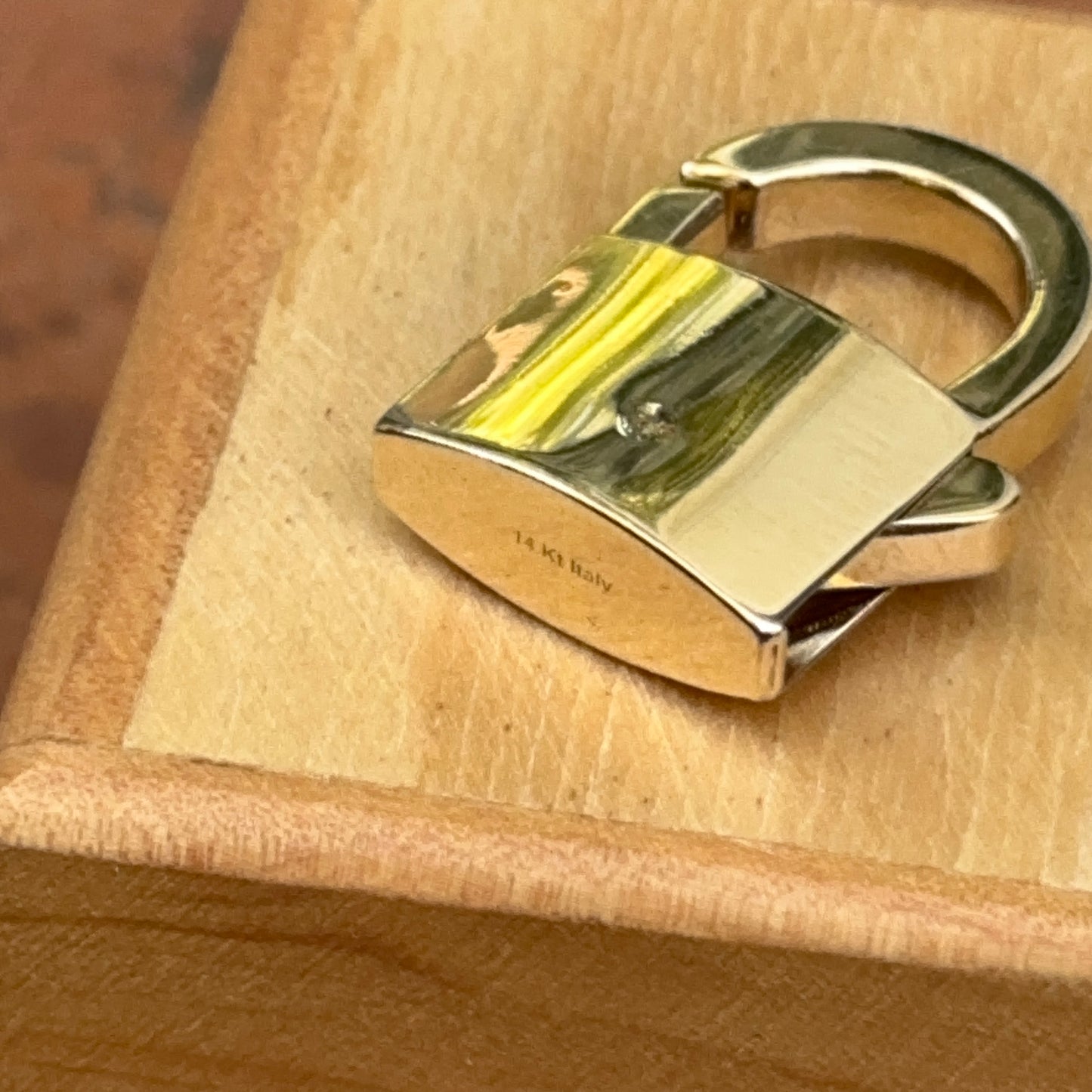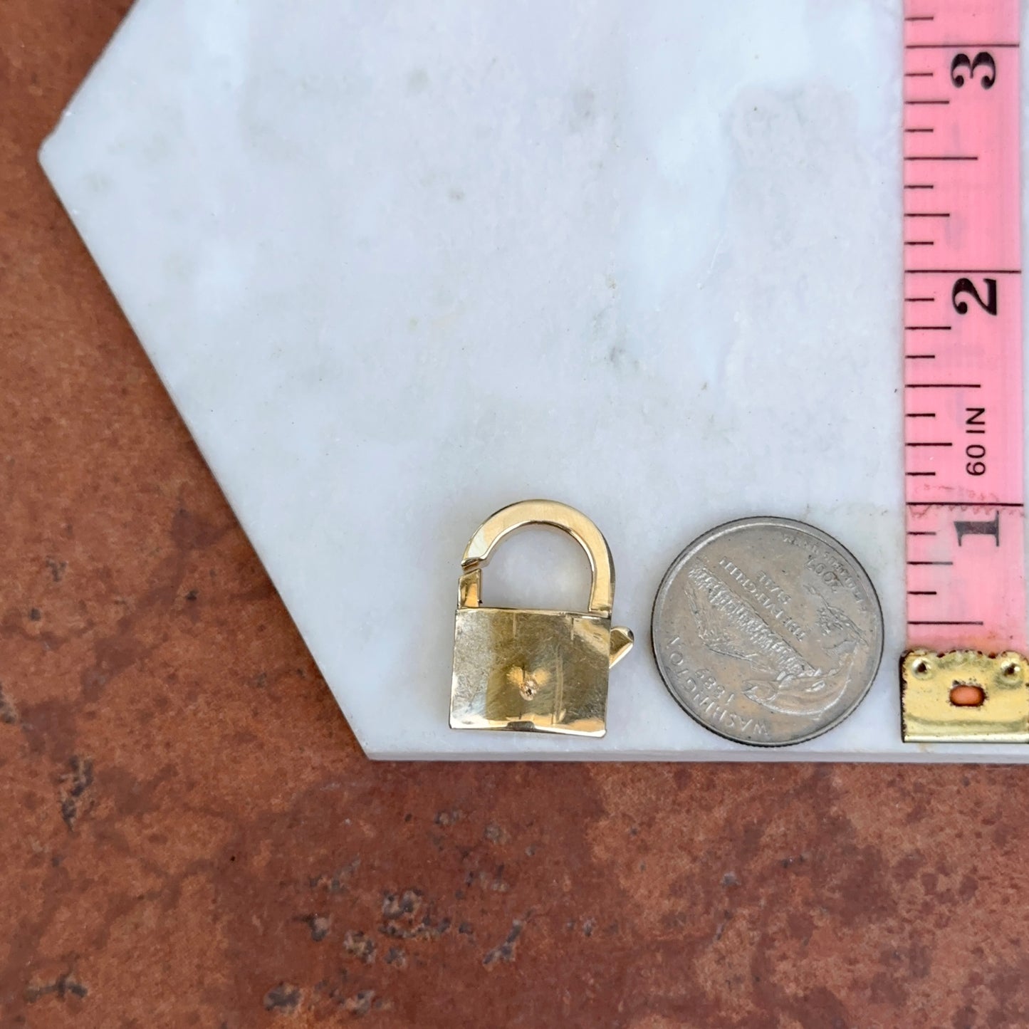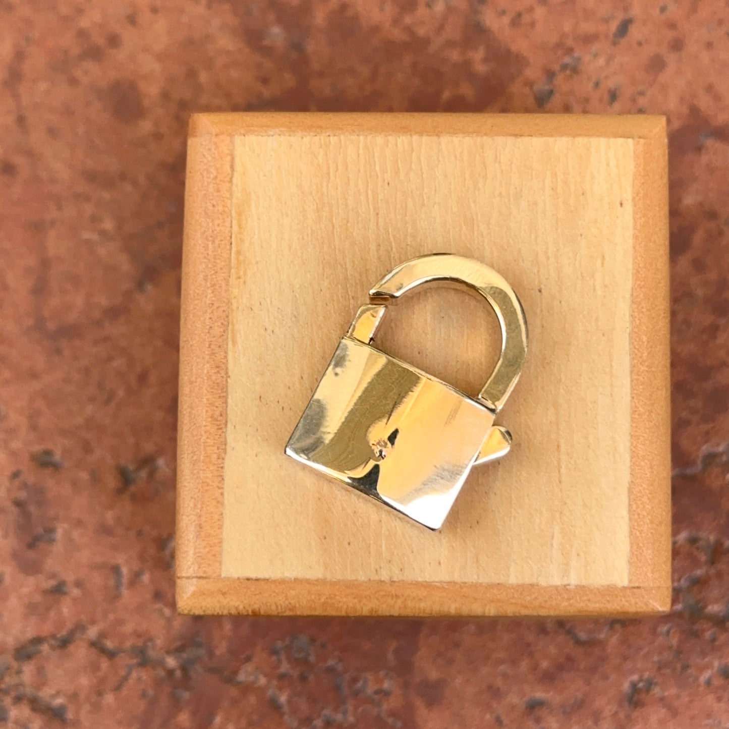 14KT yellow gold pad lock pendant charm with hinged/trigger opening. The lock is a symbol for protection + security! Great charm added onto a chain, clipped onto larger necklace/bracelet links, or connecting a chain necklace! Also available in smaller size.