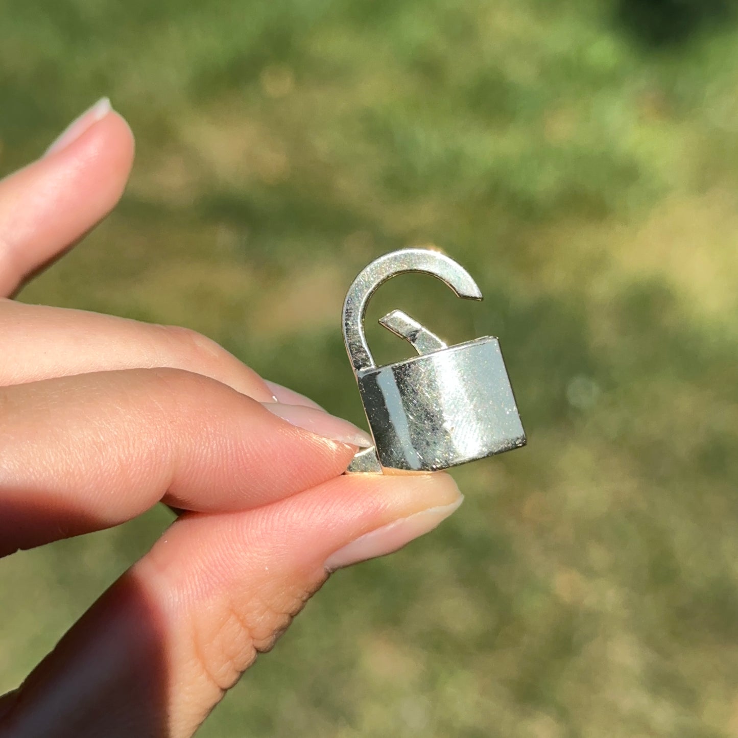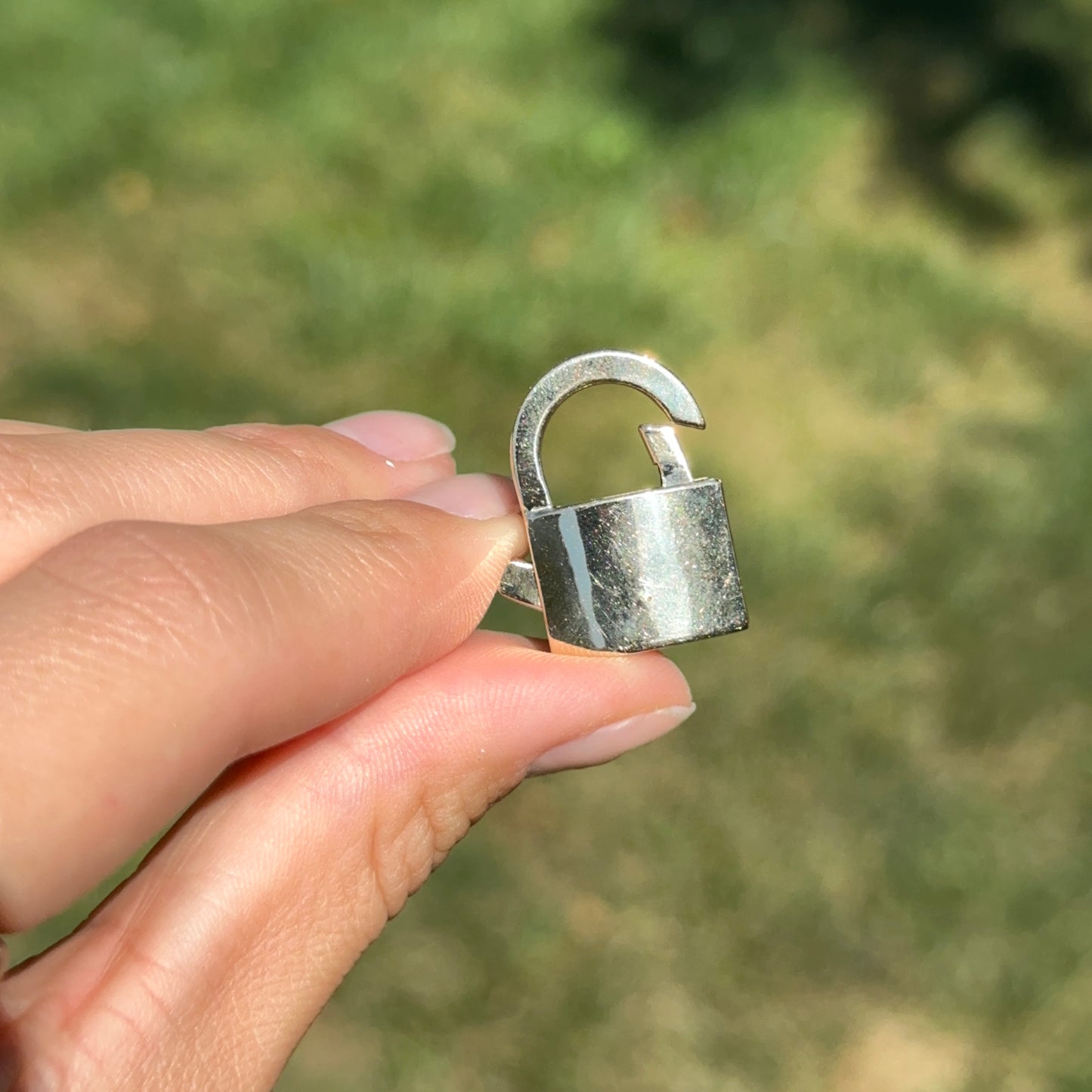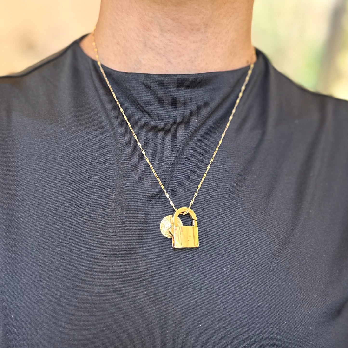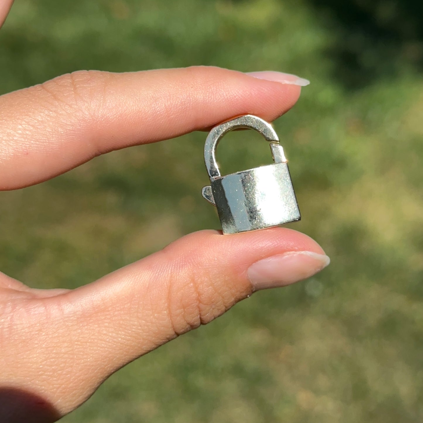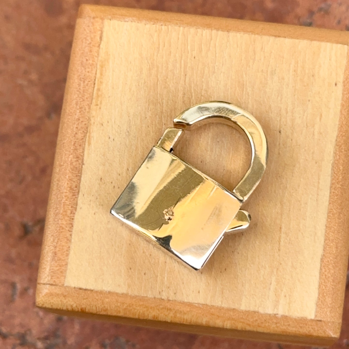 14KT yellow gold pad lock pendant charm with hinged/trigger opening. The lock is a symbol for protection + security! Great charm added onto a chain, clipped onto larger necklace/bracelet links, or connecting a chain necklace! Also available in smaller size.