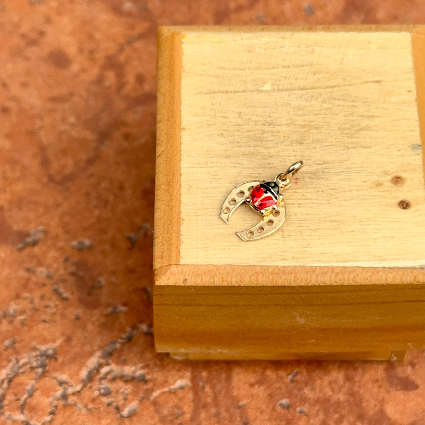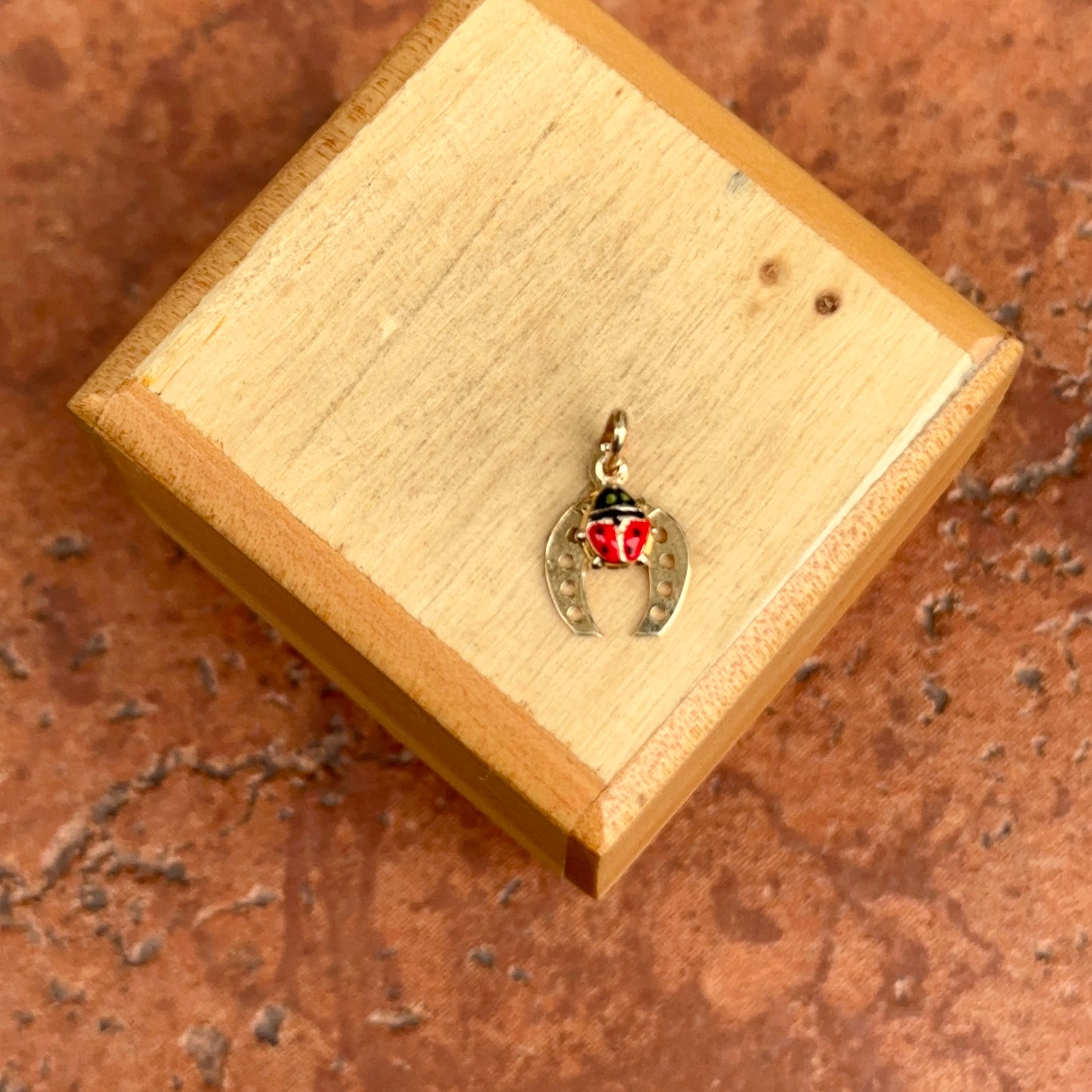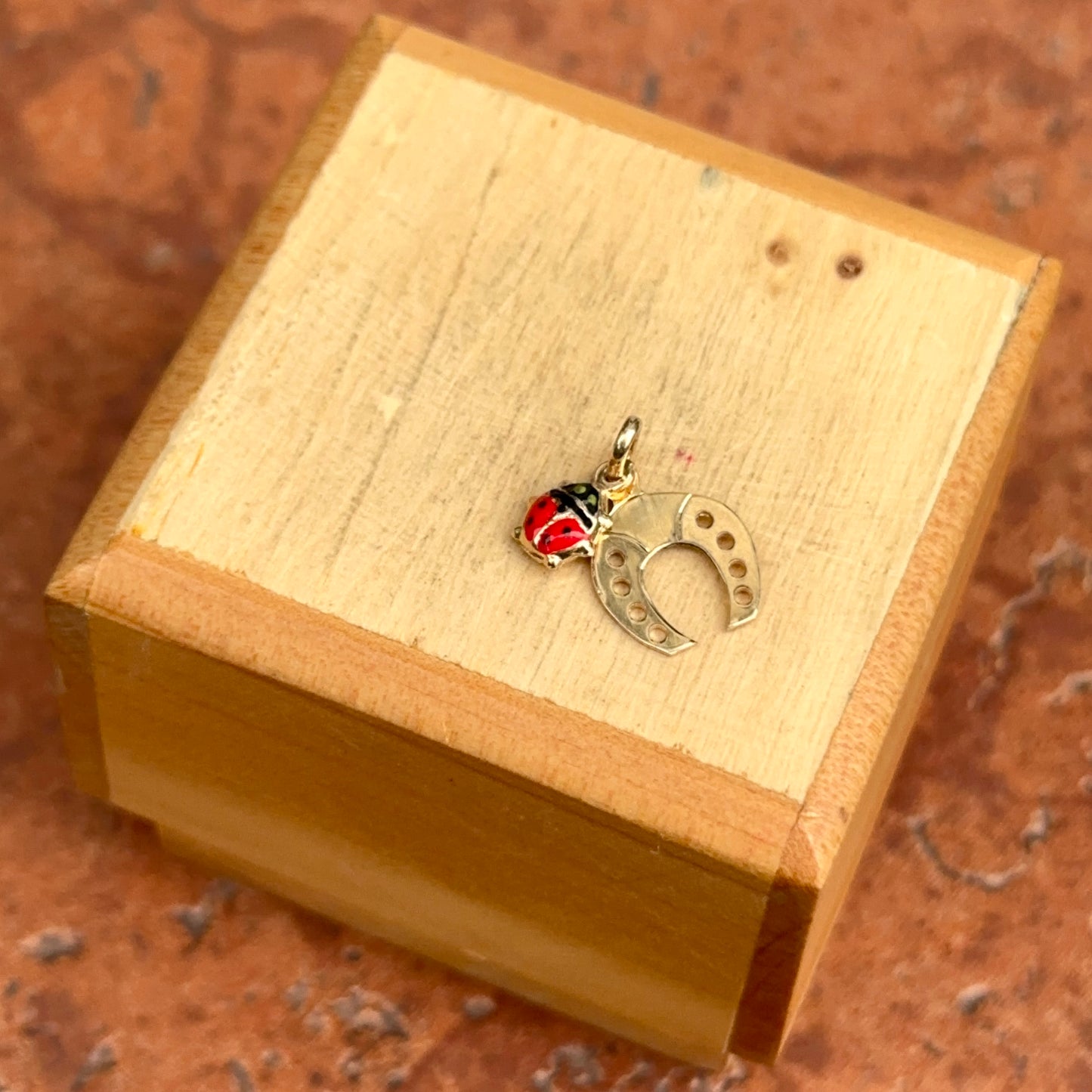 14KT yellow gold horse shoe lucky charm + red enamel ladybug pendant charm. It is said that when a ladybug lands on you that is good luck- so is the same when you are wearing one!
