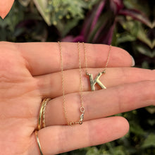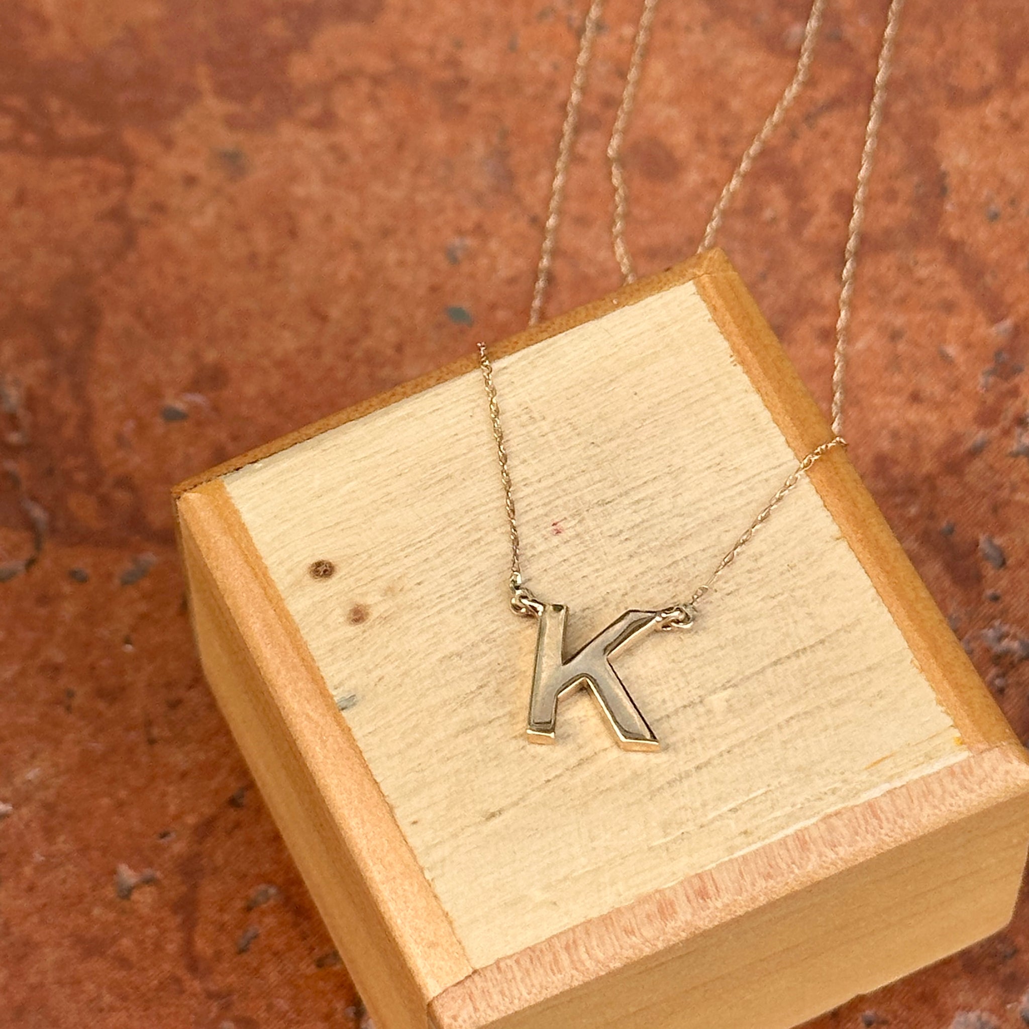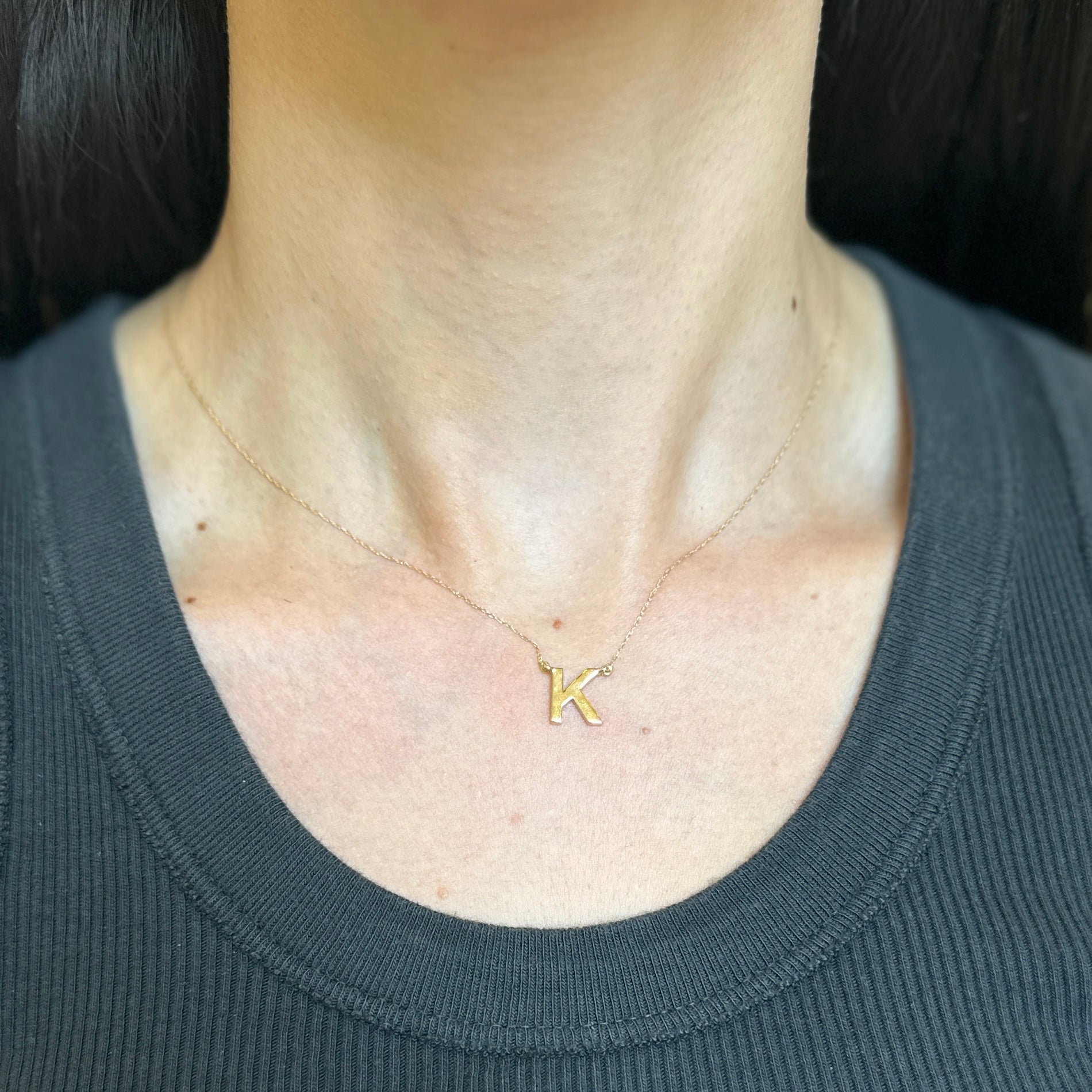14KT yellow gold initial K pendant charm on very thin gold chain 18". More initials may be available. Please inquire for pricing and availability.