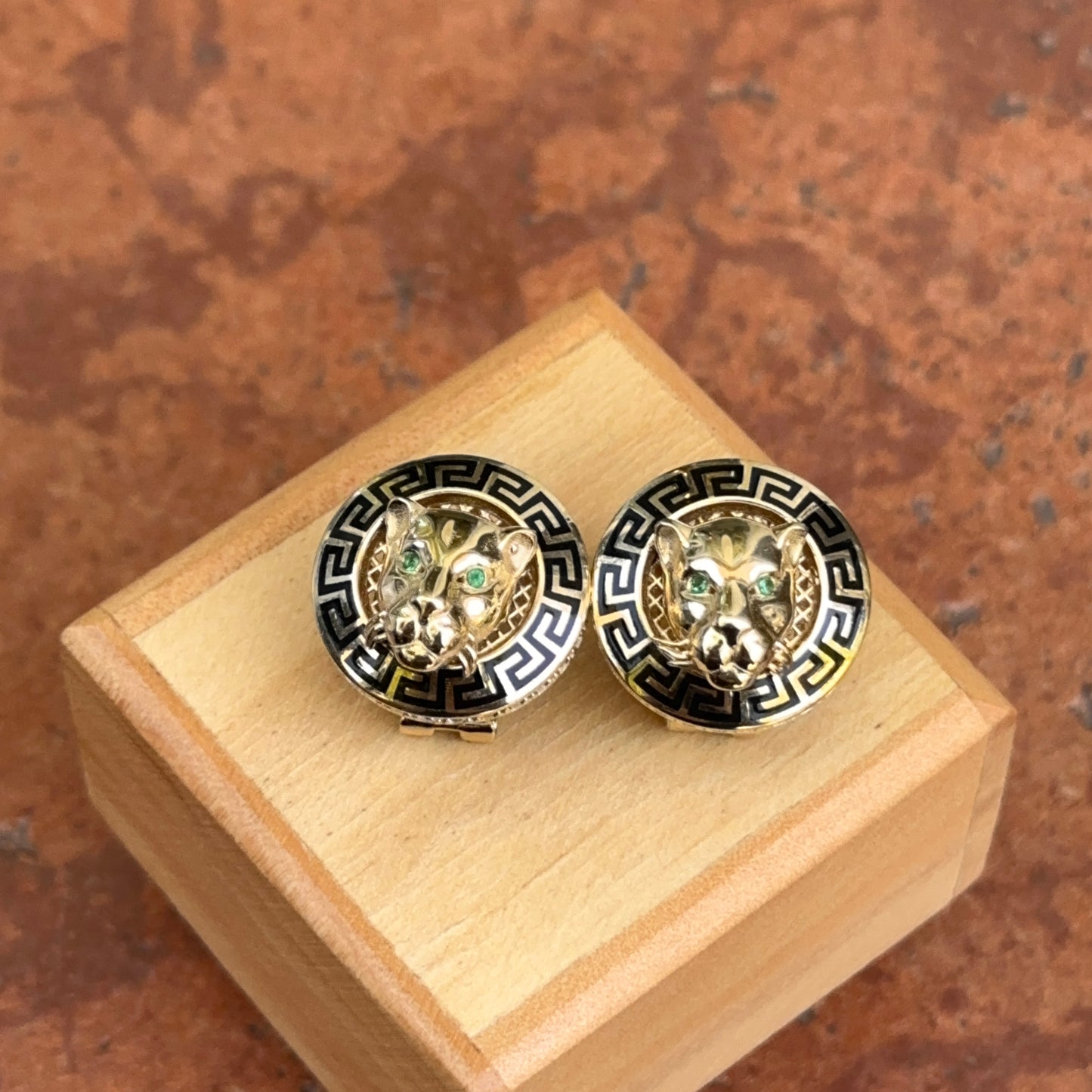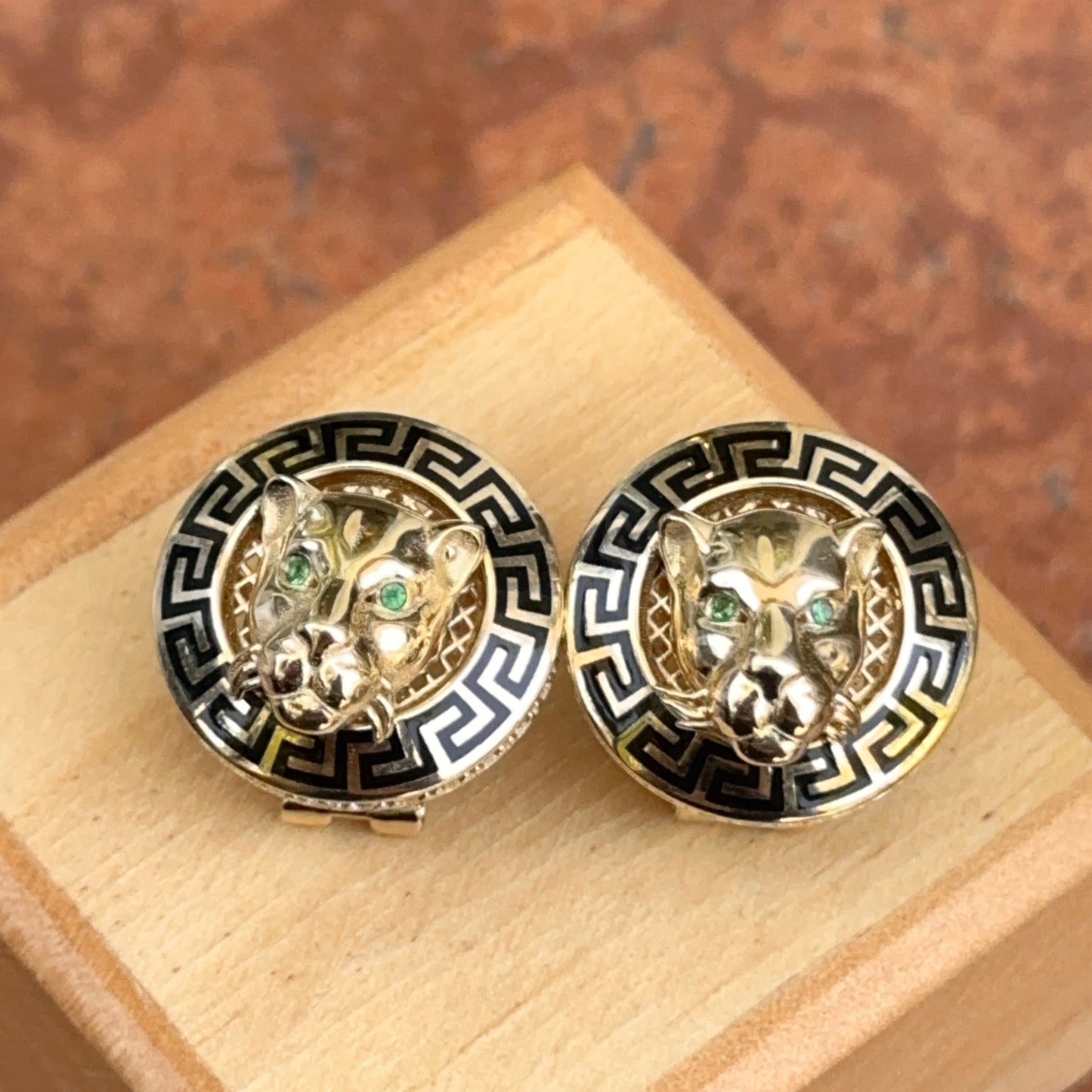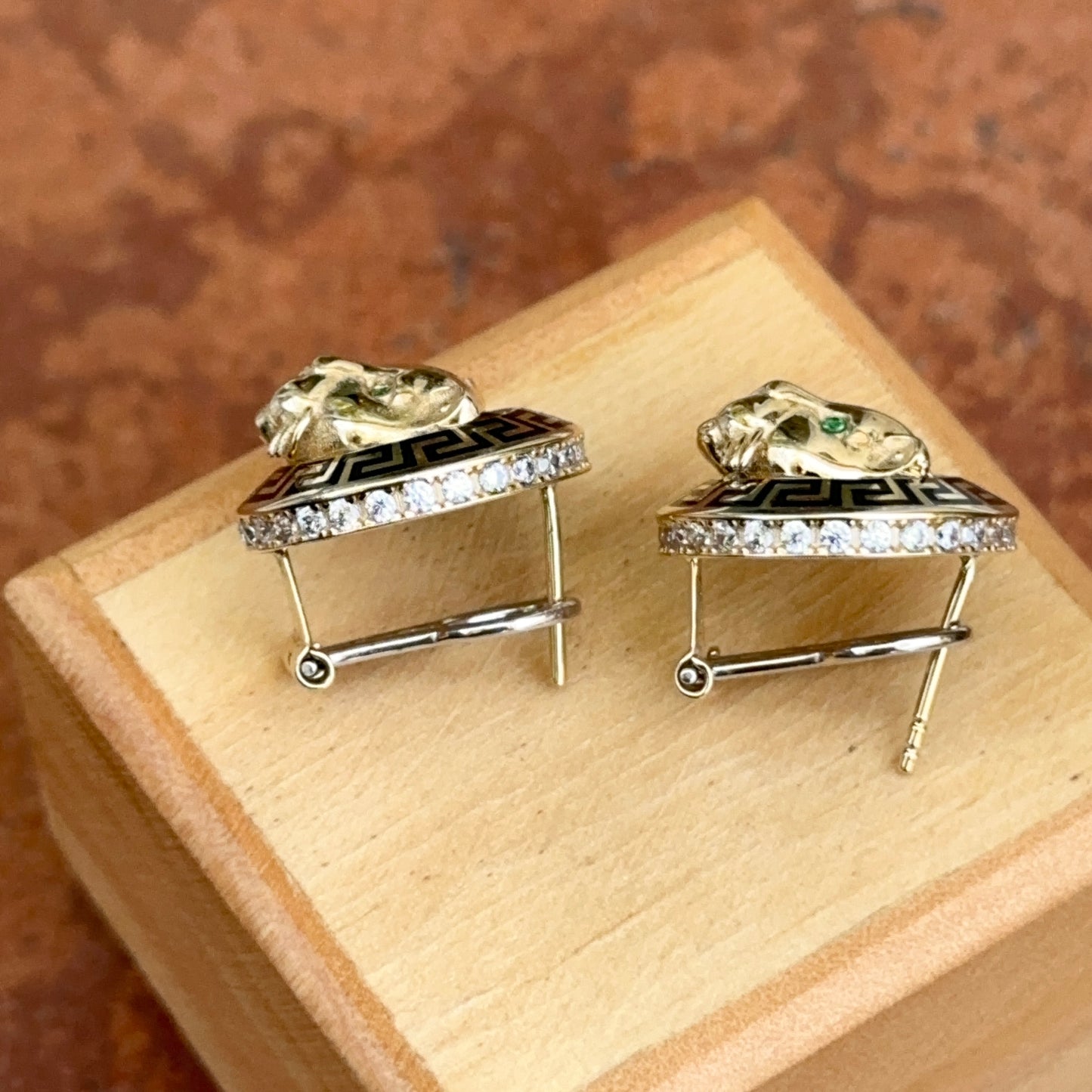 14KT Yellow Gold Italian Black Enamel Greek Key Gold Panther Omega Back Earrings
