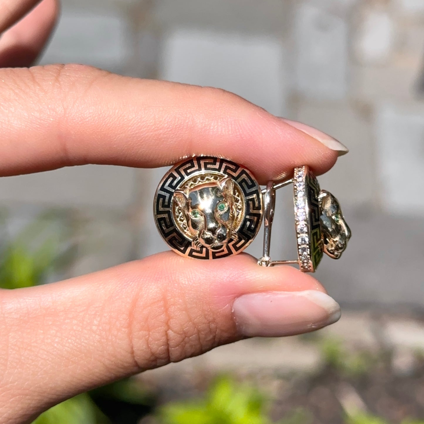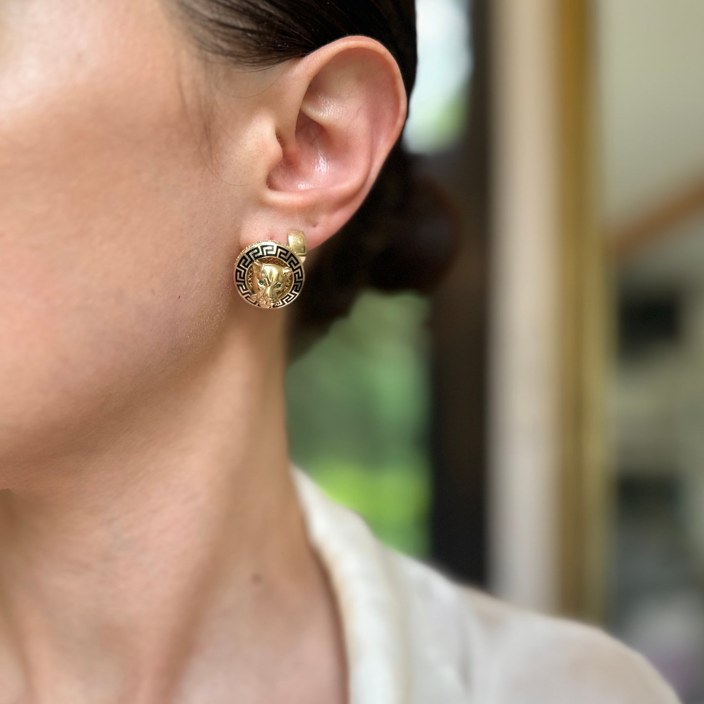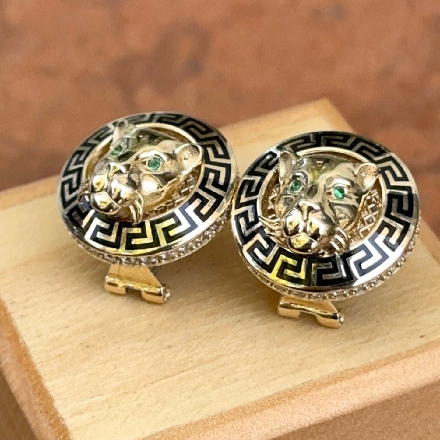 14KT Yellow Gold Italian Black Enamel Greek Key Gold Panther Omega Back Earrings
