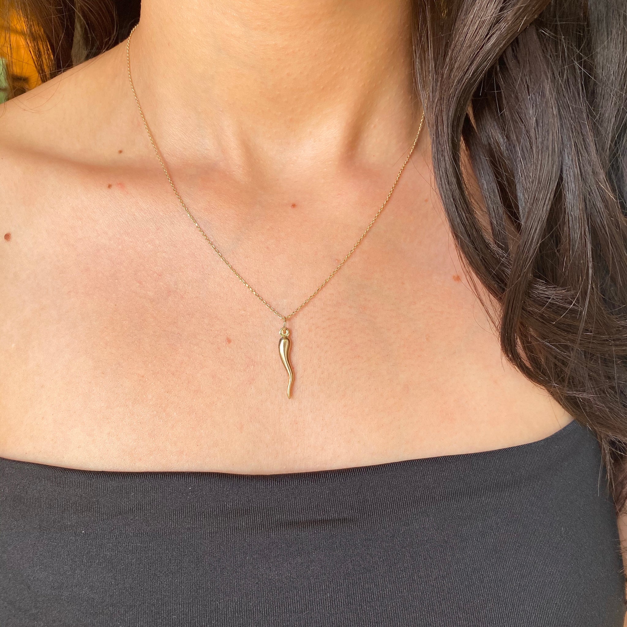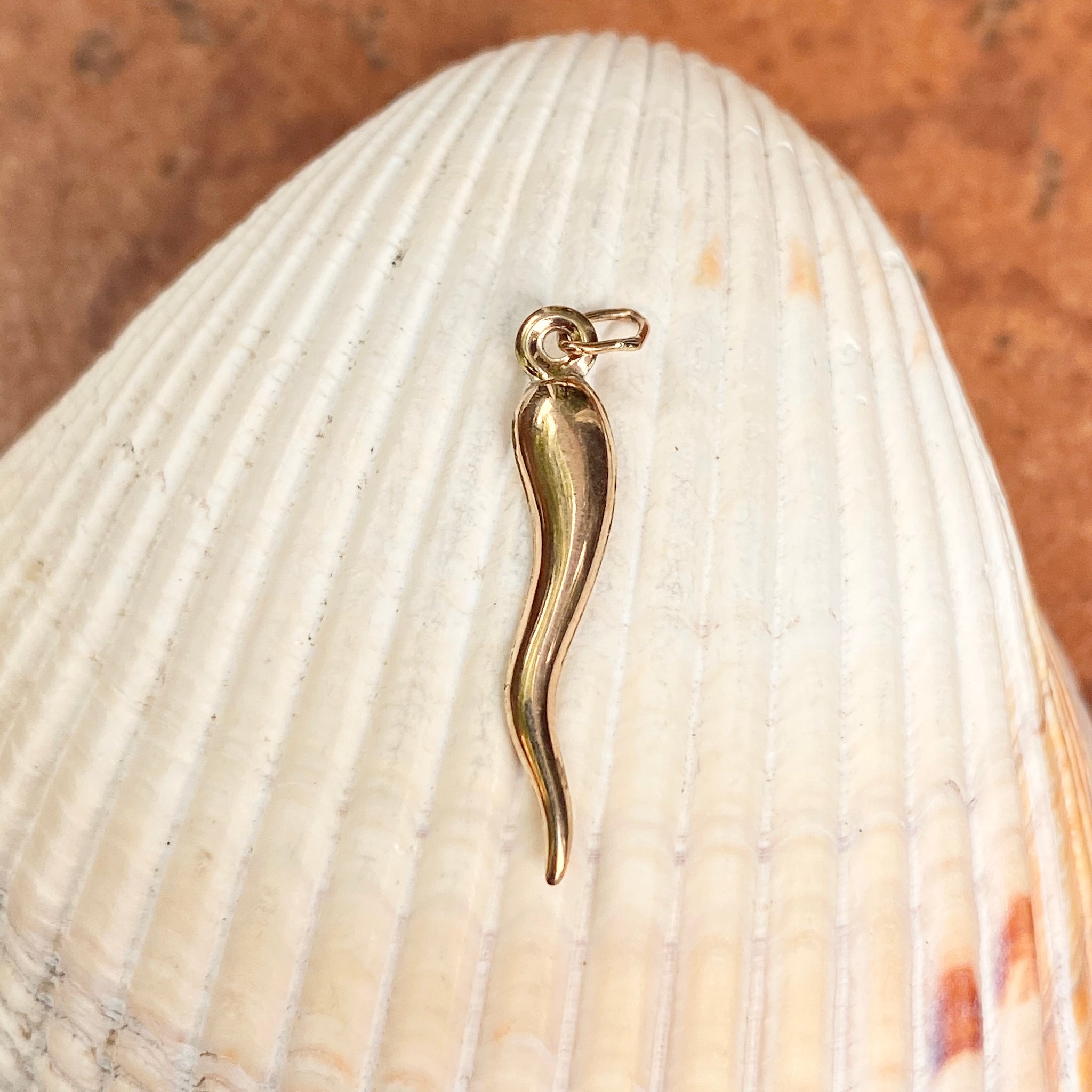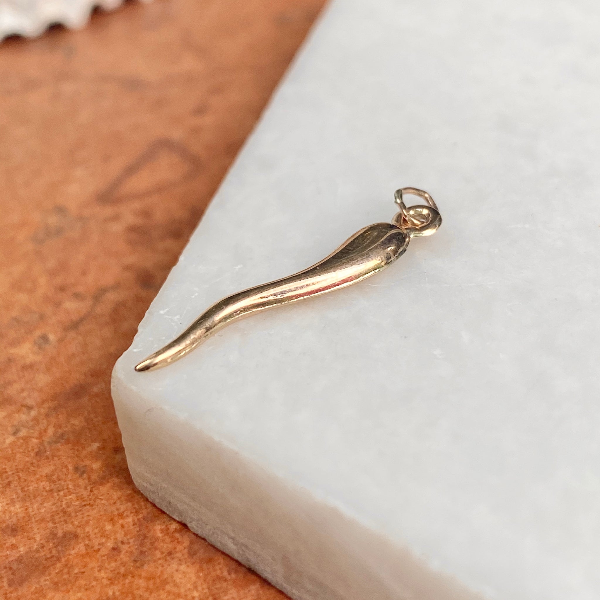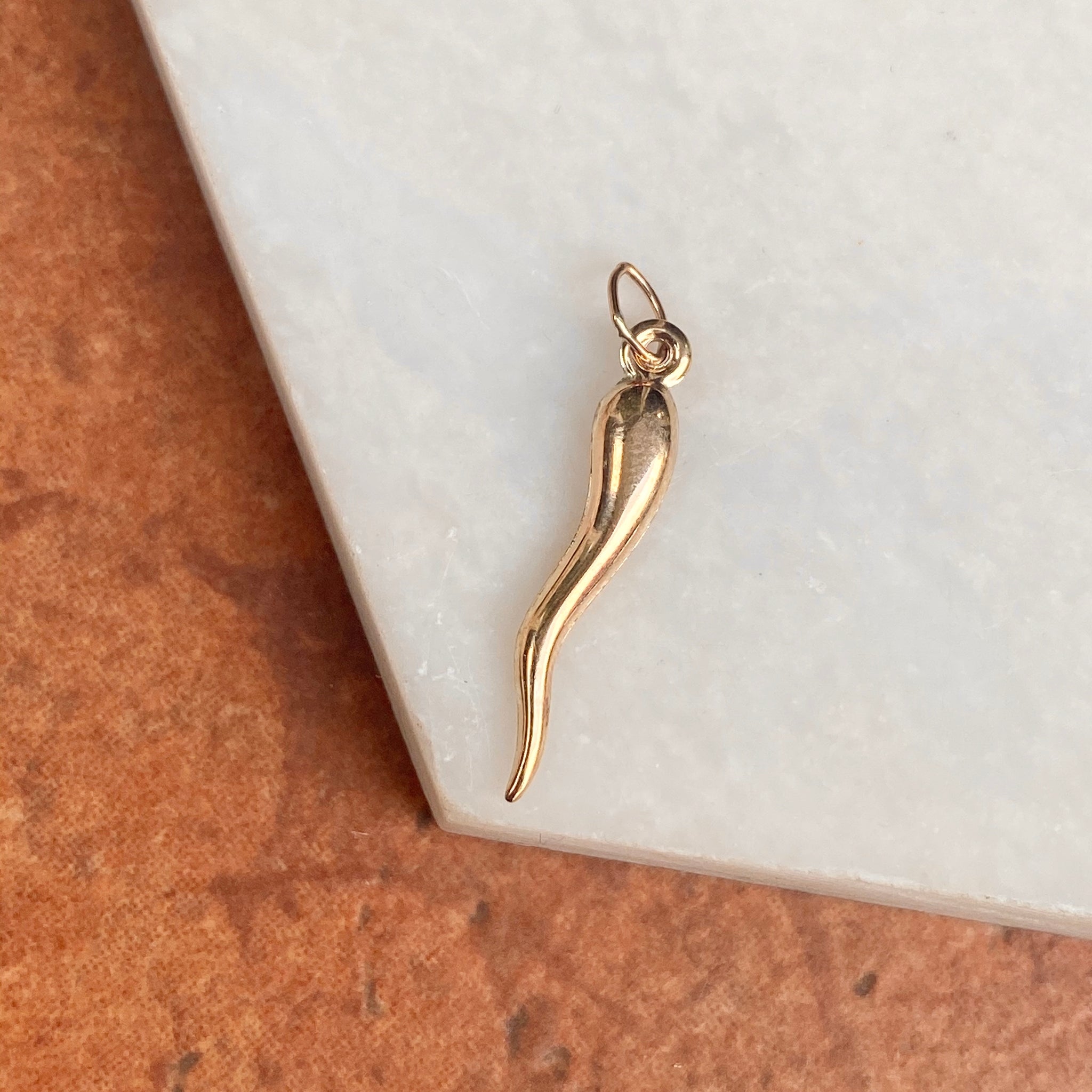 14KT yellow gold 3D Italian horn "Cornicello" pendant. Called the "Cornicello", in Italian meaning 'little horn', and worn for protection against evil energies. Wear on a charm bracelet, wear on a necklace, or buy two and use as earring charms.