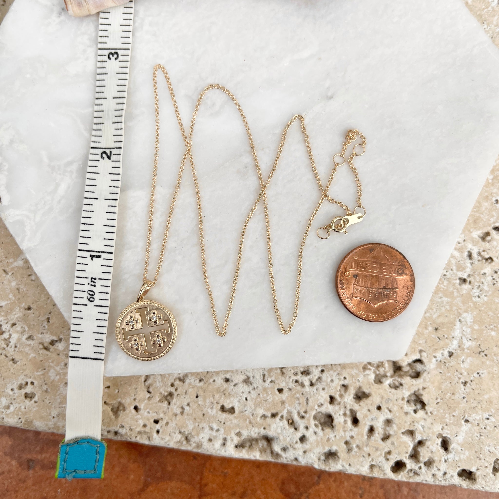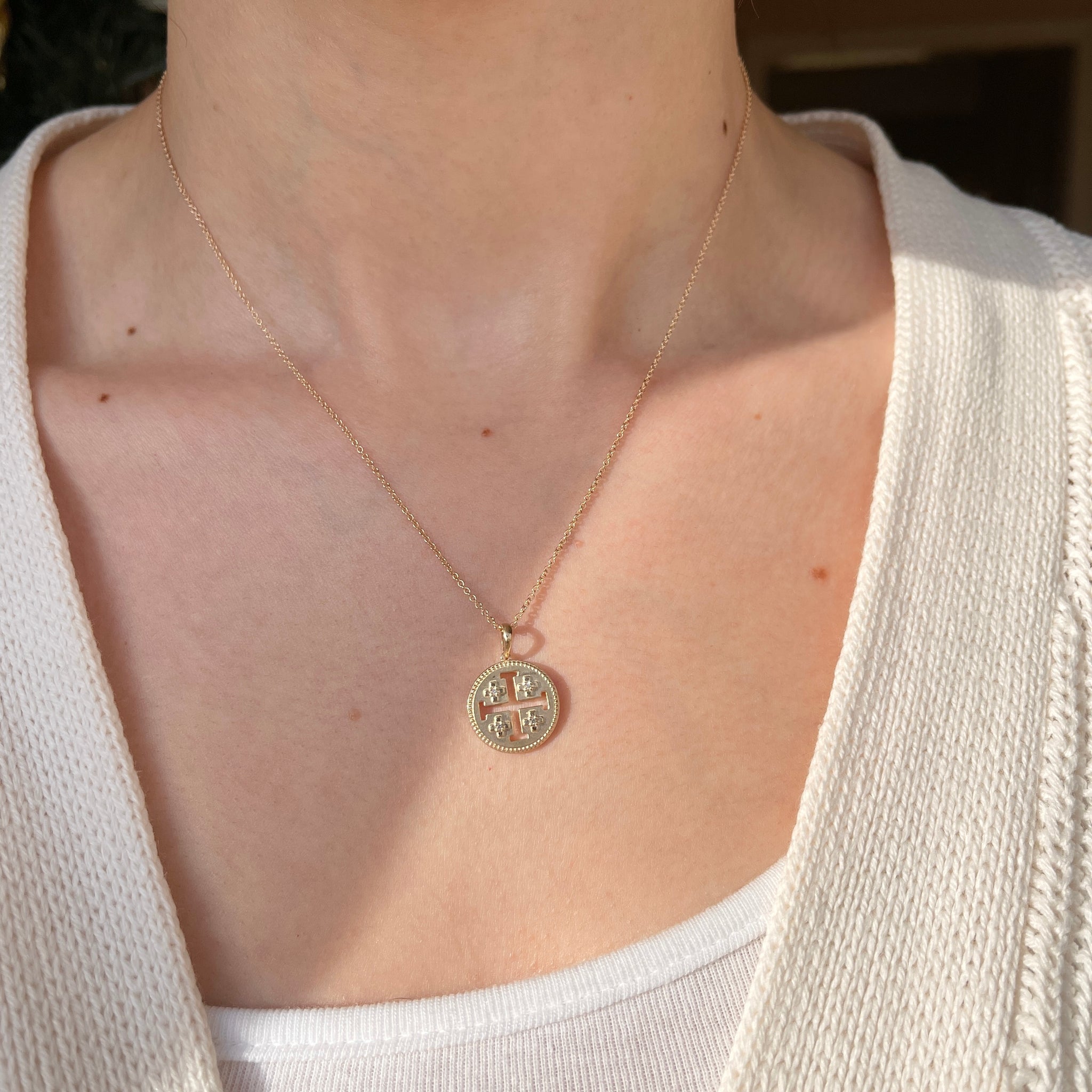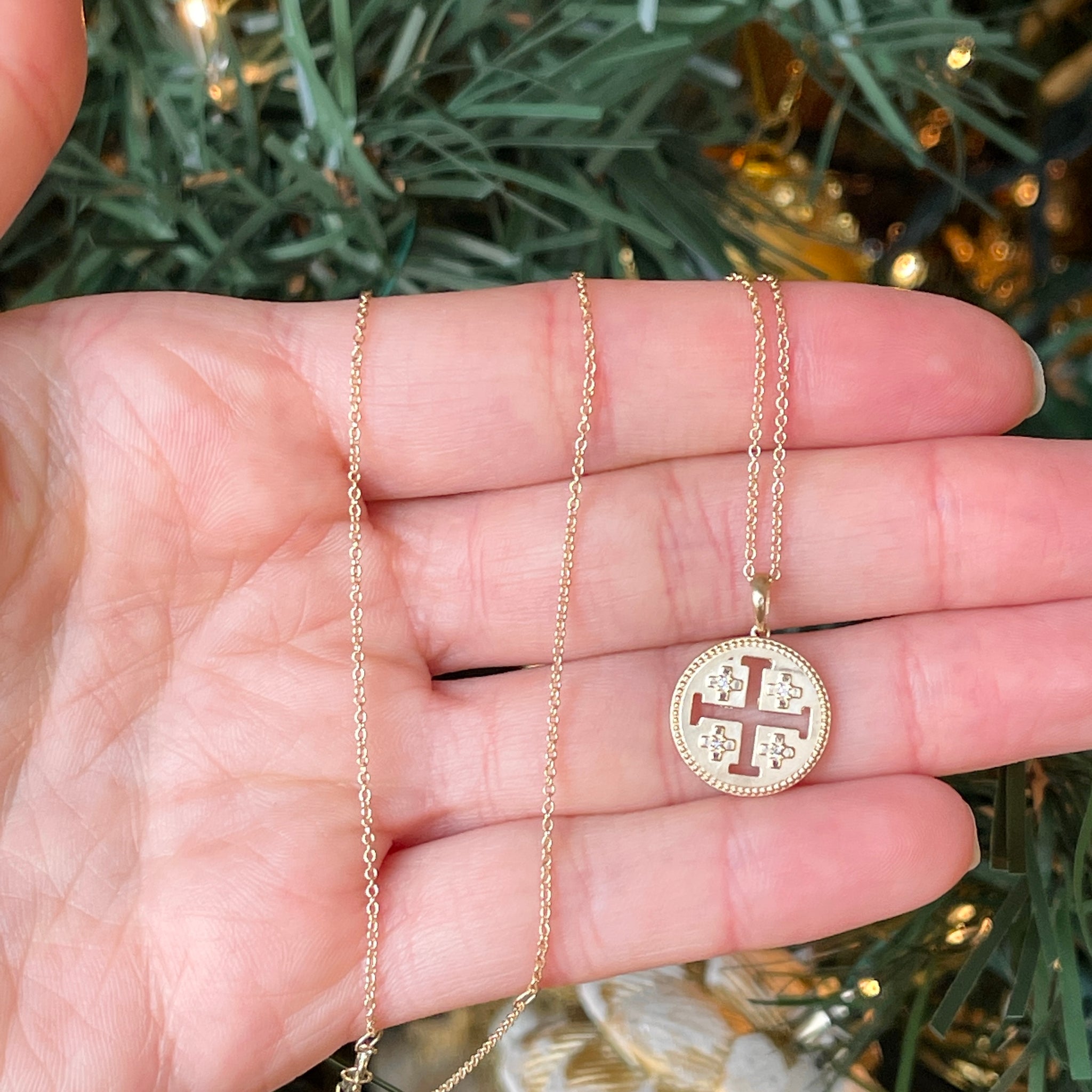 14KT yellow gold round medal with Jerusalem cross cut-out and diamonds on a thin,14KT yellow gold chain necklace. The Jerusalem Cross consists of tau crosses which represent the Old Testament and four small Greek crosses which represent the fulfillment of the law in the gospels. The symbolism of the five-fold cross is variously given as the Five Wounds of Christ, Christ and the four evangelists, or Christ and the four quarters of the world. Also available in sterling silver.