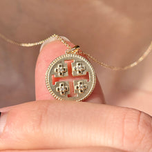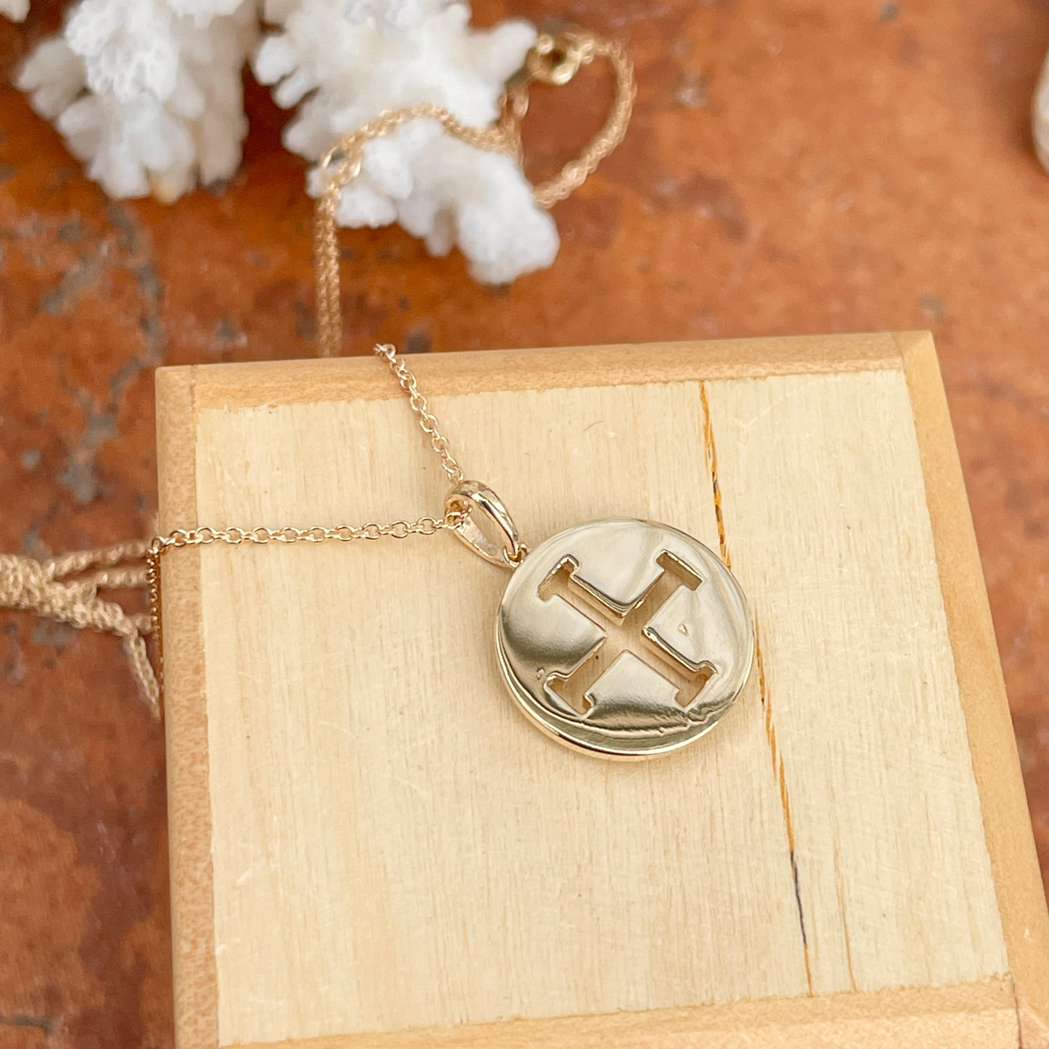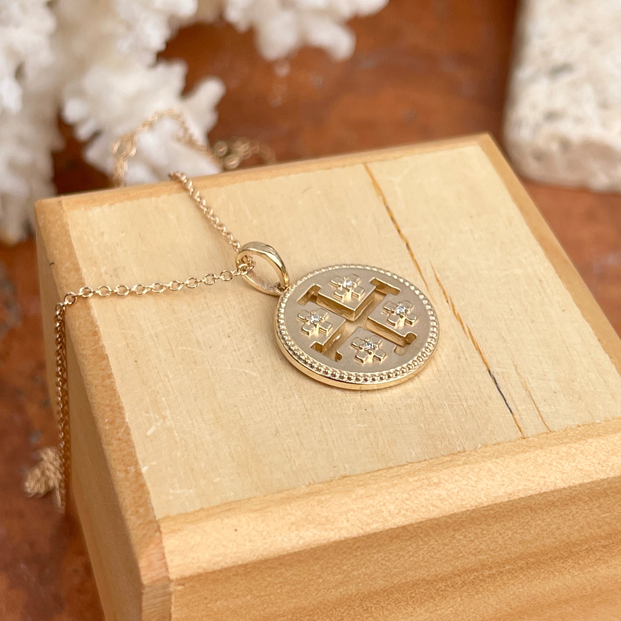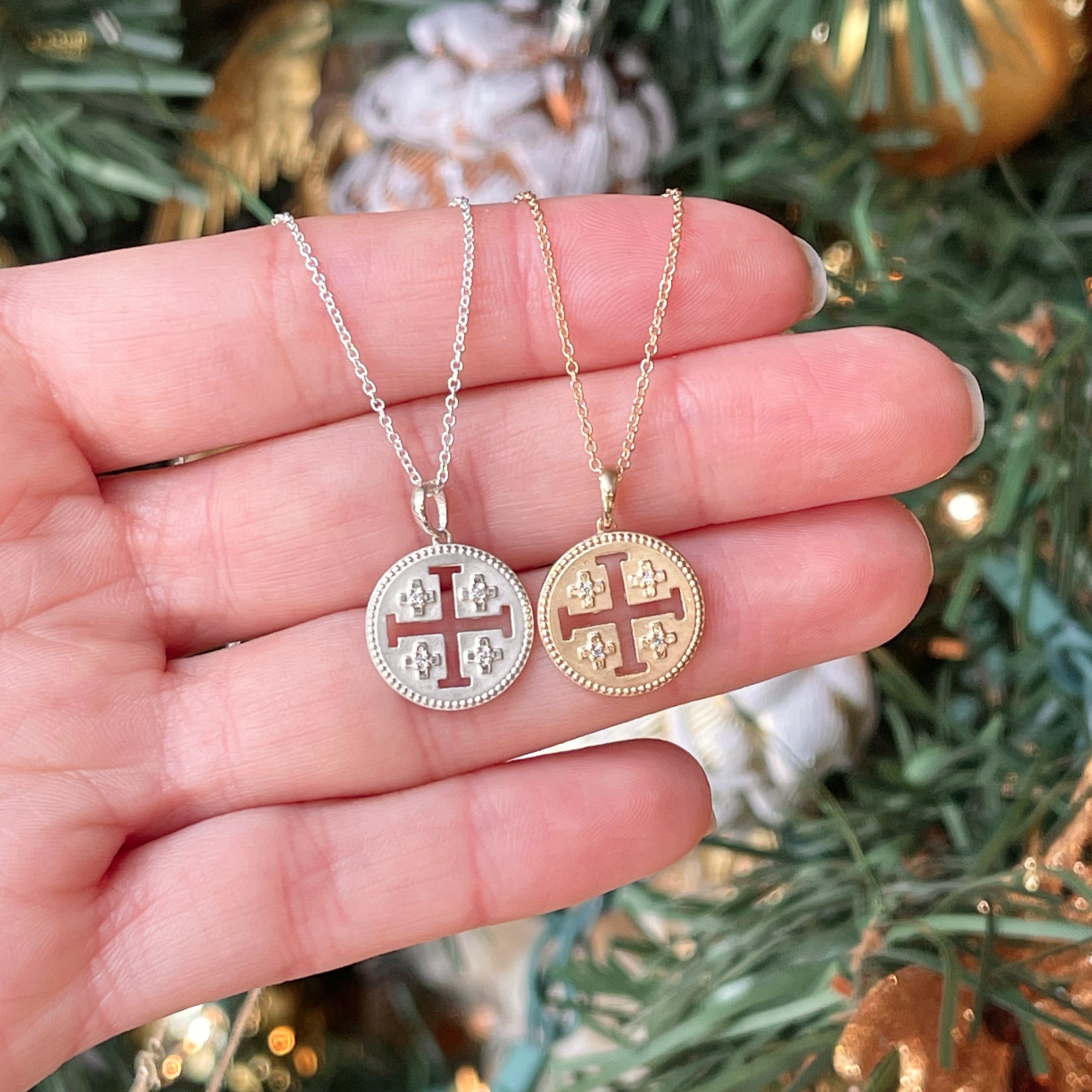 14KT yellow gold round medal with Jerusalem cross cut-out and diamonds on a thin,14KT yellow gold chain necklace. The Jerusalem Cross consists of tau crosses which represent the Old Testament and four small Greek crosses which represent the fulfillment of the law in the gospels. The symbolism of the five-fold cross is variously given as the Five Wounds of Christ, Christ and the four evangelists, or Christ and the four quarters of the world. Also available in sterling silver.