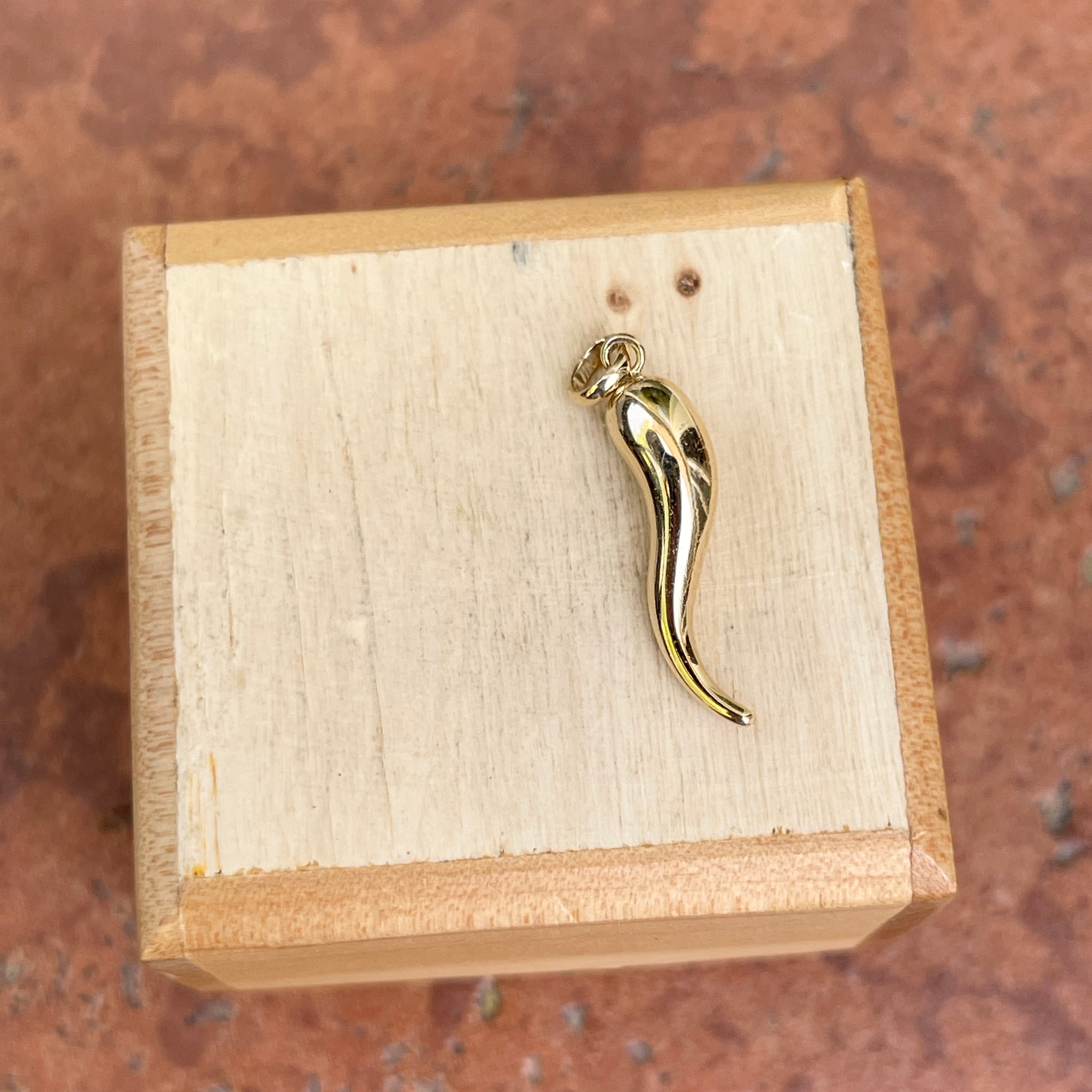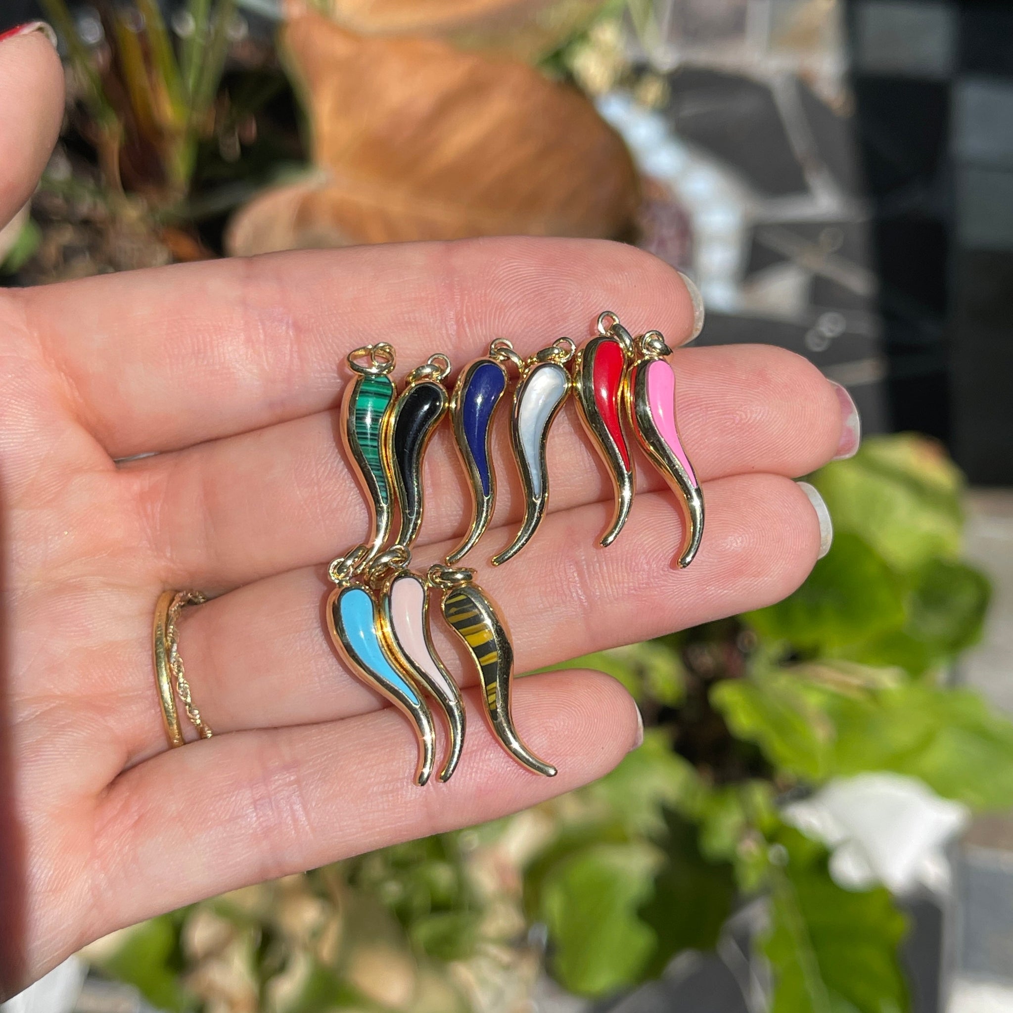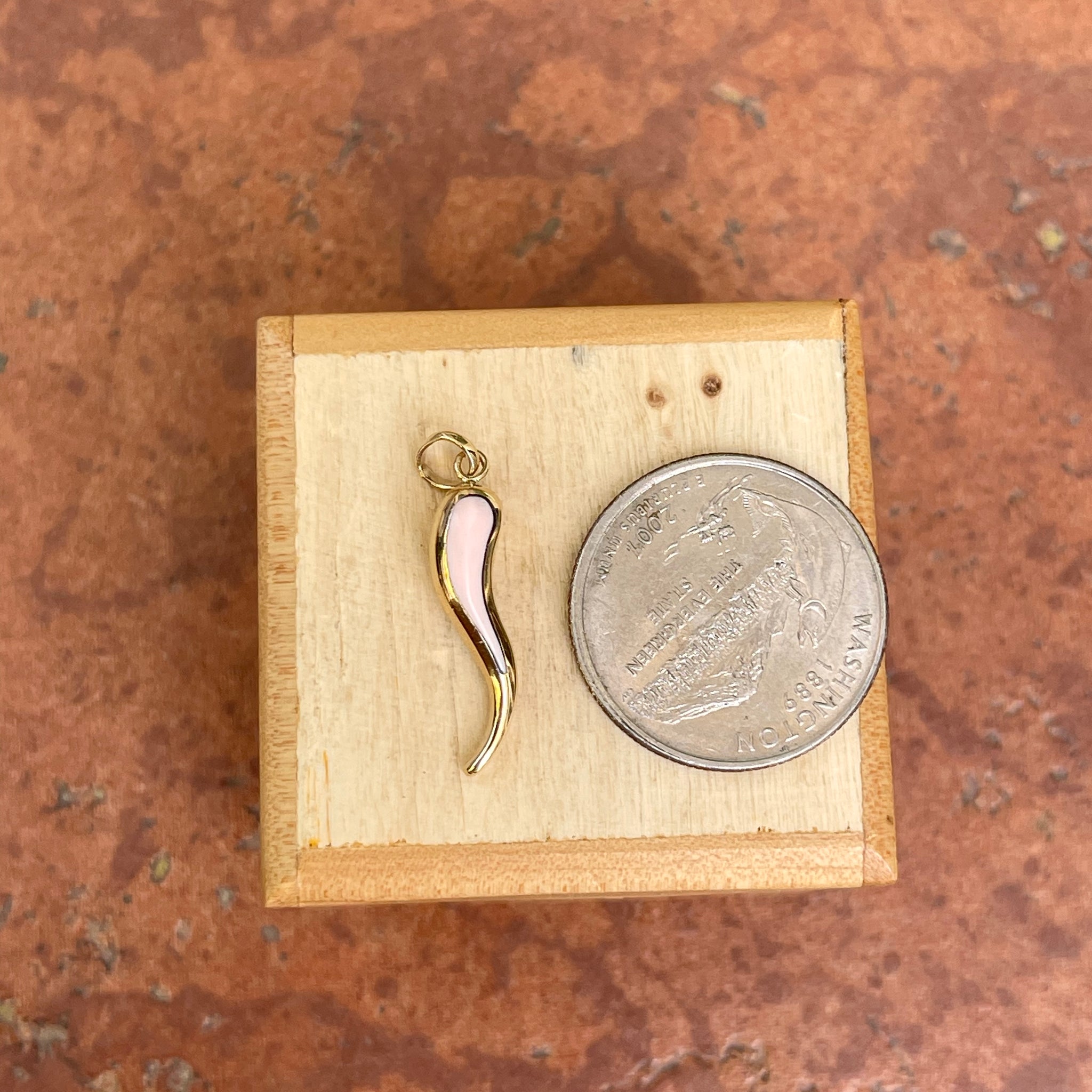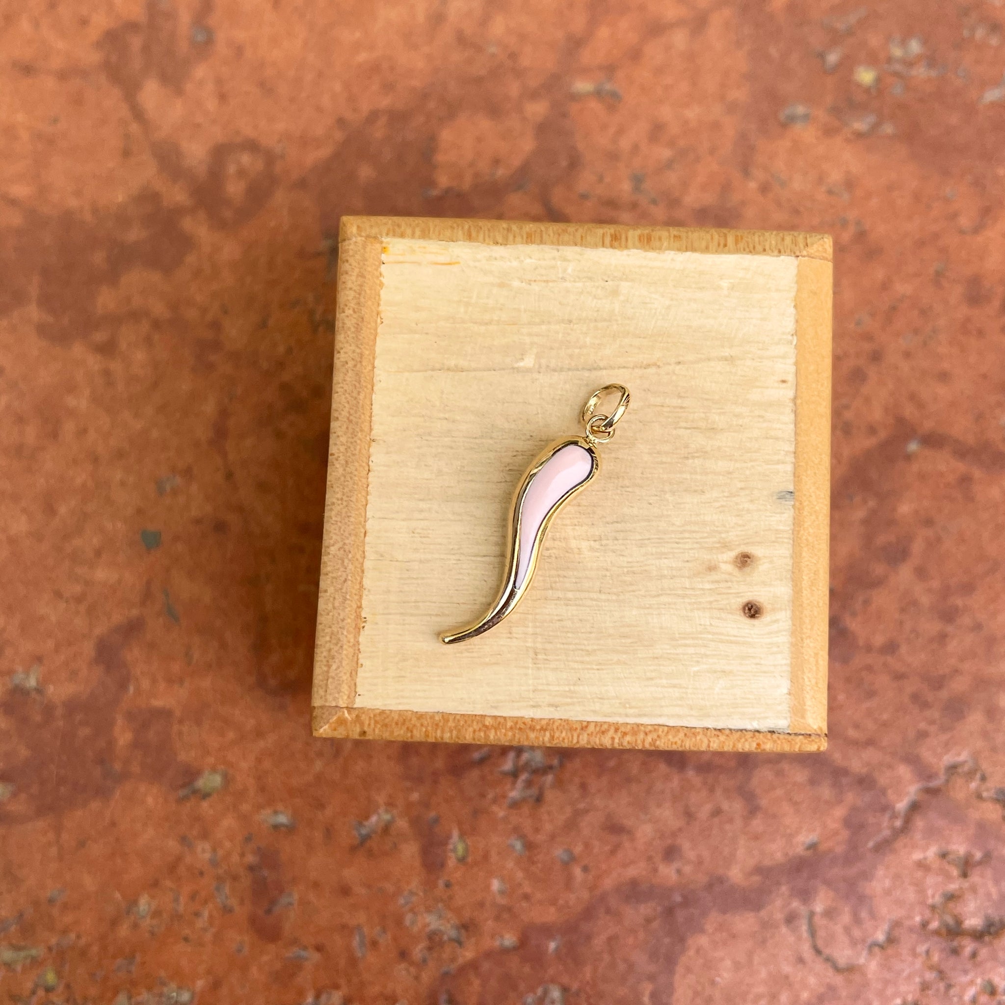 14KT yellow gold Corno/ Cornicello Italian Horn pendant charm with baby pink enamel. You can wear this pendant TWO WAYS! Wear the front side with the pink or wear it on the back with a polished-gold finish!