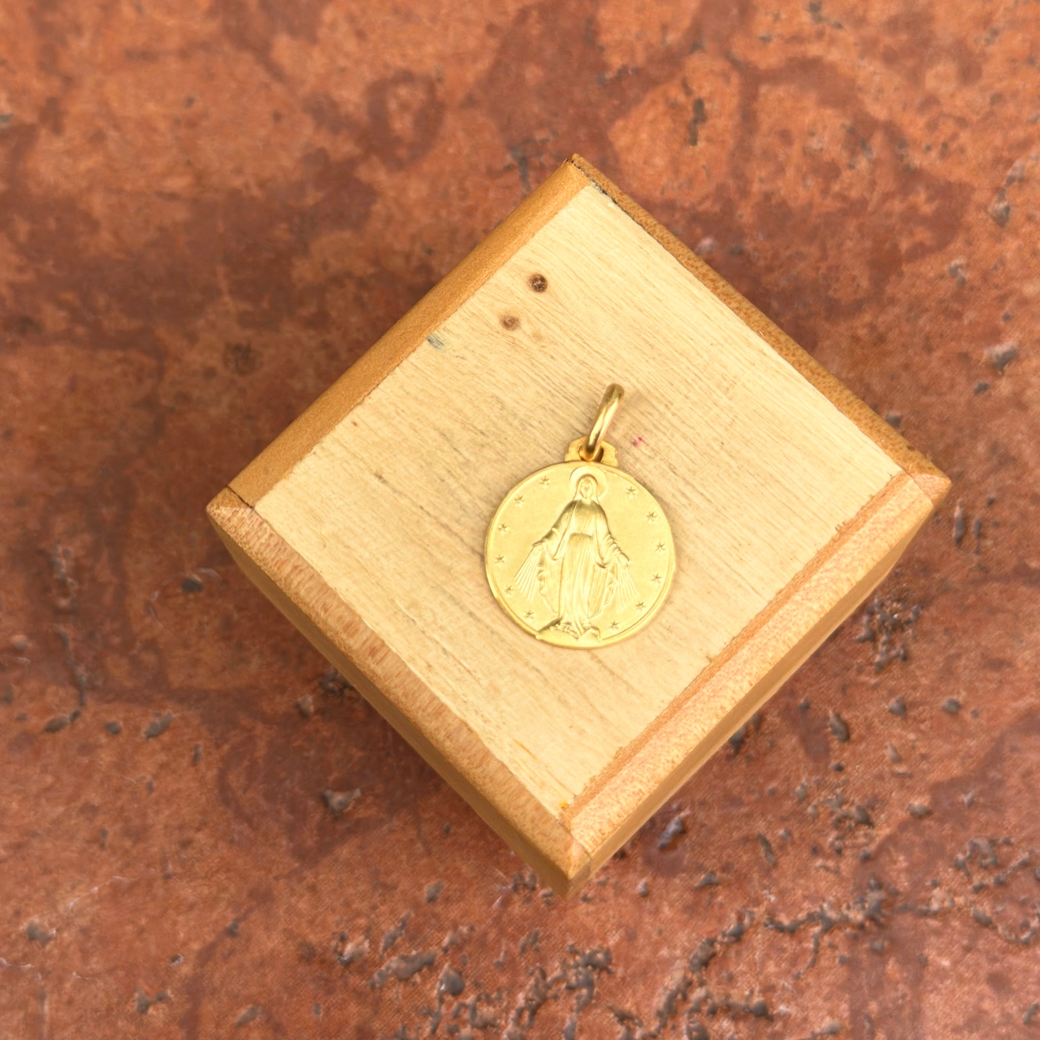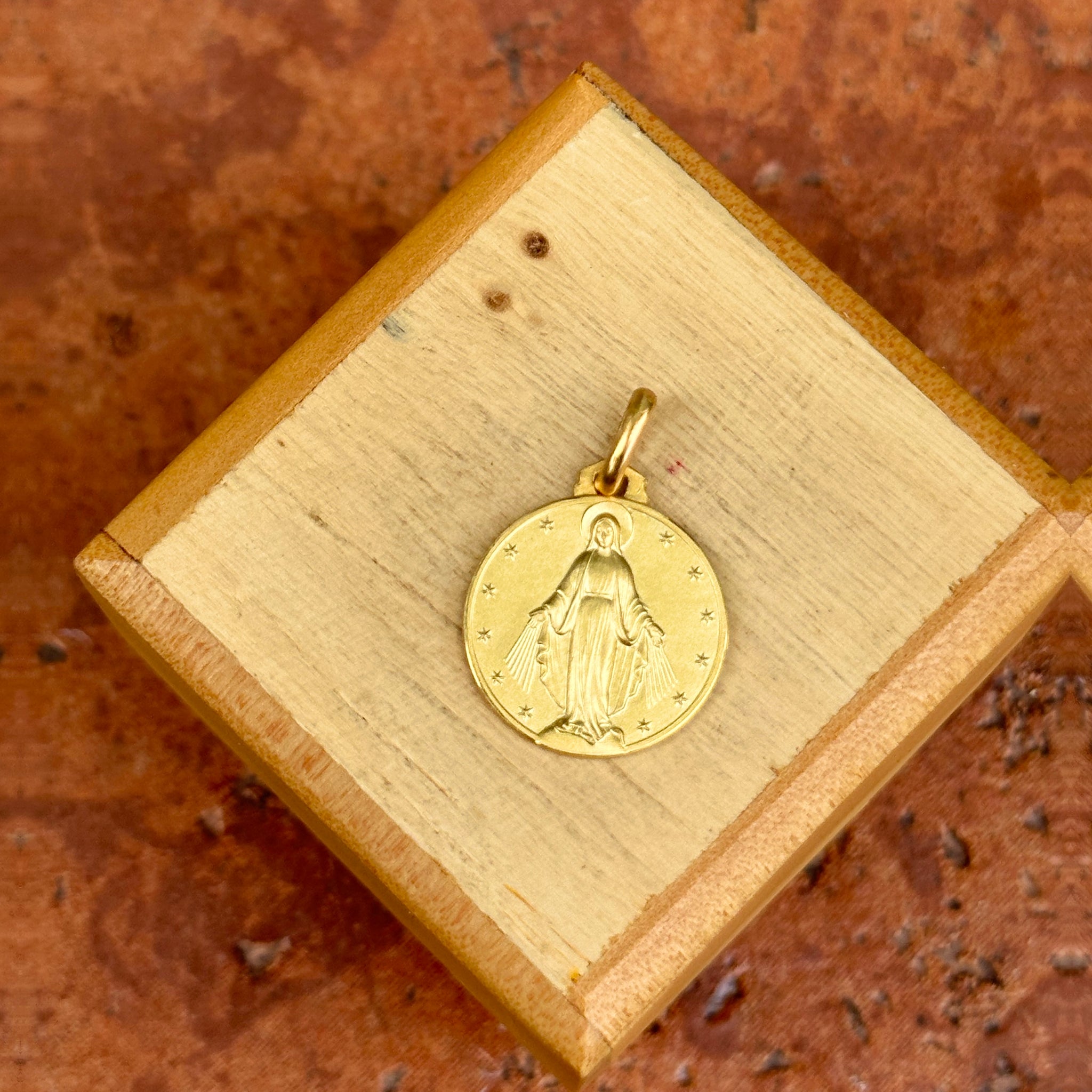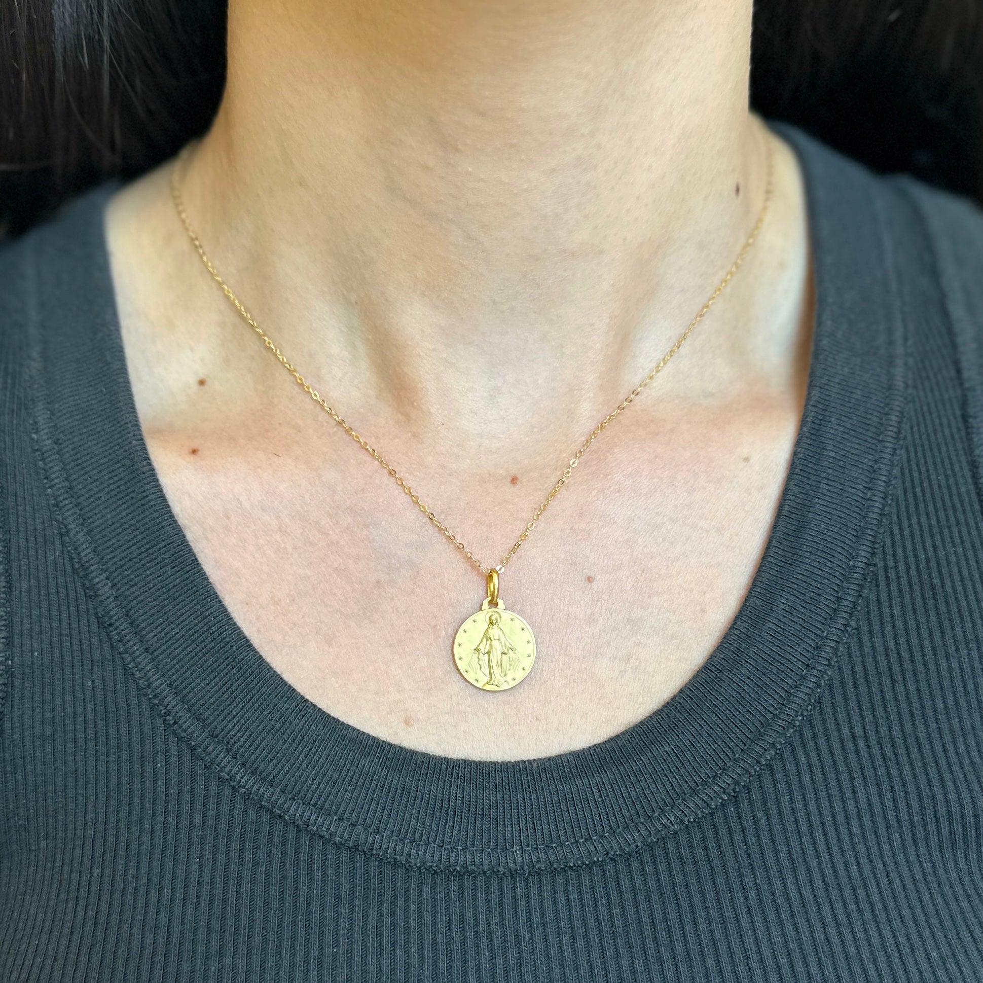 14KT yellow gold Miraculous Mary Medal round medal pendant charm in a matte-finish.