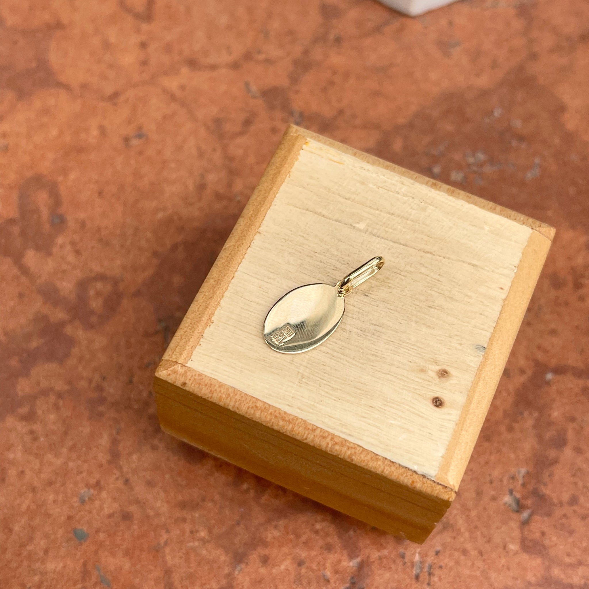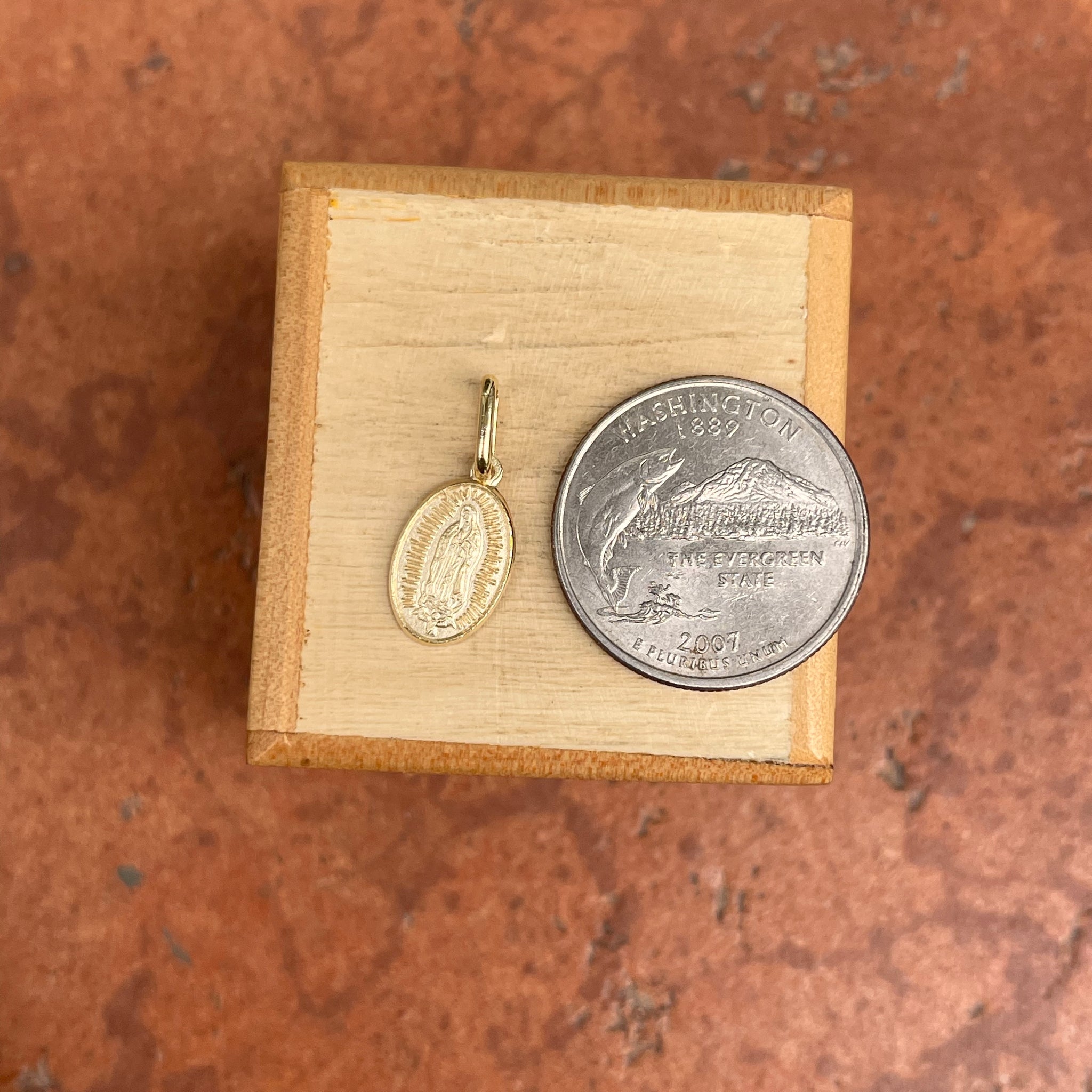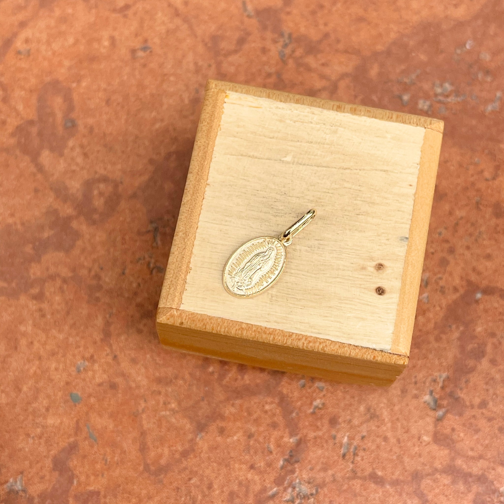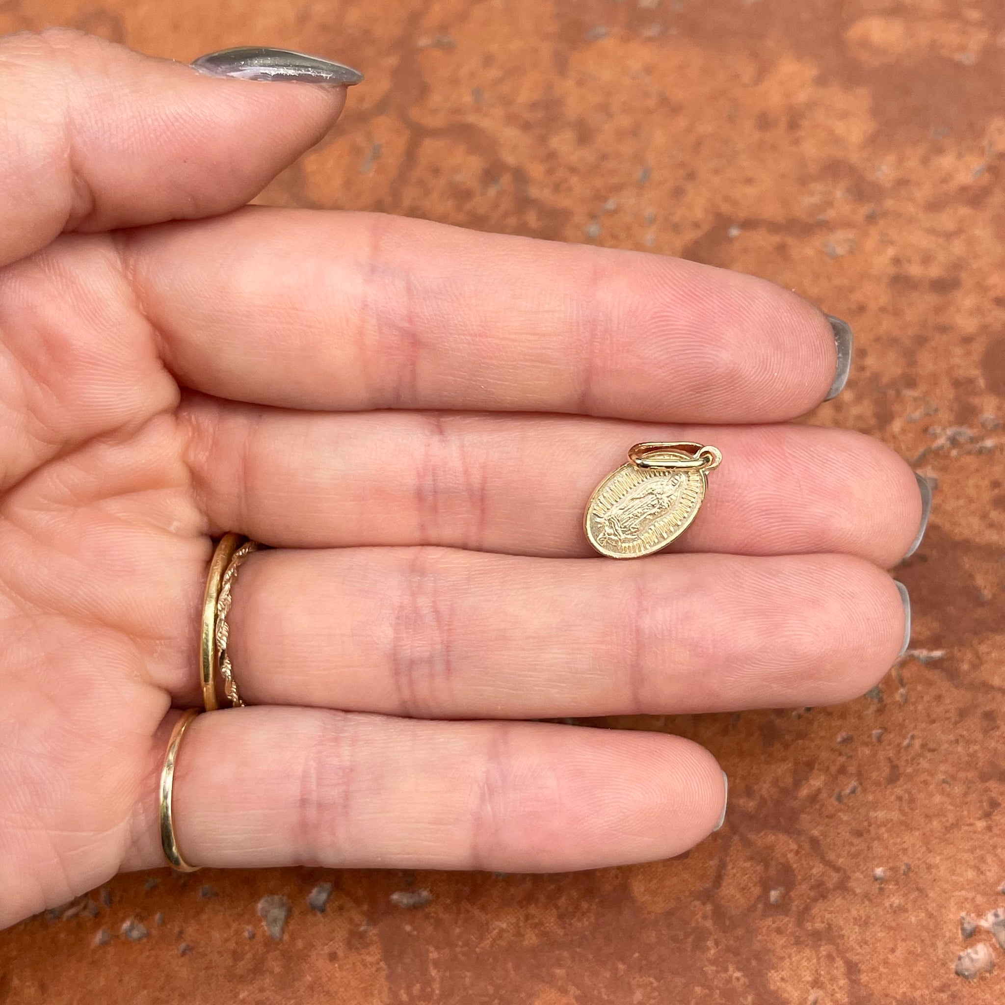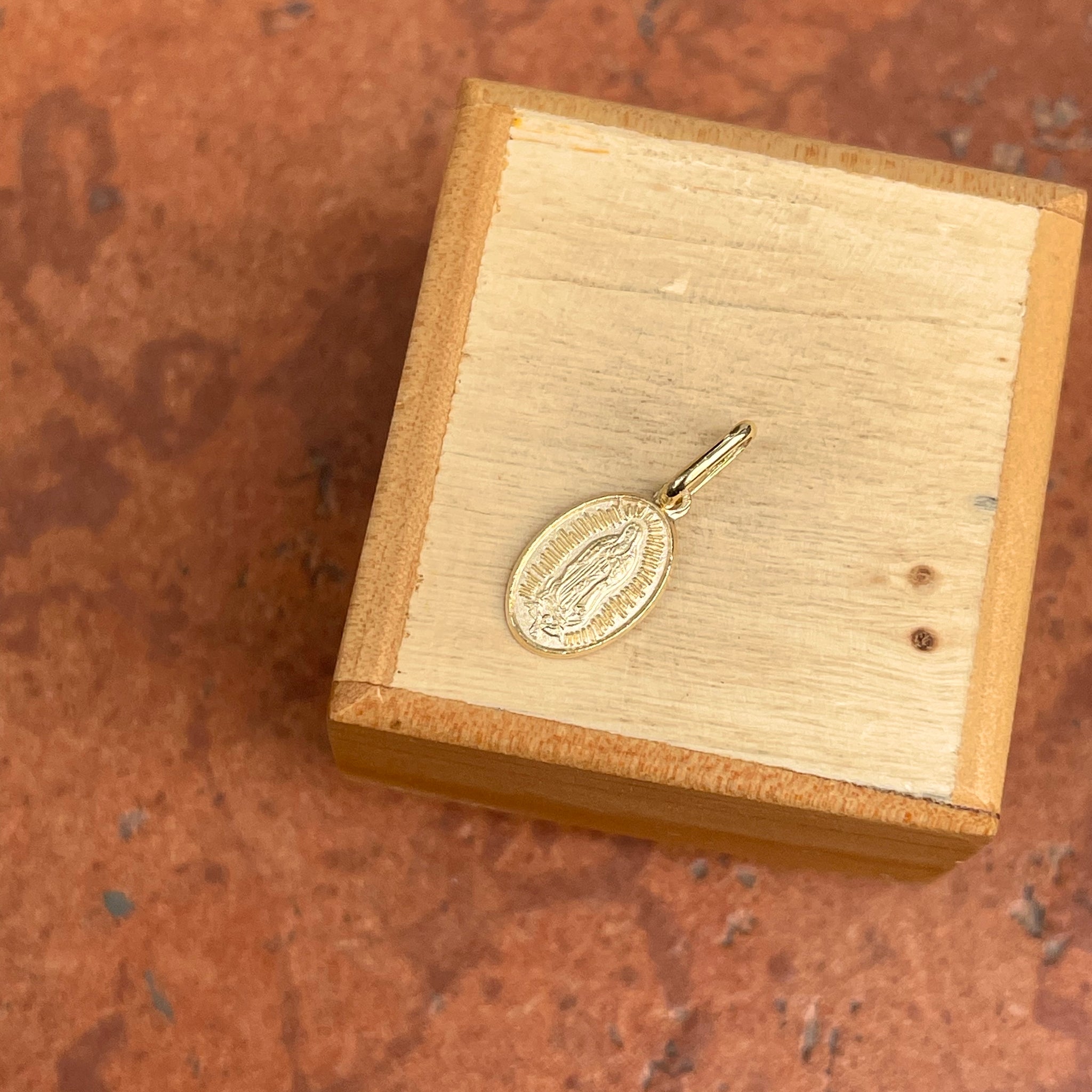 14K yellow gold matte textured design Our Lady of Guadalupe/ Mother Mary oval pendant charm. Slide this pendant on a yellow gold chain necklace to complete the look!