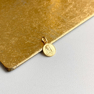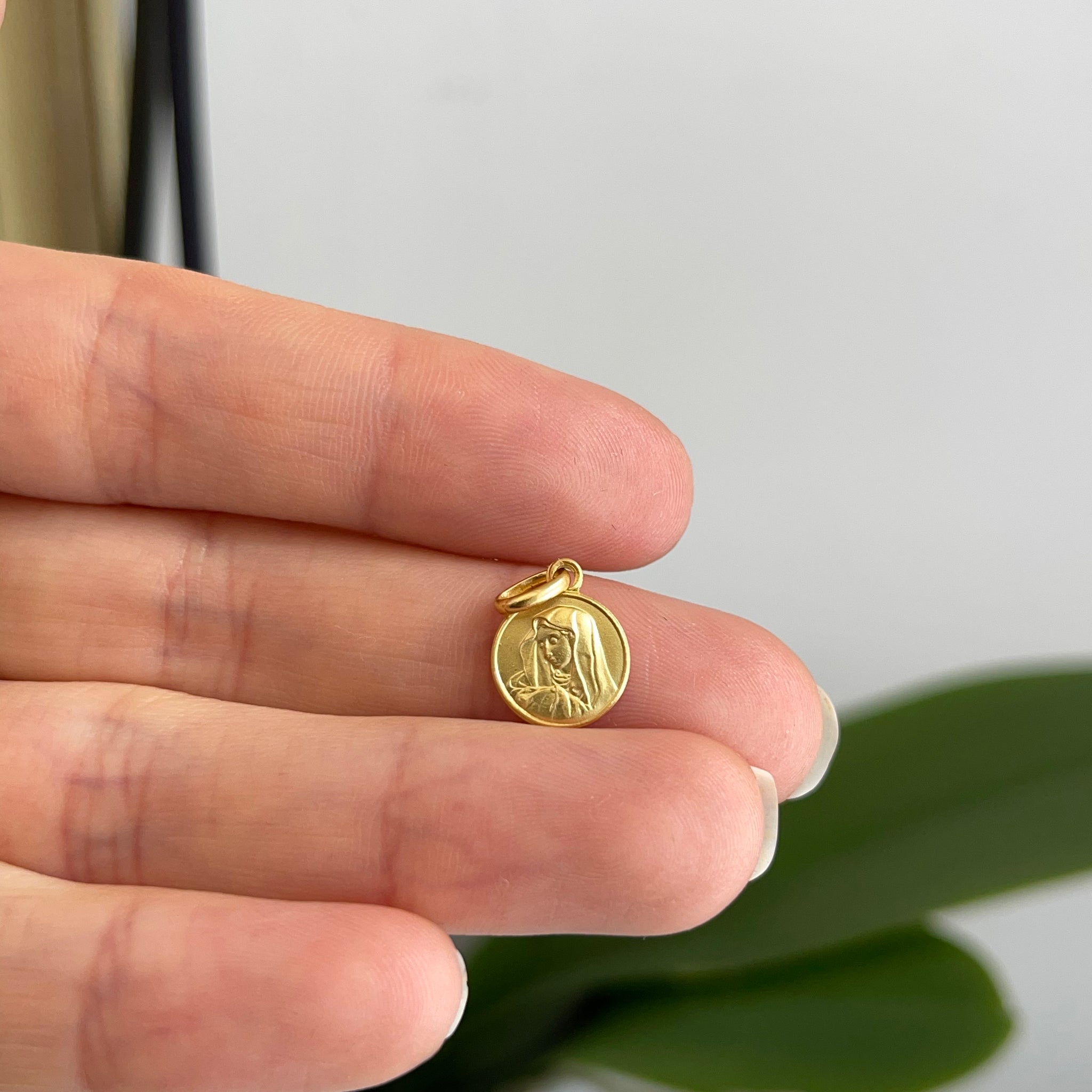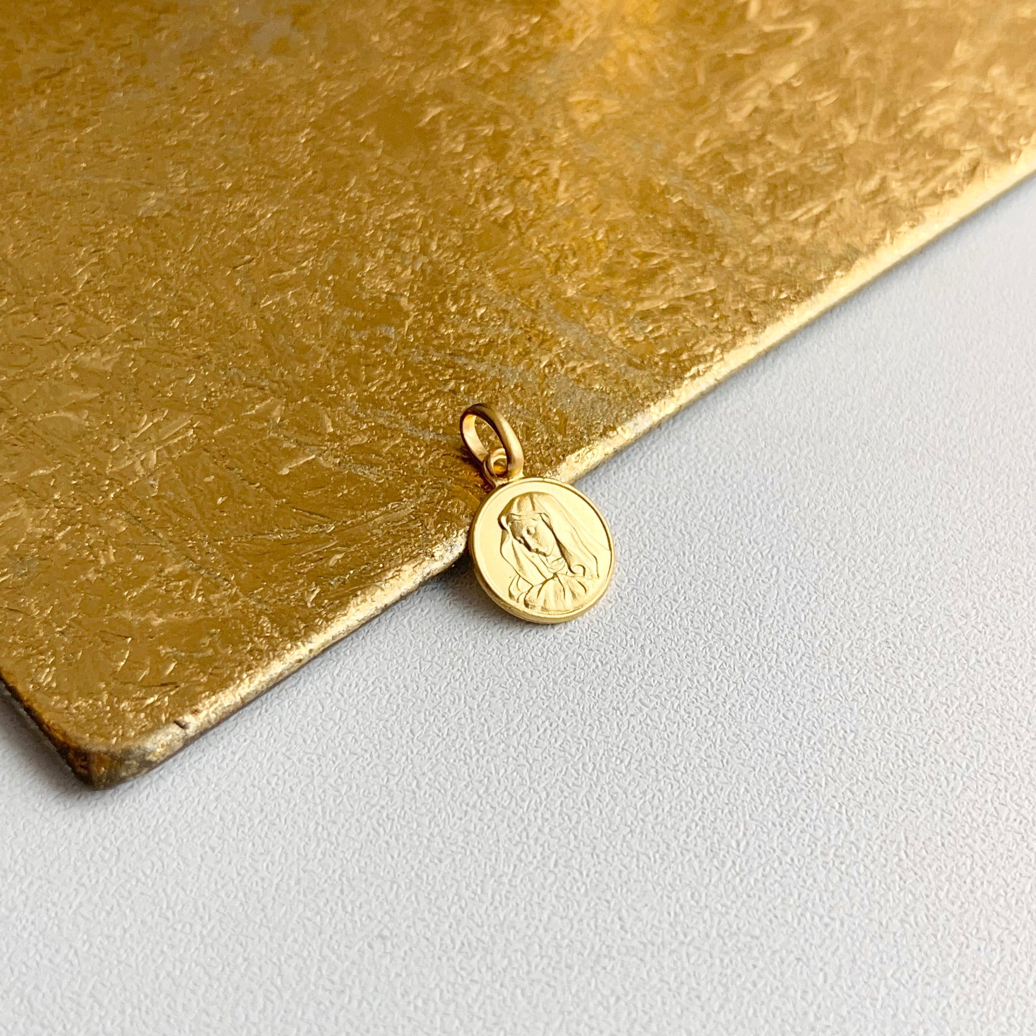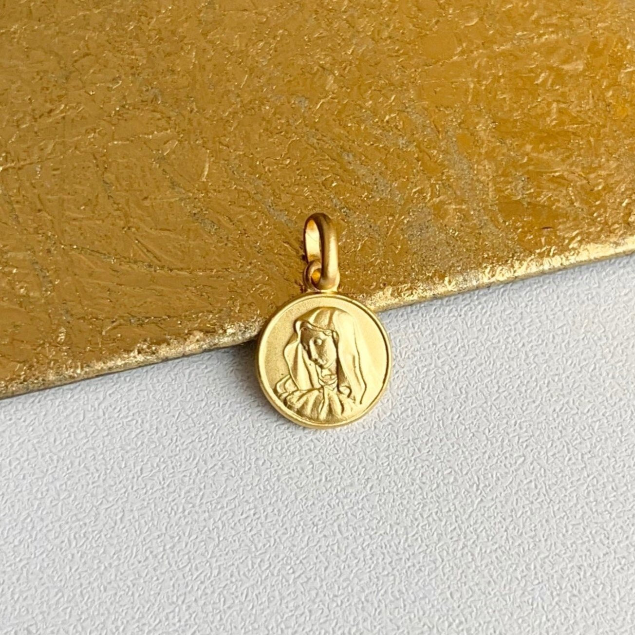 14KT yellow gold matte-finish Our Lady of Sorrows round medal pendant charm.