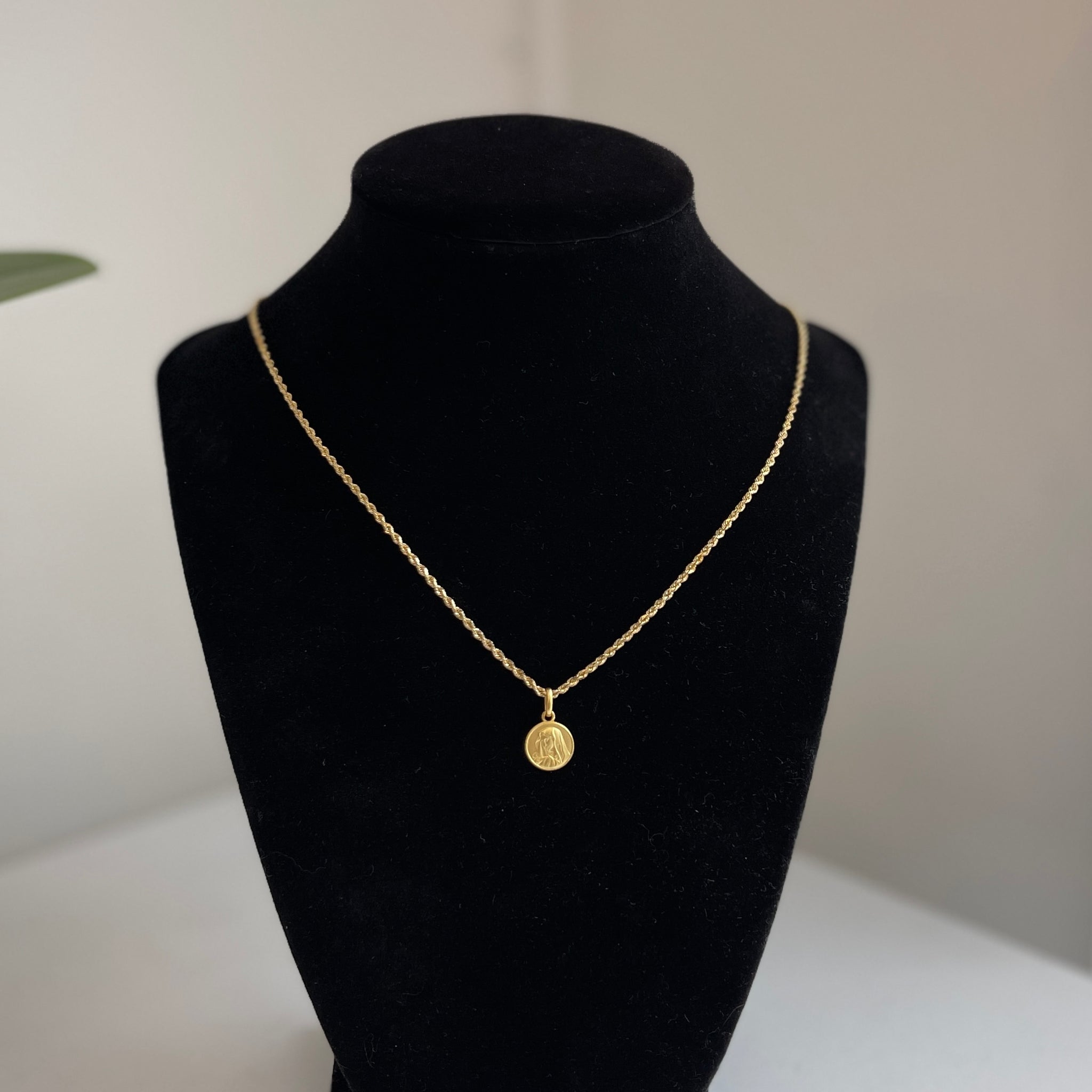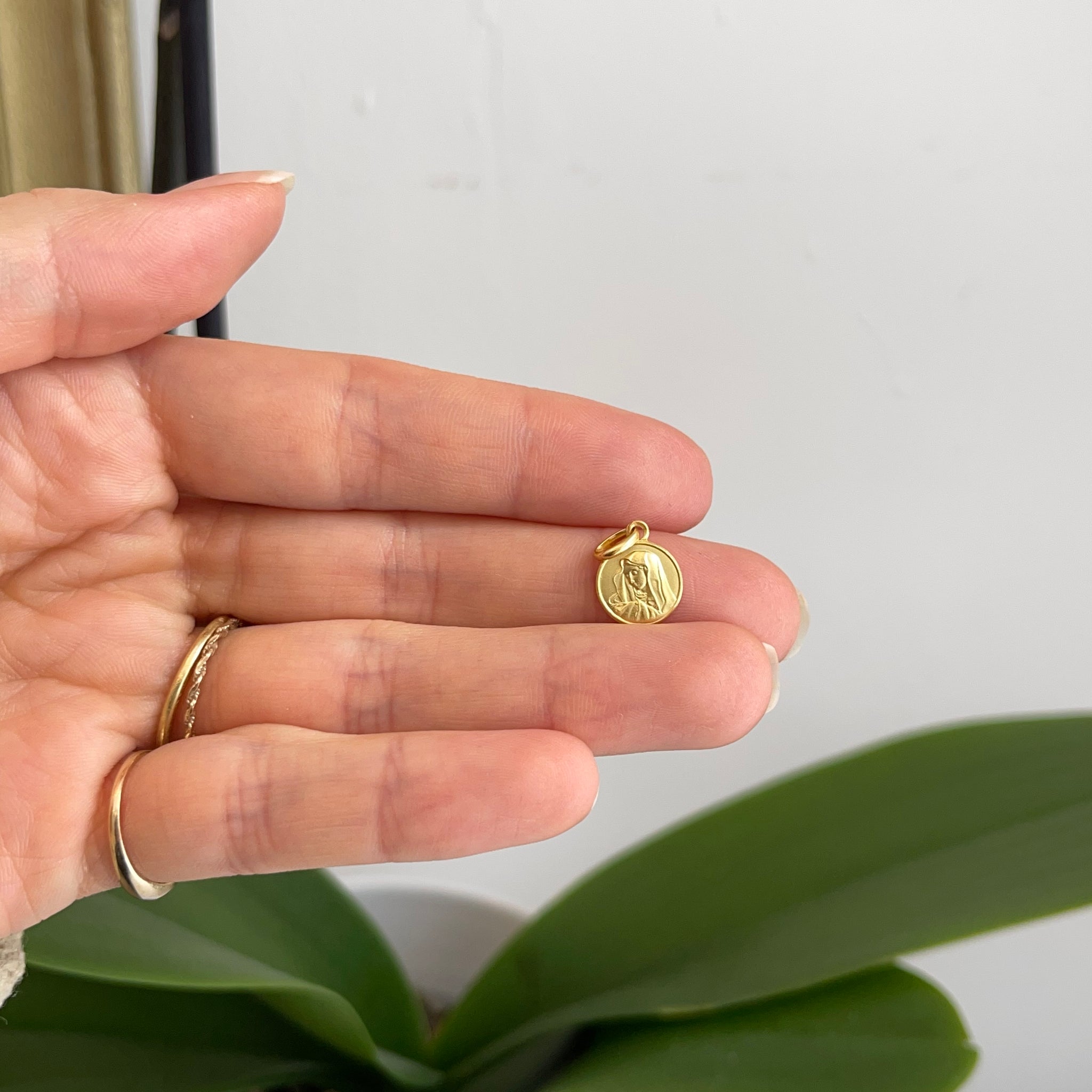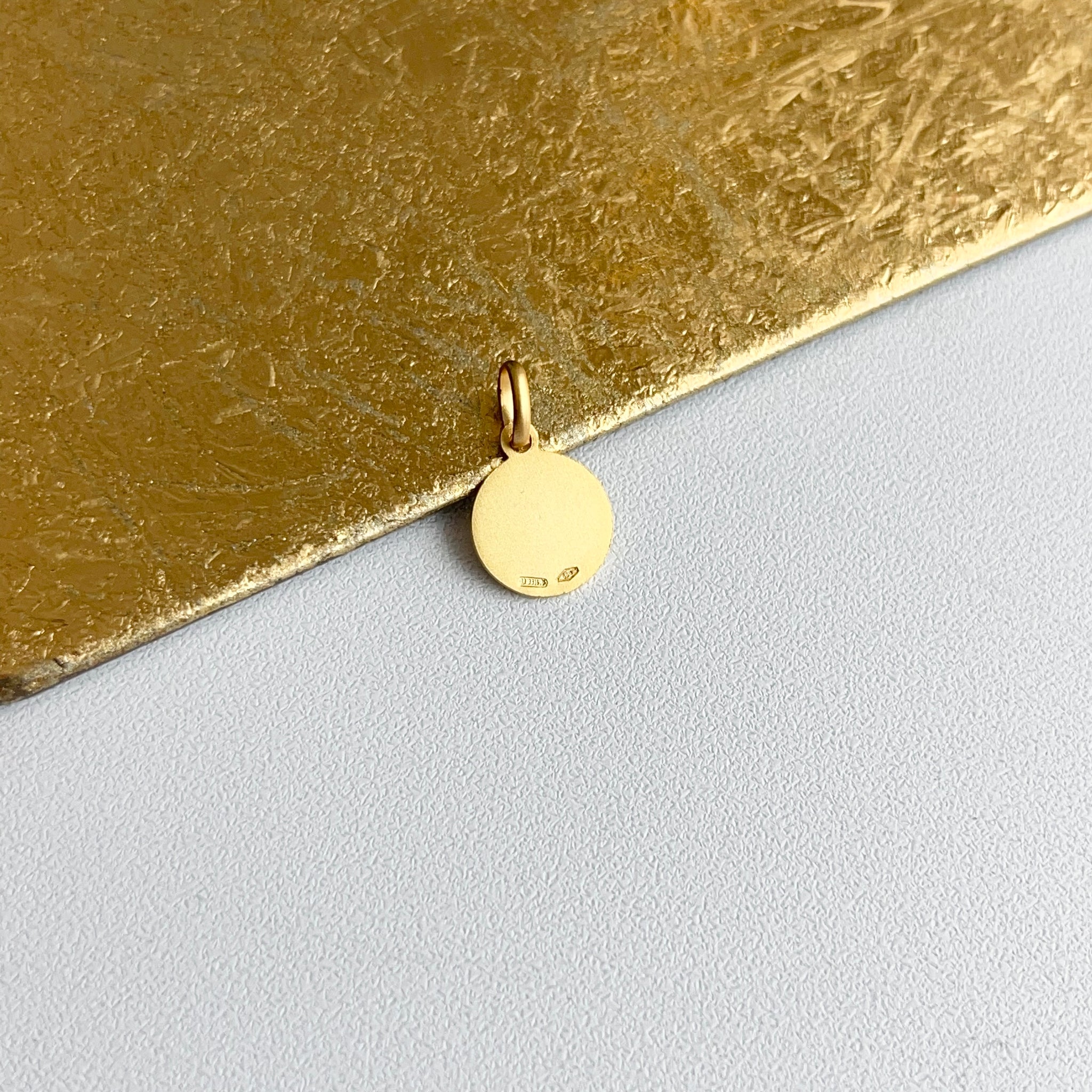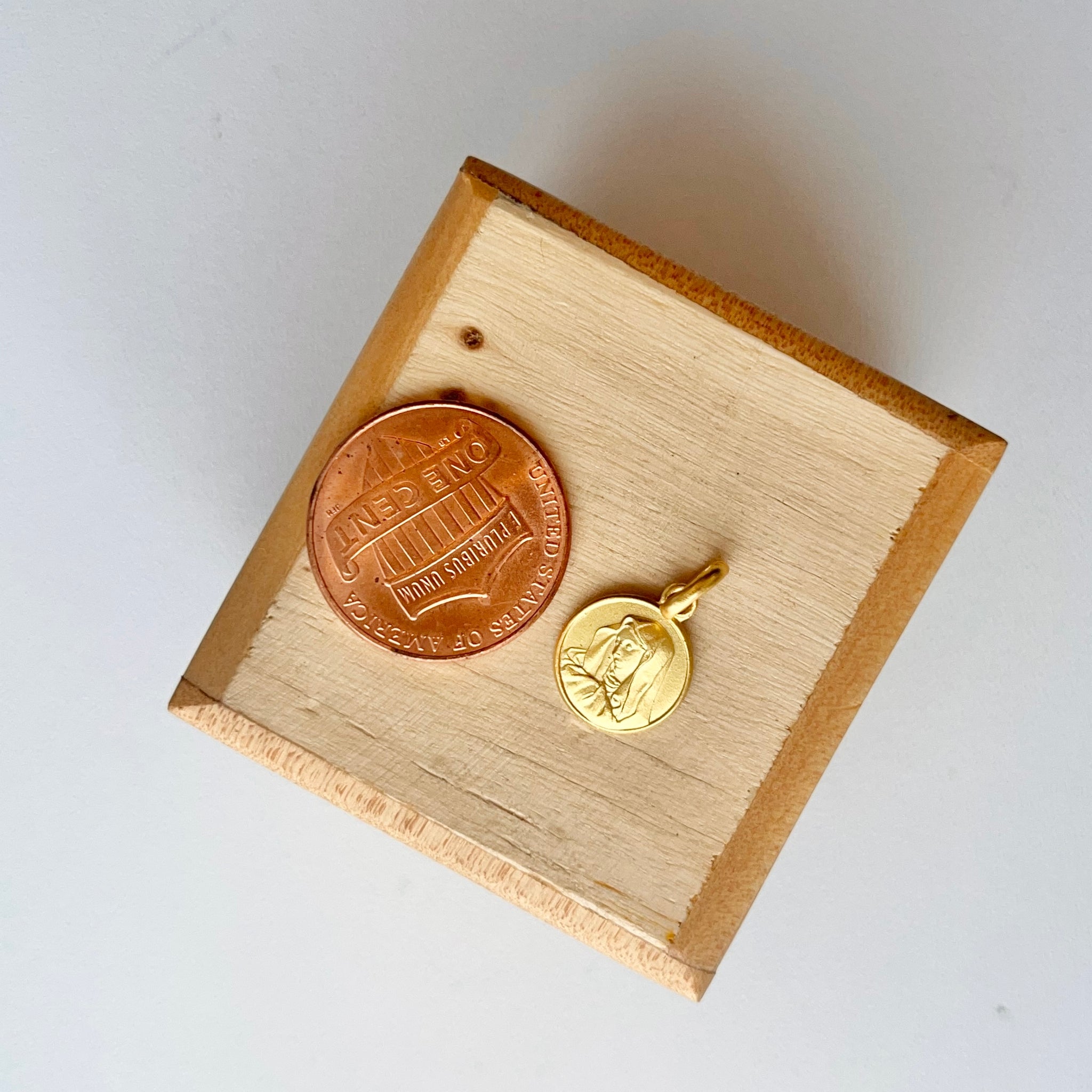 14KT yellow gold matte-finish Our Lady of Sorrows round medal pendant charm.