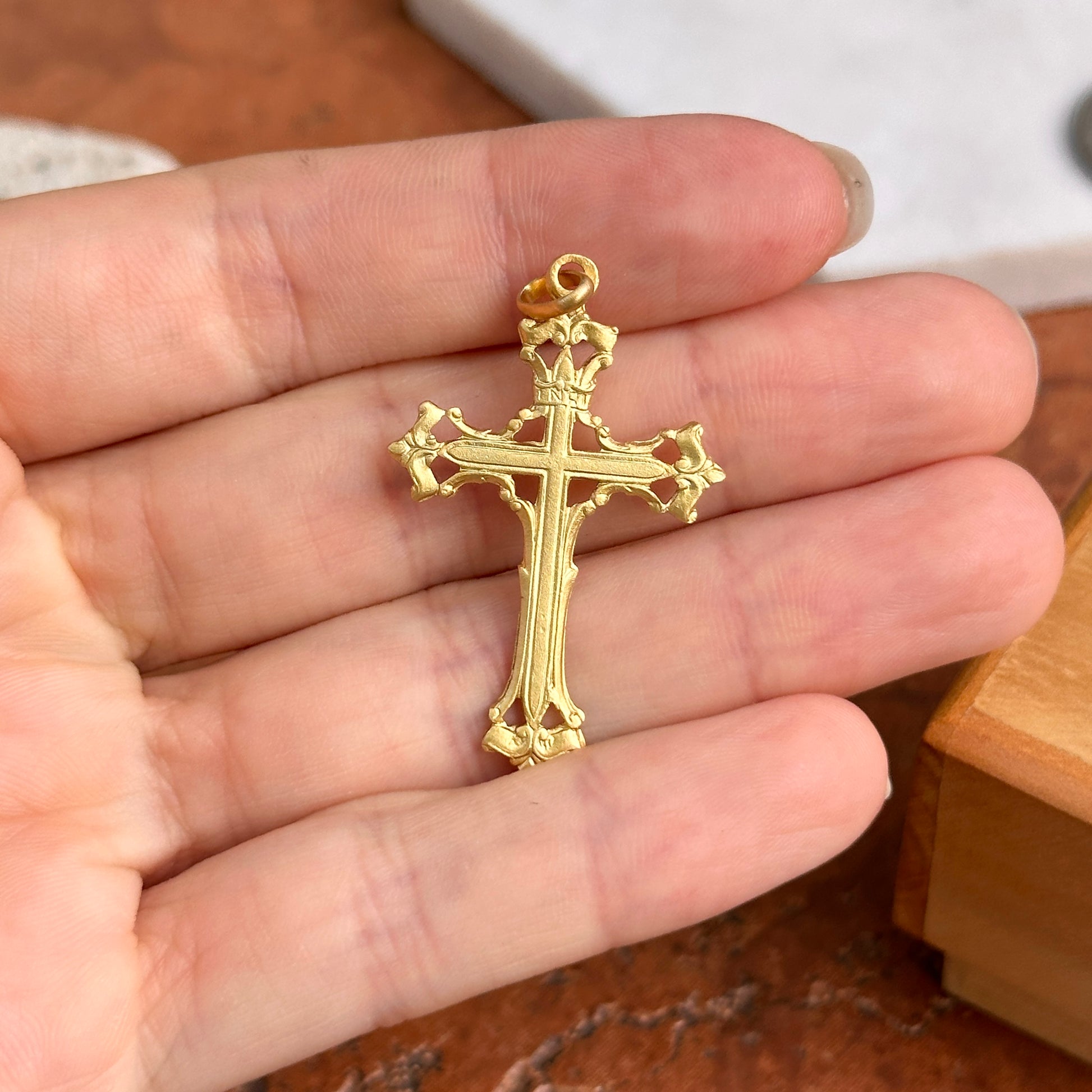 Matte-Finished 14KT Yellow Gold INRI Cross Pendant with Filigree Destialing