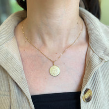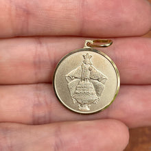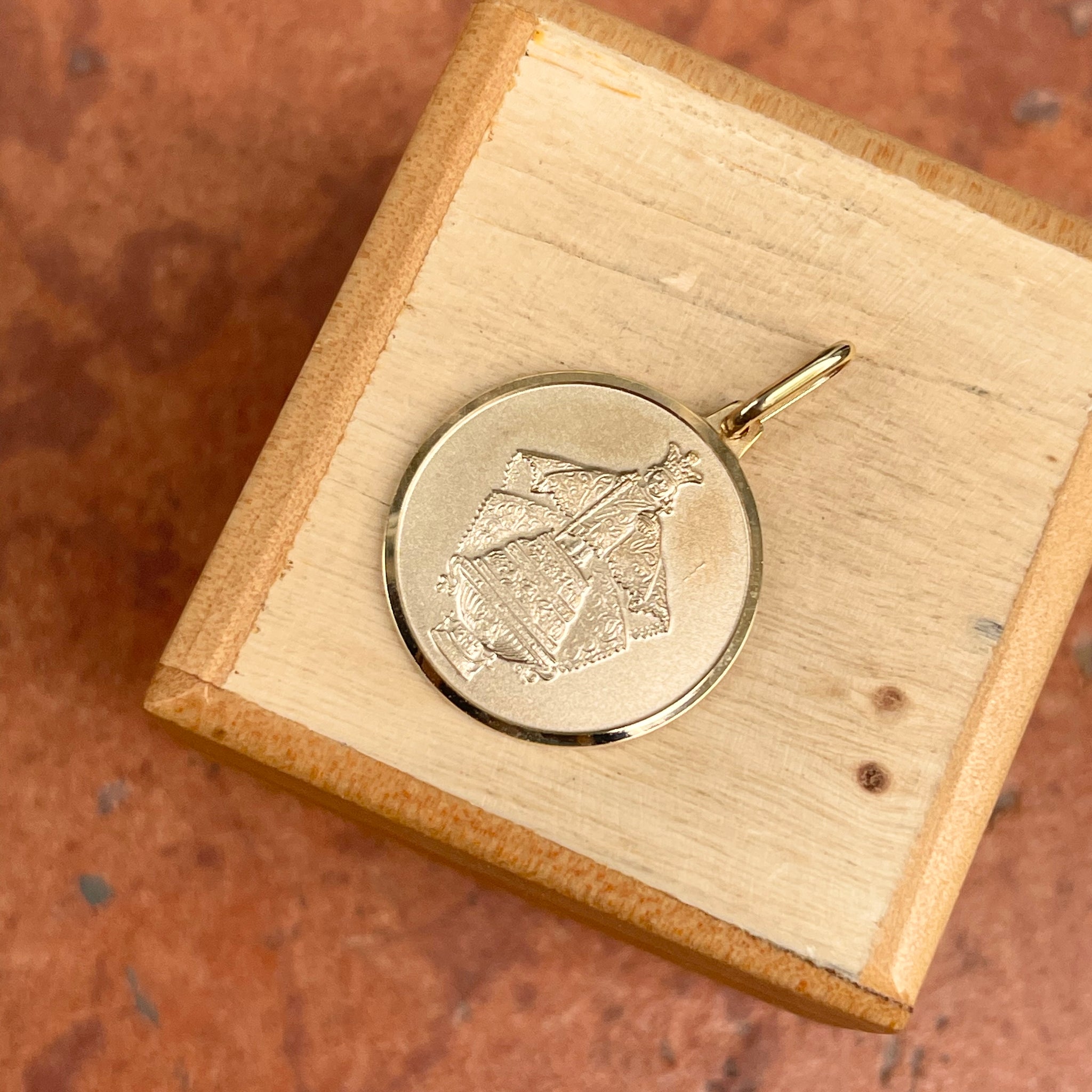14KT yellow gold matte-finish Saint Nino round medal pendant. St. Nino is the patron saint of prisoners and pilgrims.
