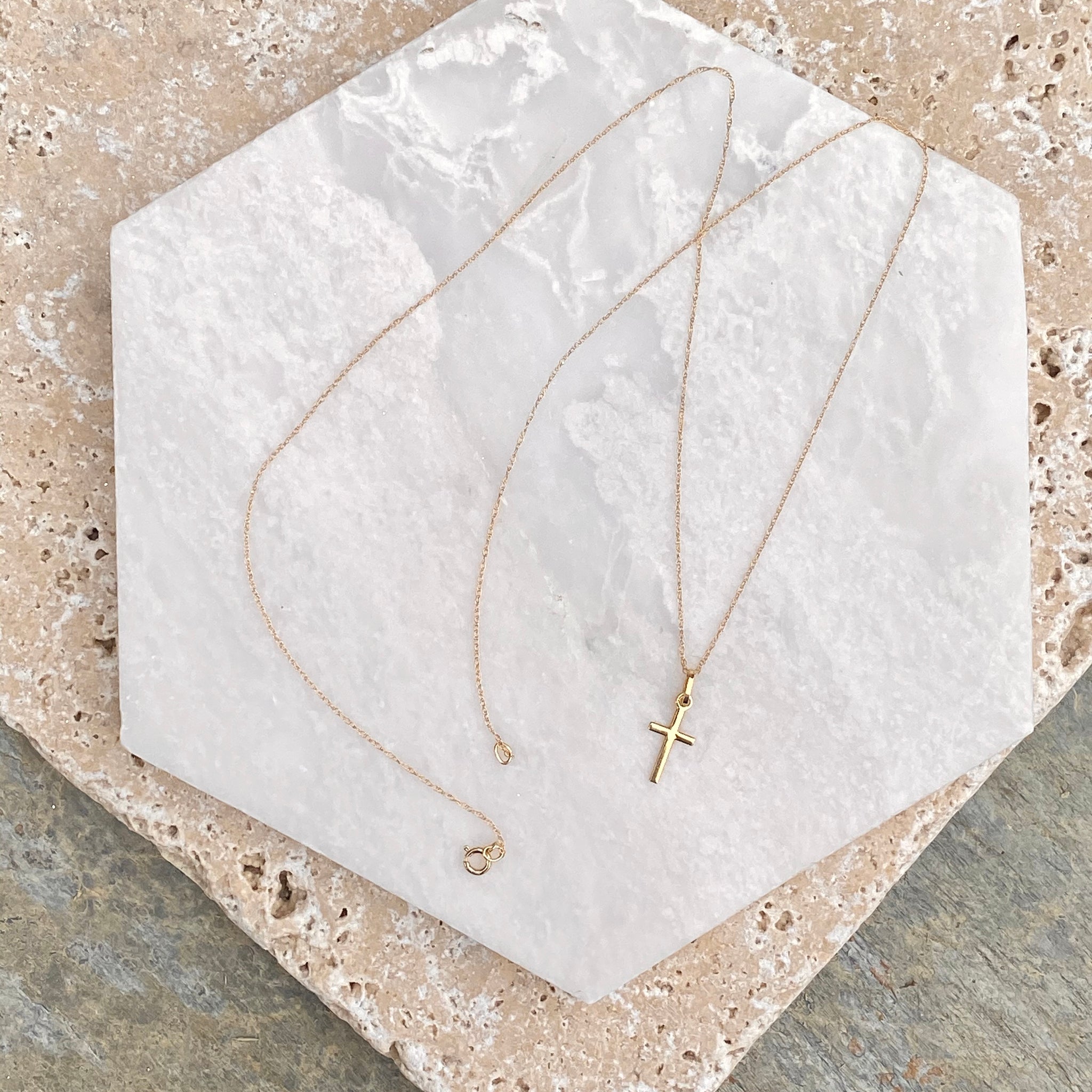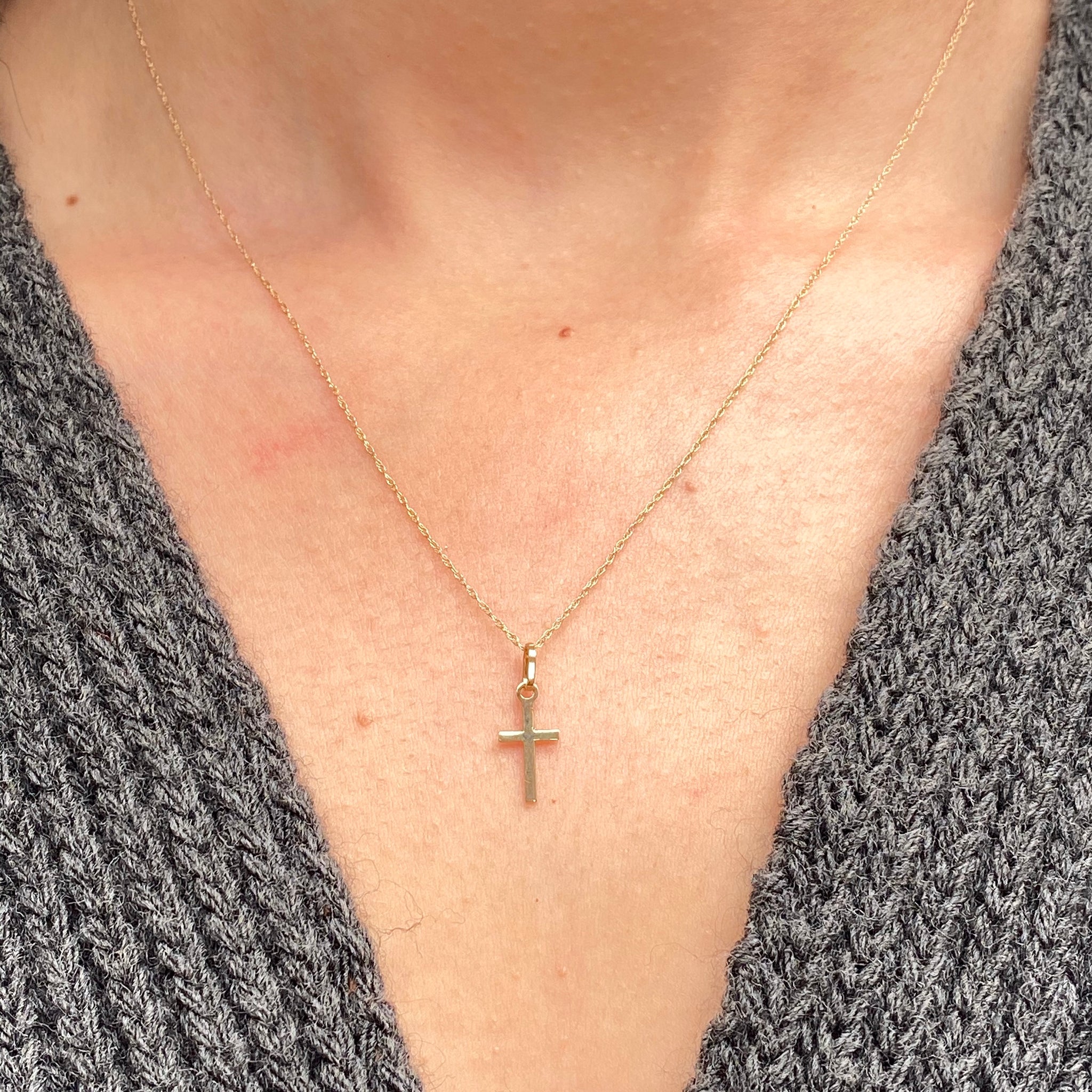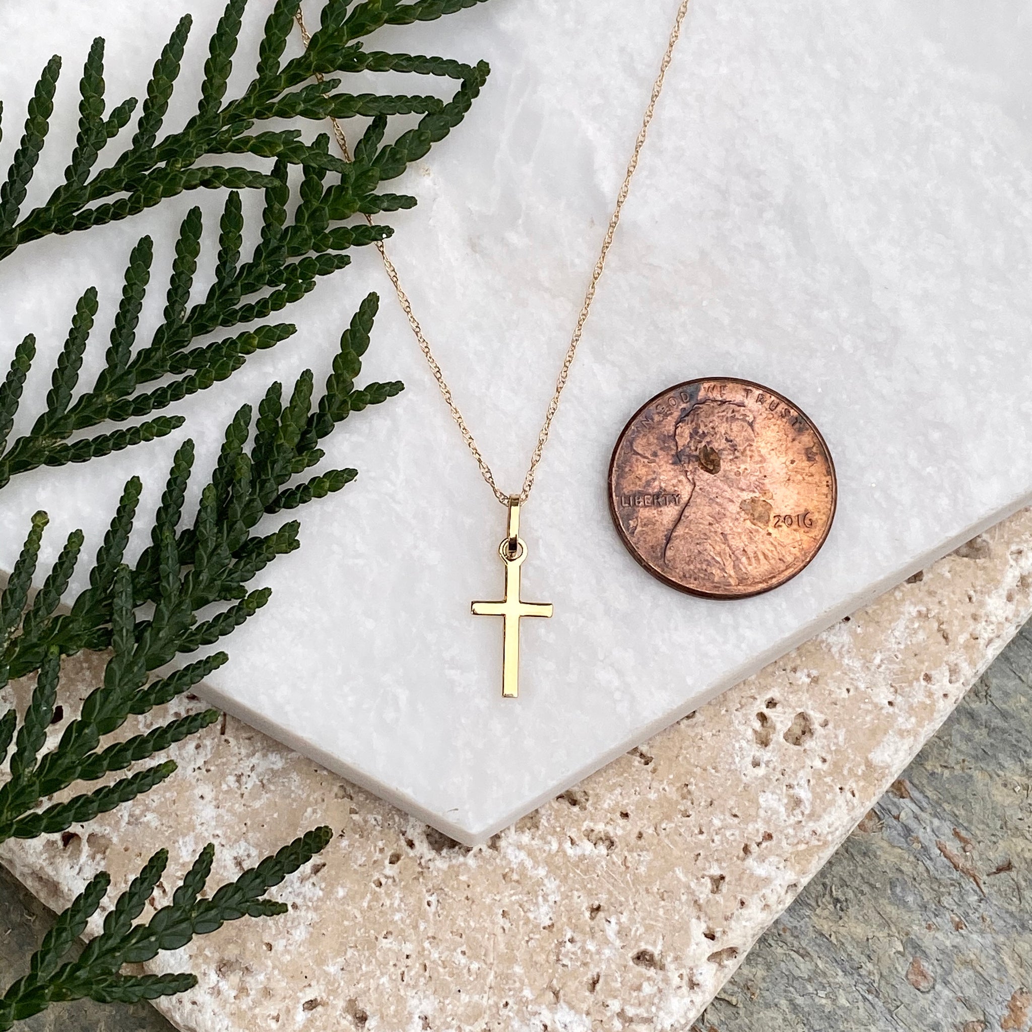 14KT yellow gold mini size cross pendant charm on a thin, 14KT yellow gold cable chain necklace. This pretty cross chain necklace makes a perfect holiday/ Christmas gift!