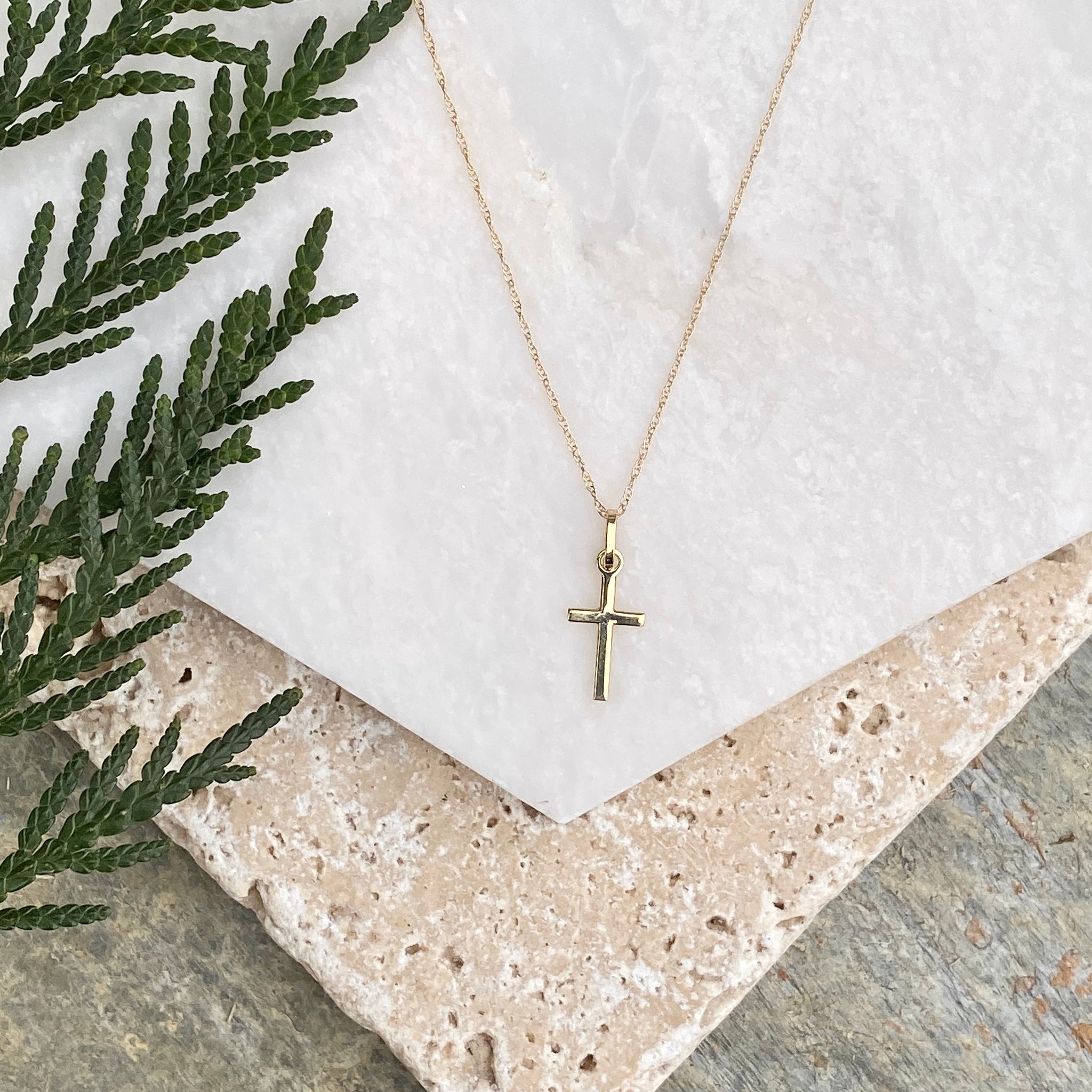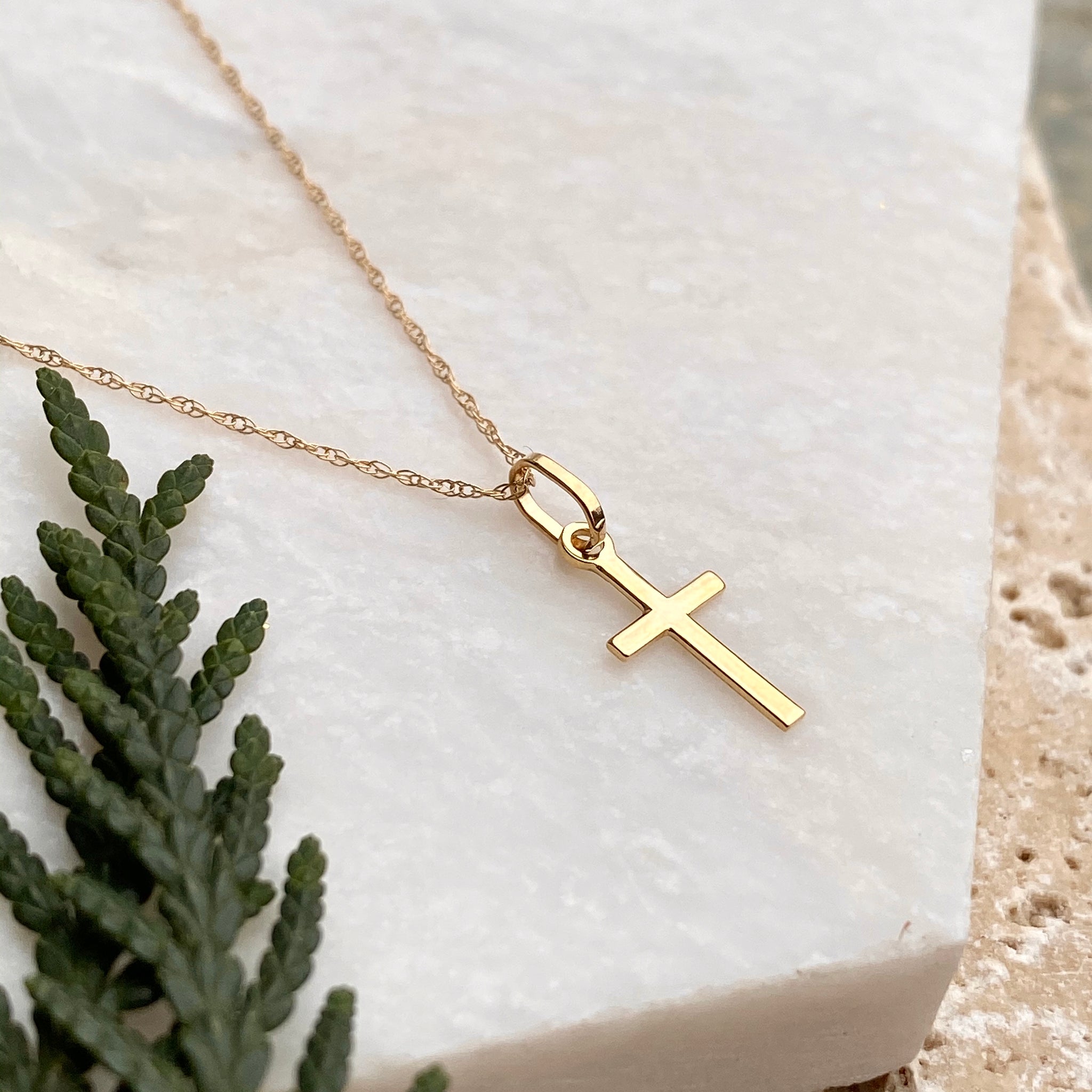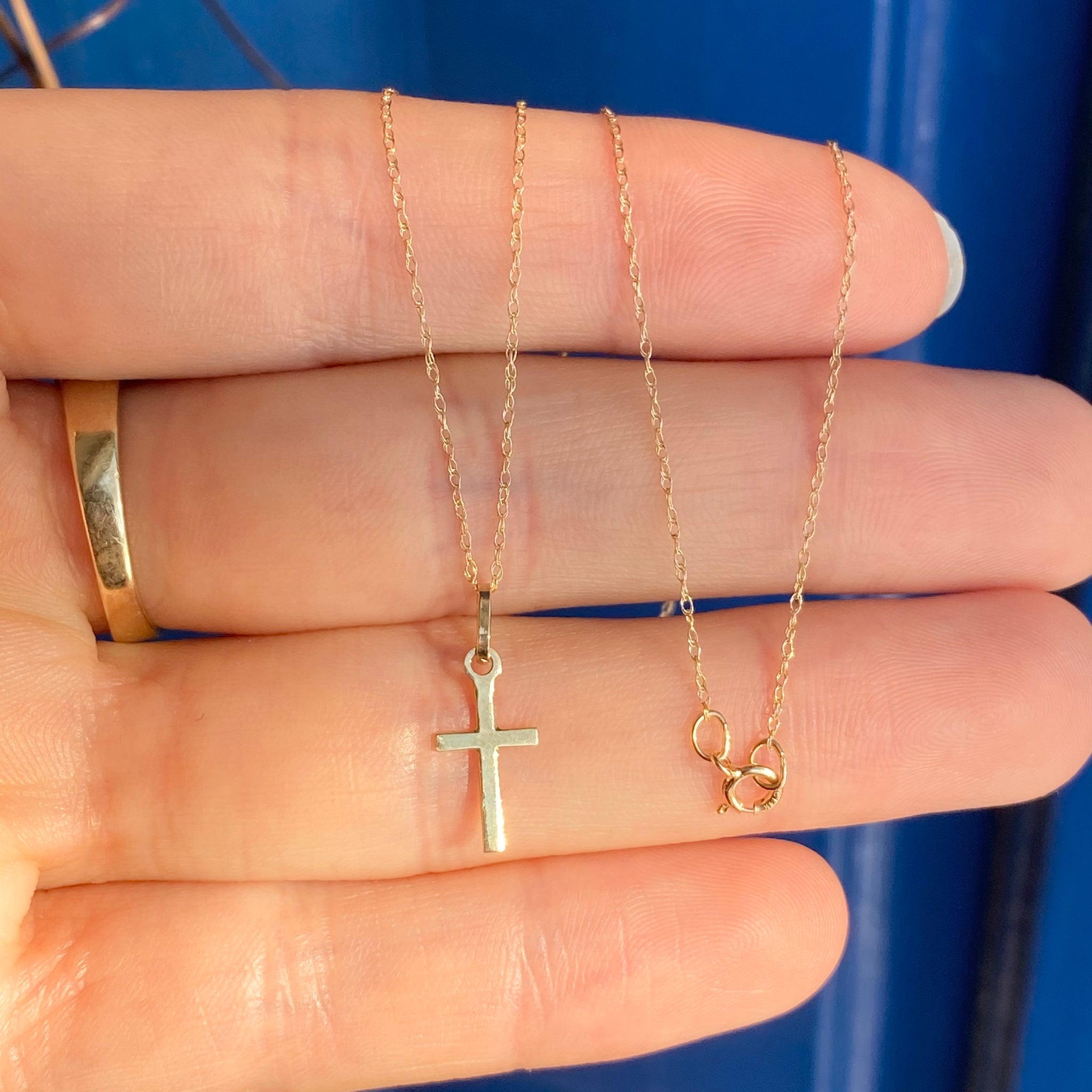 14KT yellow gold mini size cross pendant charm on a thin, 14KT yellow gold cable chain necklace. This pretty cross chain necklace makes a perfect holiday/ Christmas gift!