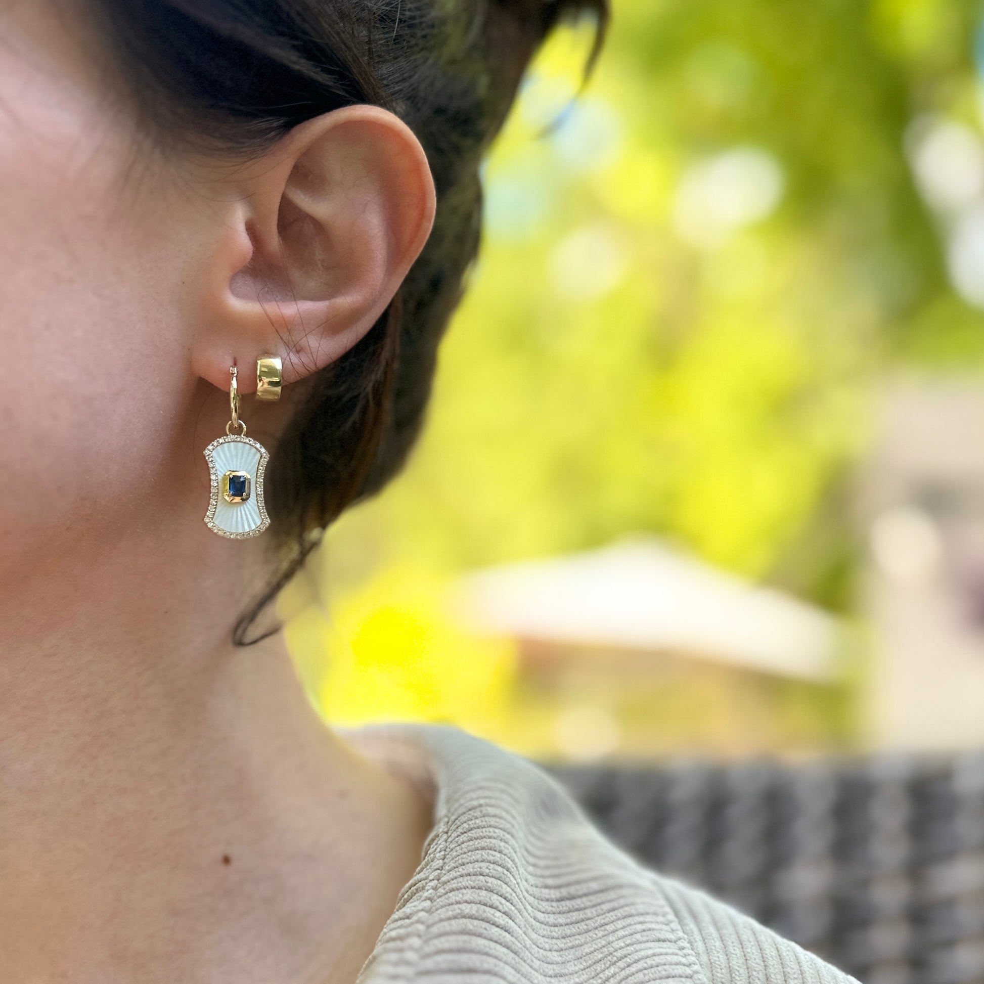 14K Yellow Gold Mother of Pearl Sapphire and Diamond Dangle Hoop Earrings