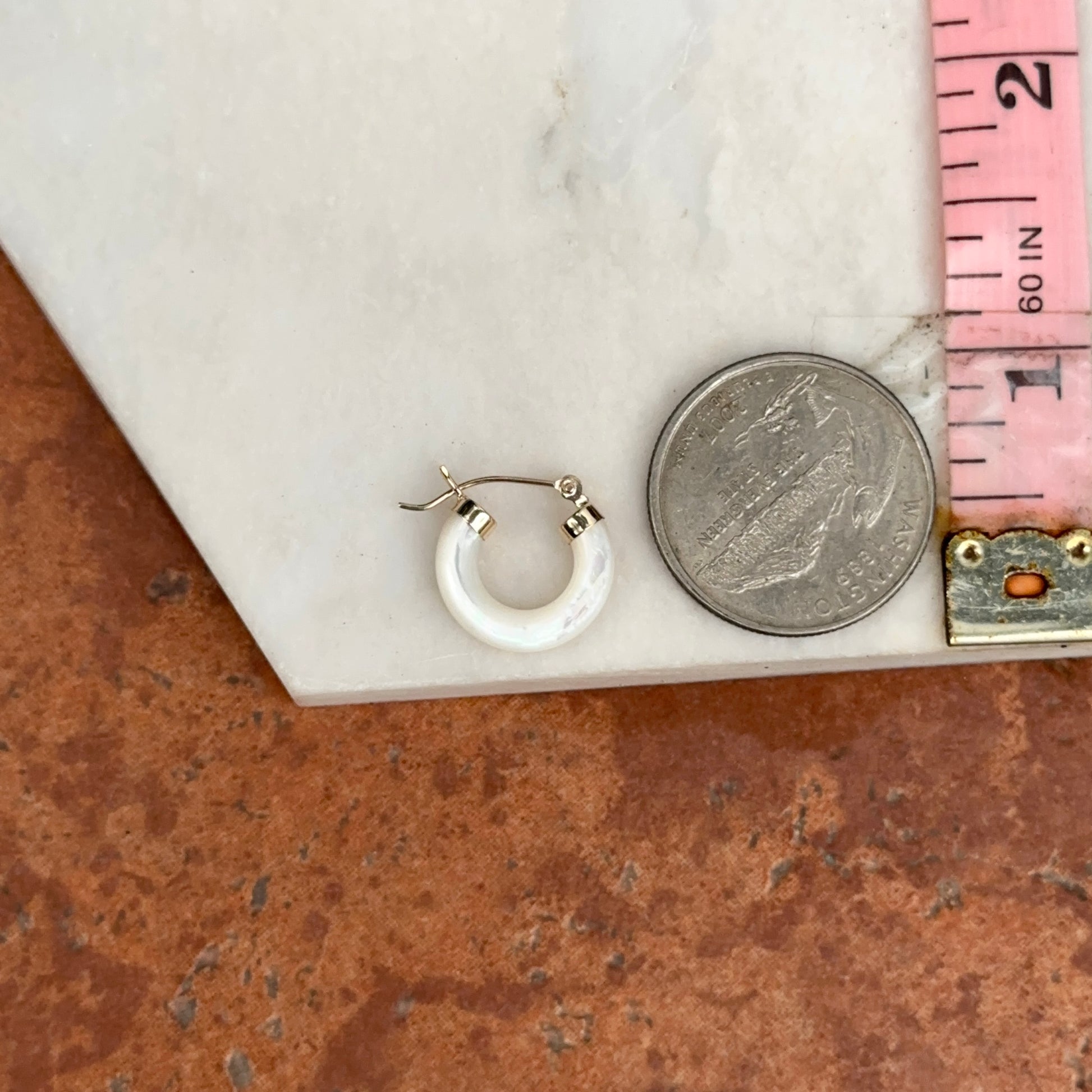 14K yellow gold genuine, white, mother of pearl tube round hoop earrings. Hoop tubes are full pearl! Super unique gemstone hoops!