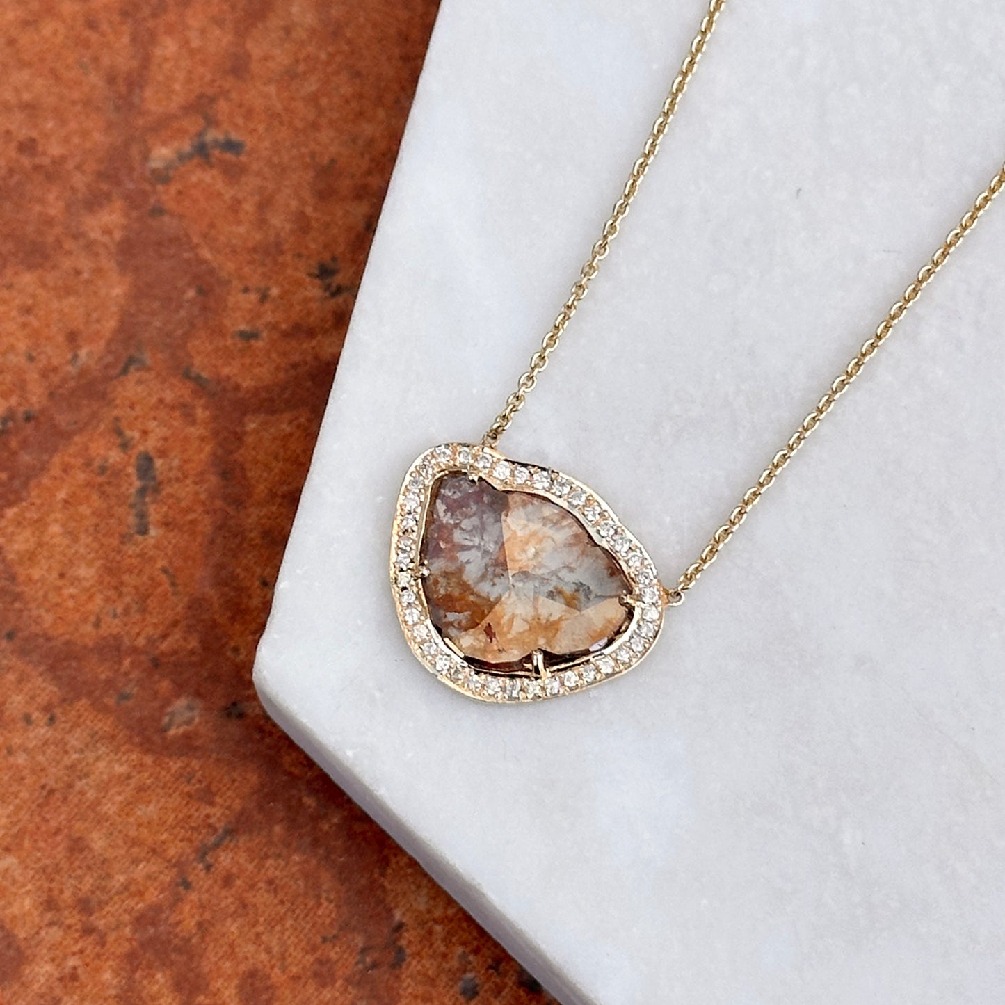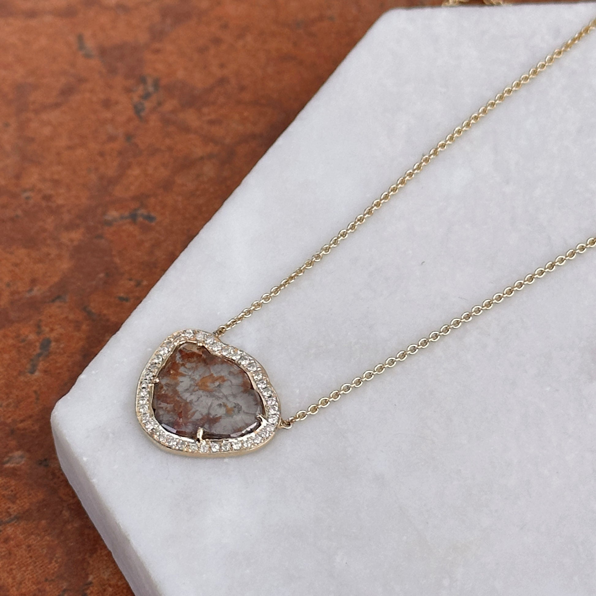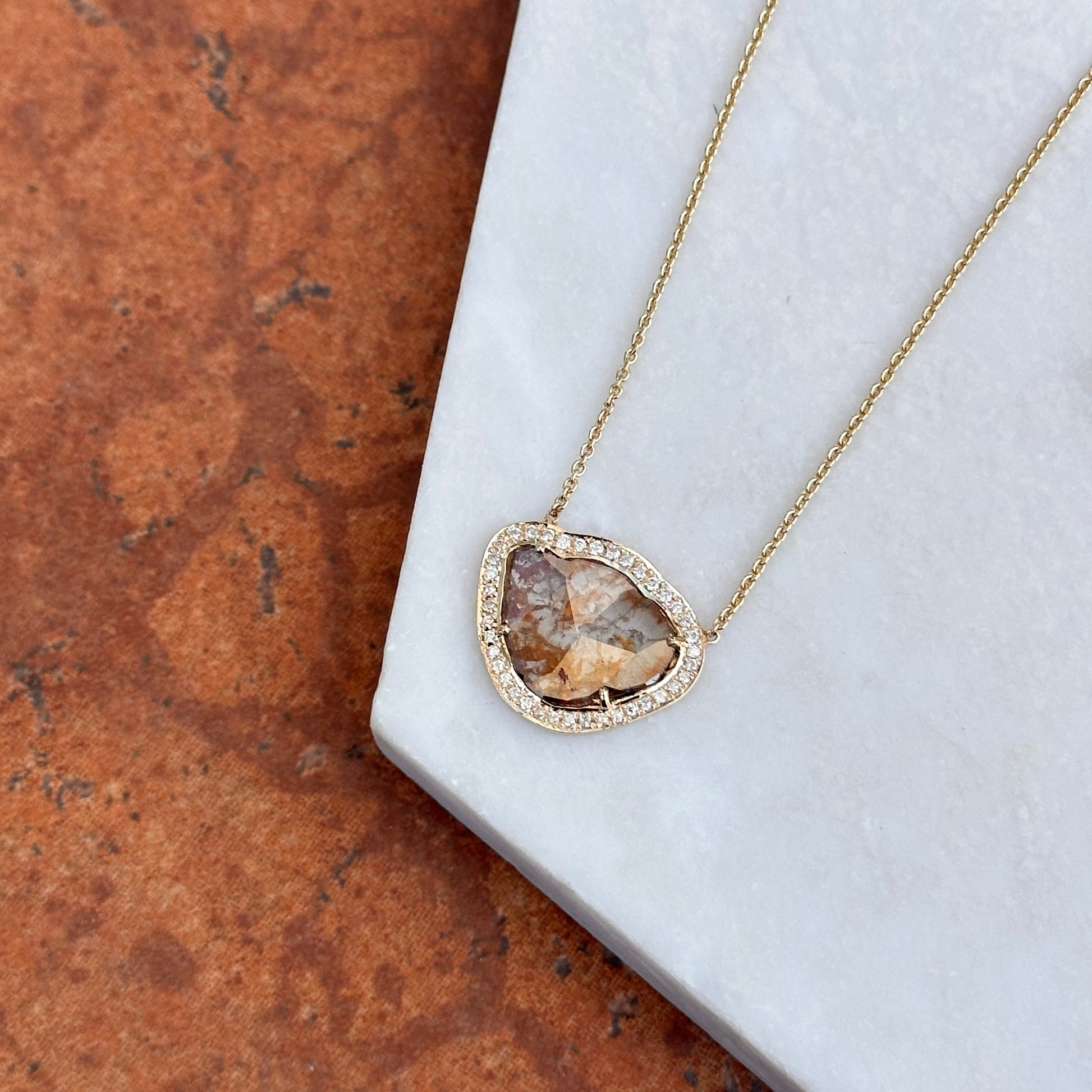 14KT Yellow Gold Multi Color Diamond Slice Center + Diamond halo Necklace