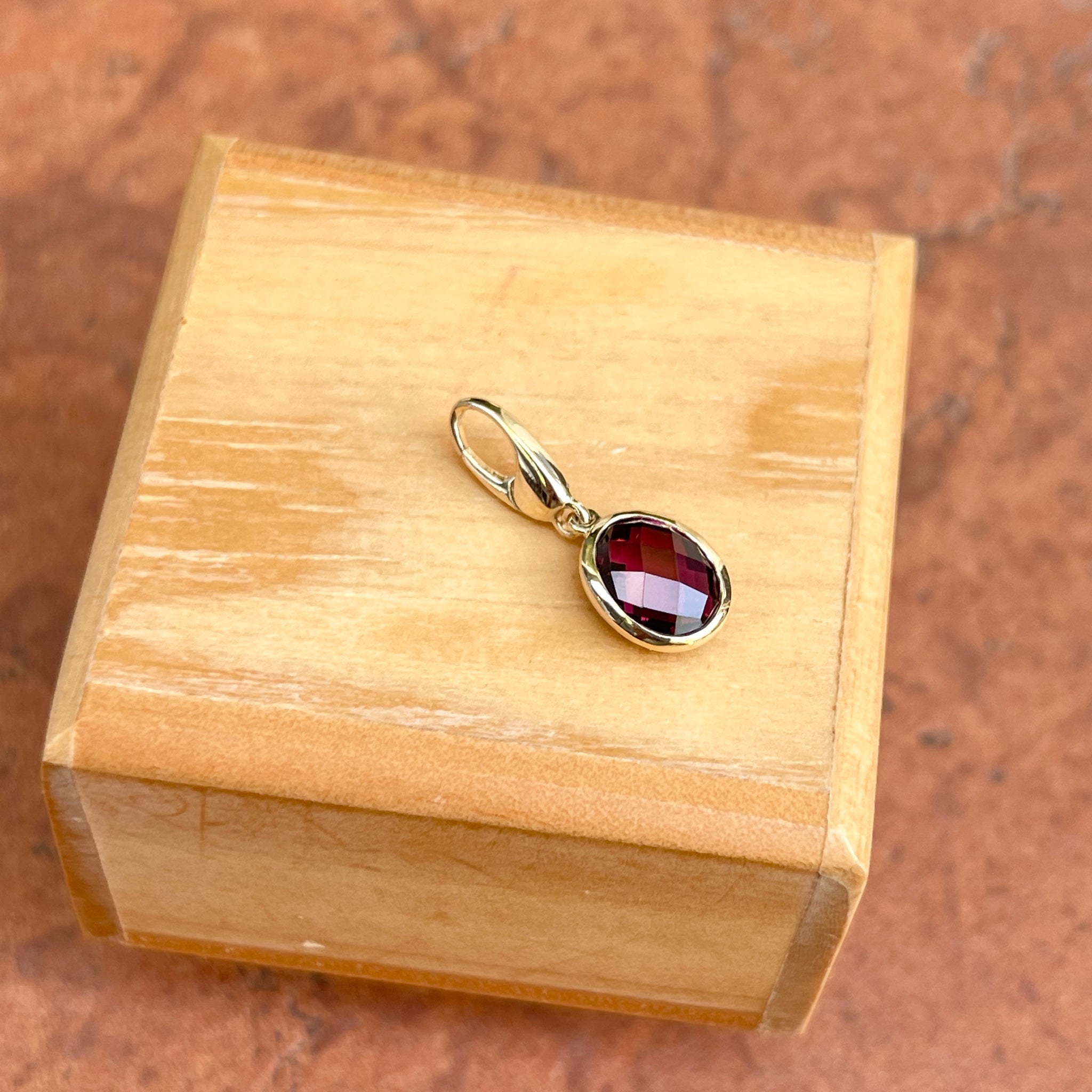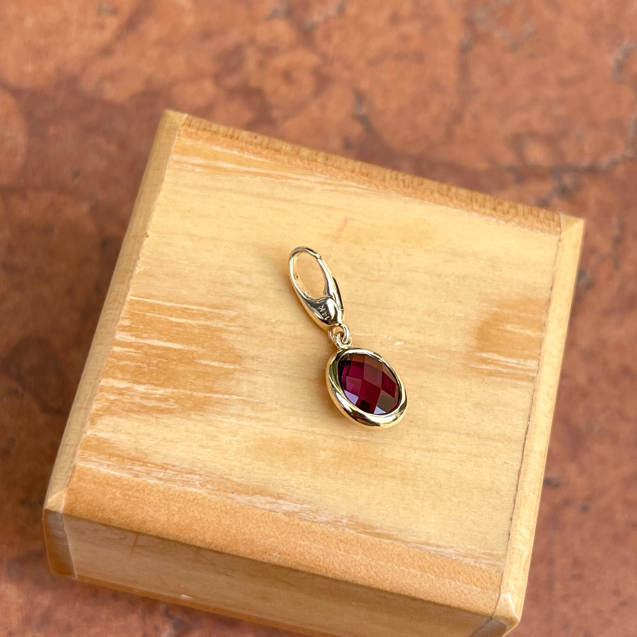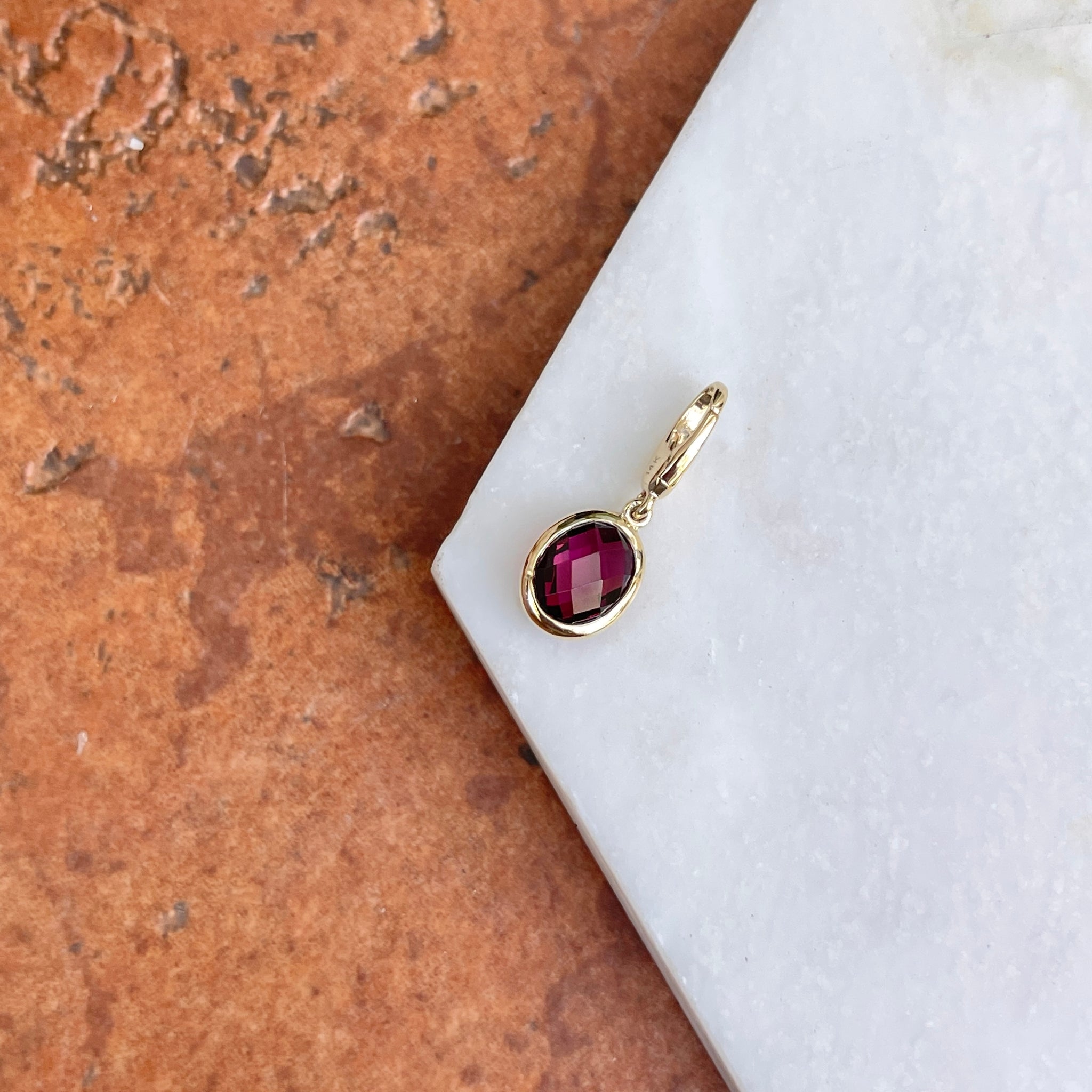 14KT yellow gold genuine, oval, bezel-set, rhodolite garnet omega clip pendant. Features a fabulous checkerboard, faceted, raspberry rhodolite garnet gemstone.