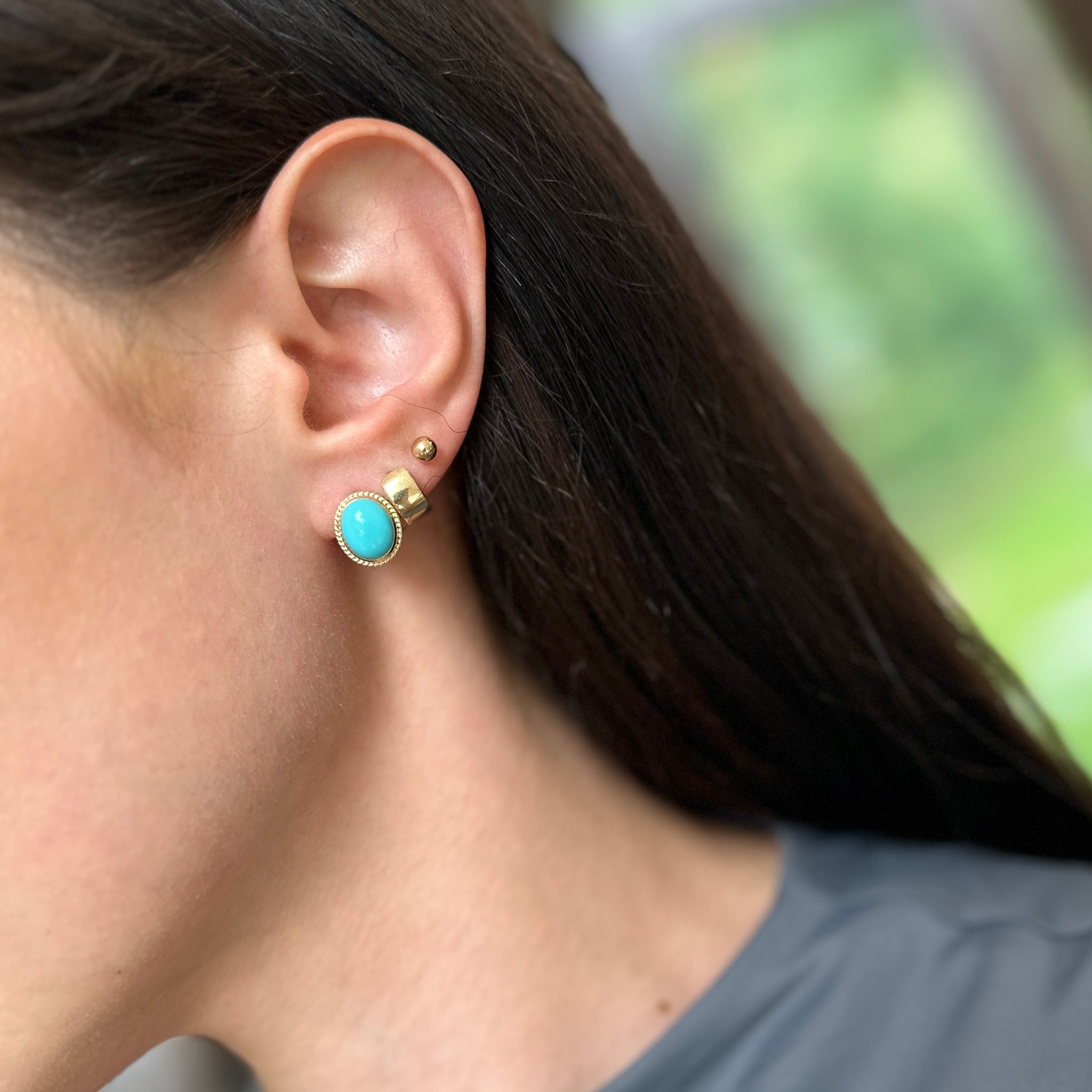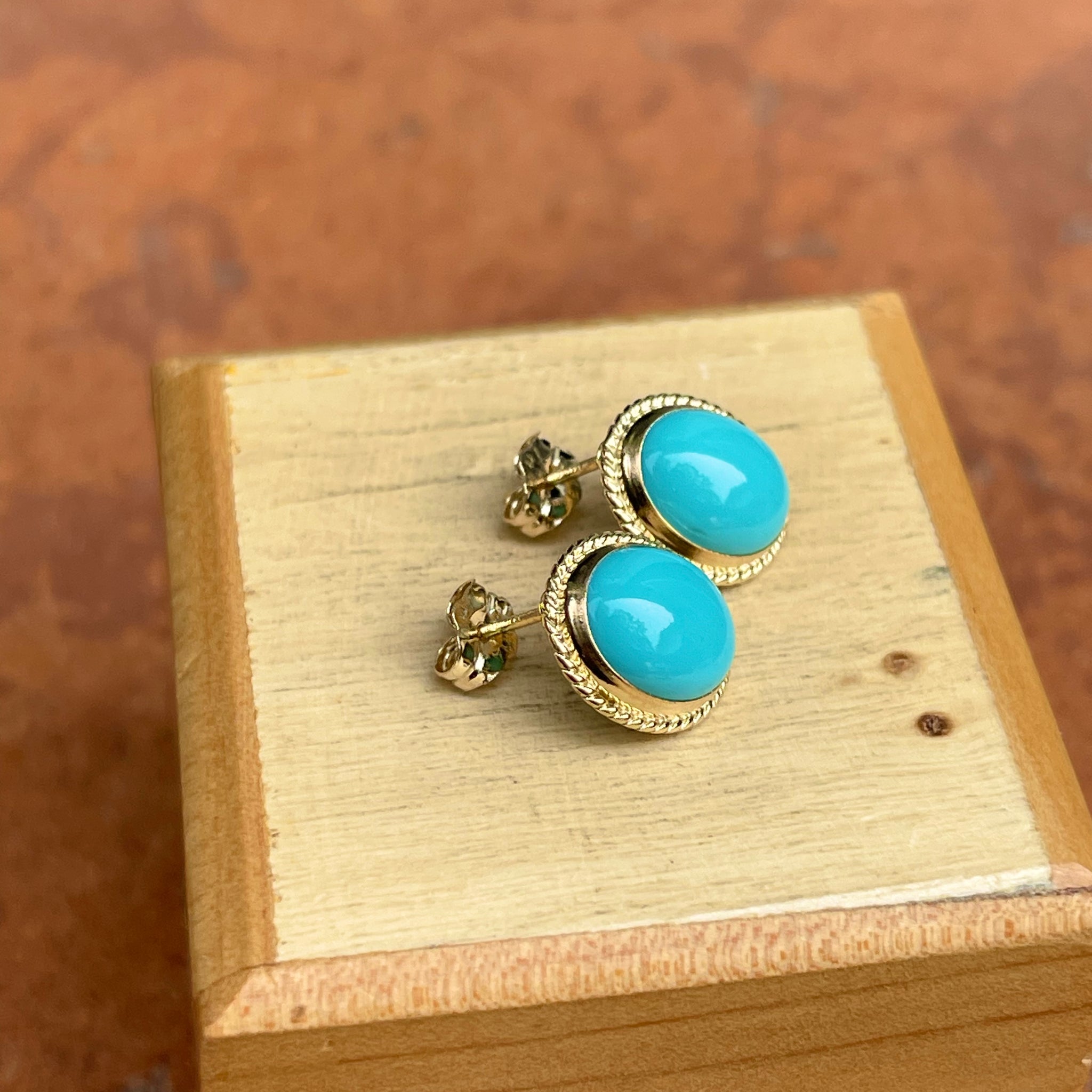 14KT yellow gold genuine, oval turquoise post stud earrings with a mil-grain bezel setting.