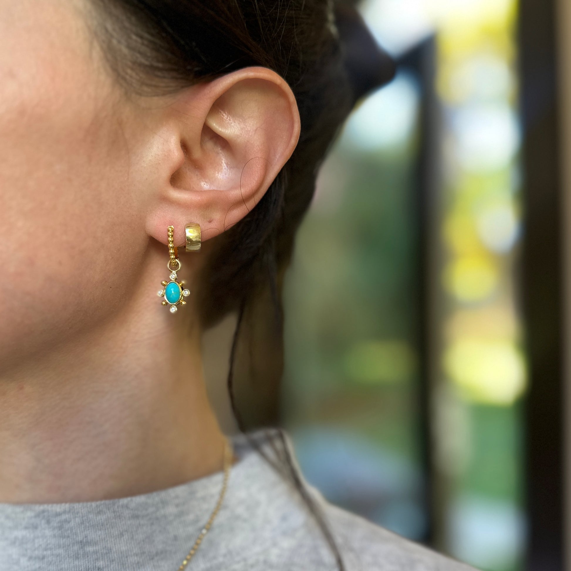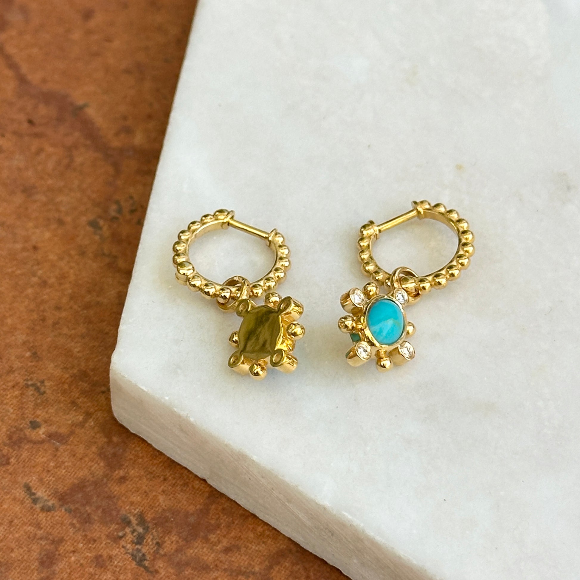 14KT Yellow Oval Turquoise and Round Diamond Earring Charms on Round Beaded Hoop Huggie Earrings
