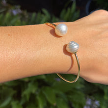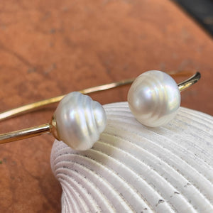 14KT yellow gold thin wire open bangle bracelet with genuine cultured Paspaley South Sea Pearl end caps.