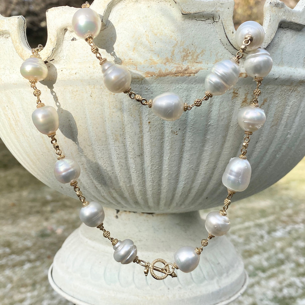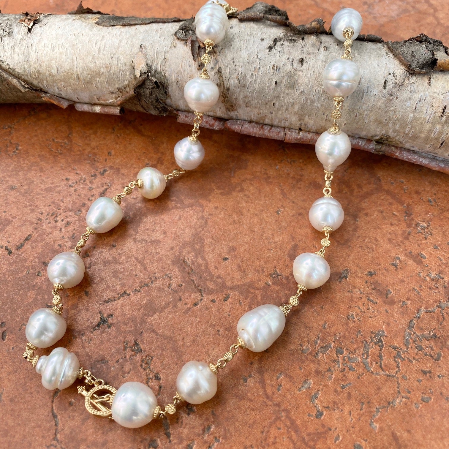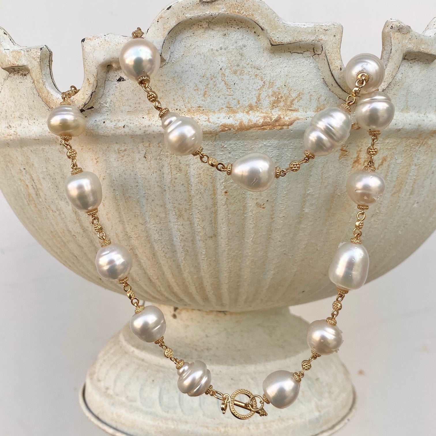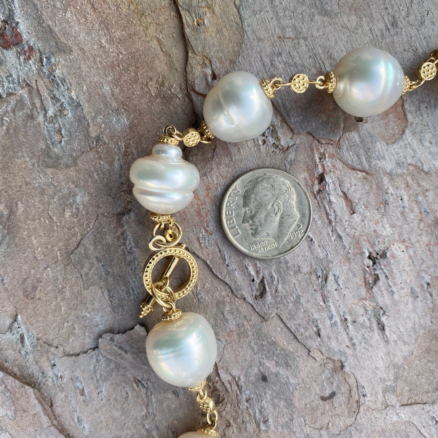 A Legacy Saint Jewelry exclusive! Polished 14KT yellow gold detailed link station necklace with (24) genuine, cultured, white Paspaley South Sea pearls. Features an easy-to-use toggle clasp that you can style with it shown in front or hidden in back. An absolutely elegant look with the most beautiful pearls in the world! Check out our matching bracelet!