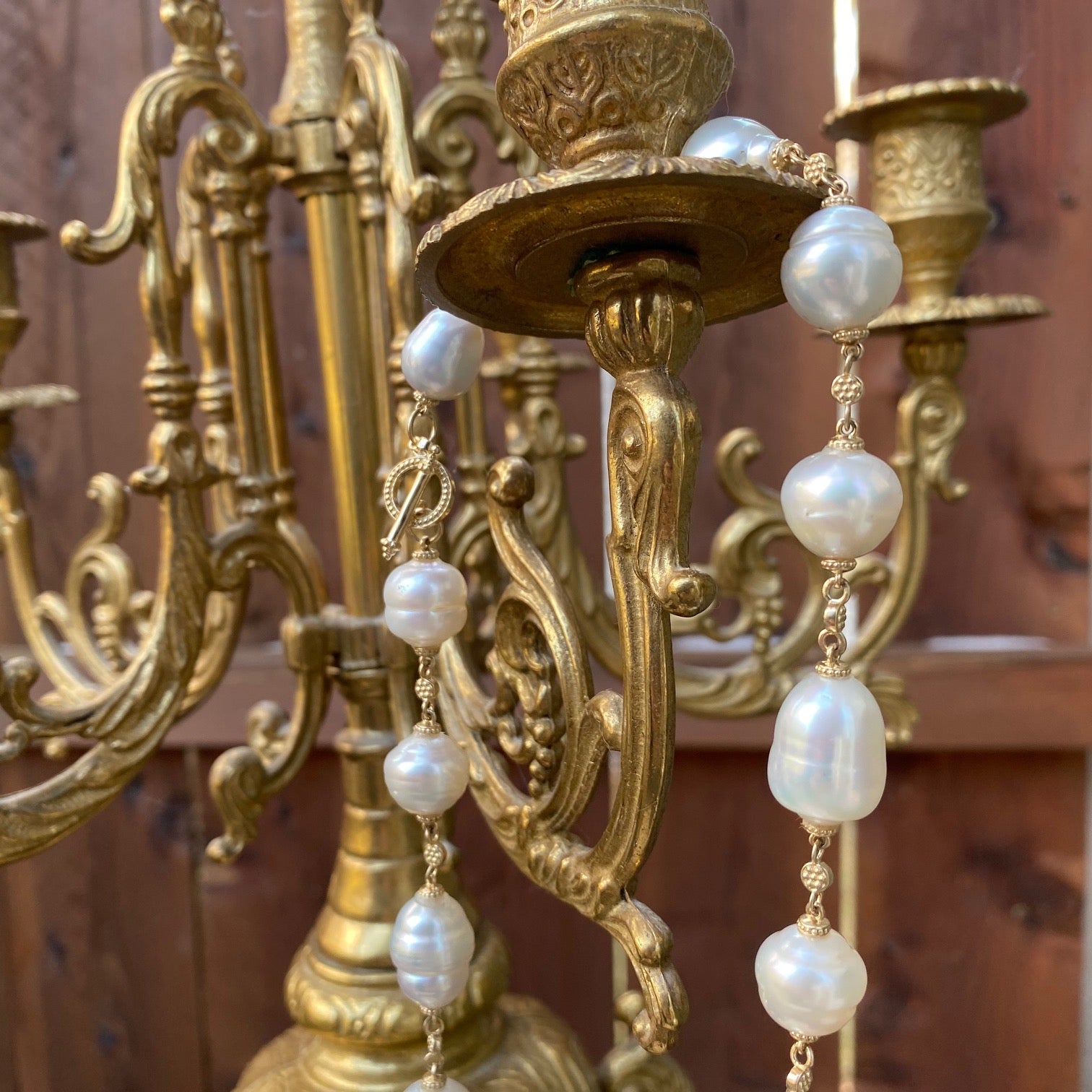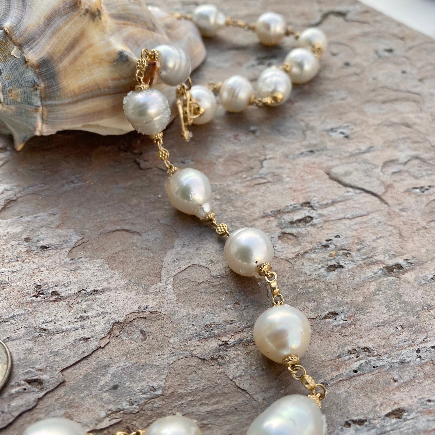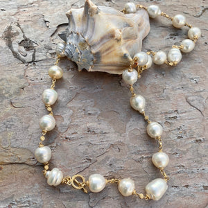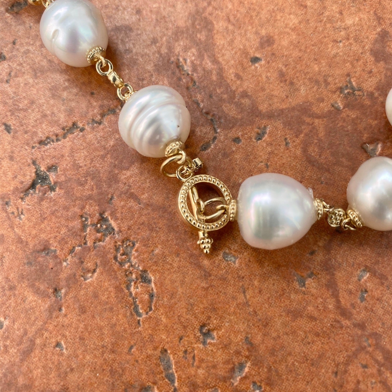 A Legacy Saint Jewelry exclusive! Polished 14KT yellow gold detailed link station necklace with (24) genuine, cultured, white Paspaley South Sea pearls. Features an easy-to-use toggle clasp that you can style with it shown in front or hidden in back. An absolutely elegant look with the most beautiful pearls in the world! Check out our matching bracelet!