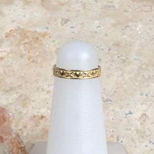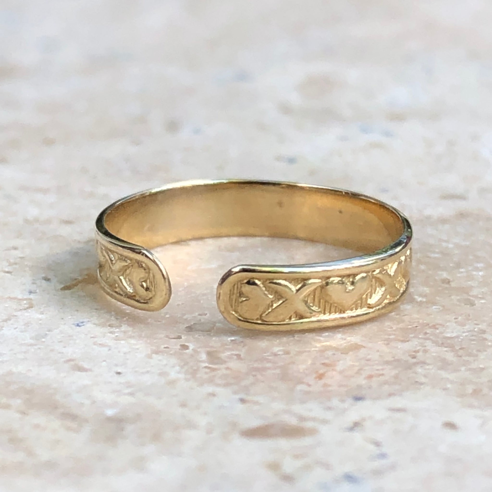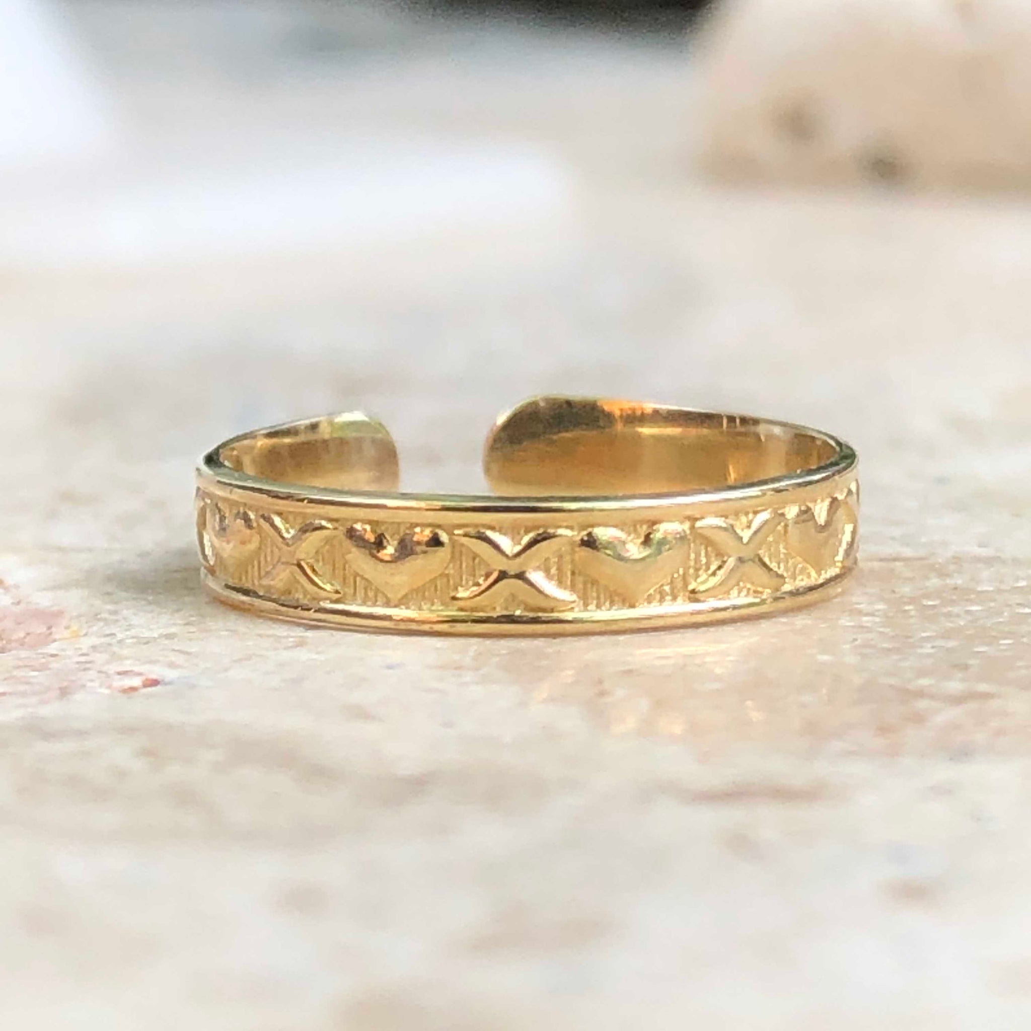 14KT yellow gold toe ring with embossed patterned hearts + "X" design. Perfect for that upcoming beach vacation. Wear in the water without fear of tarnishing!