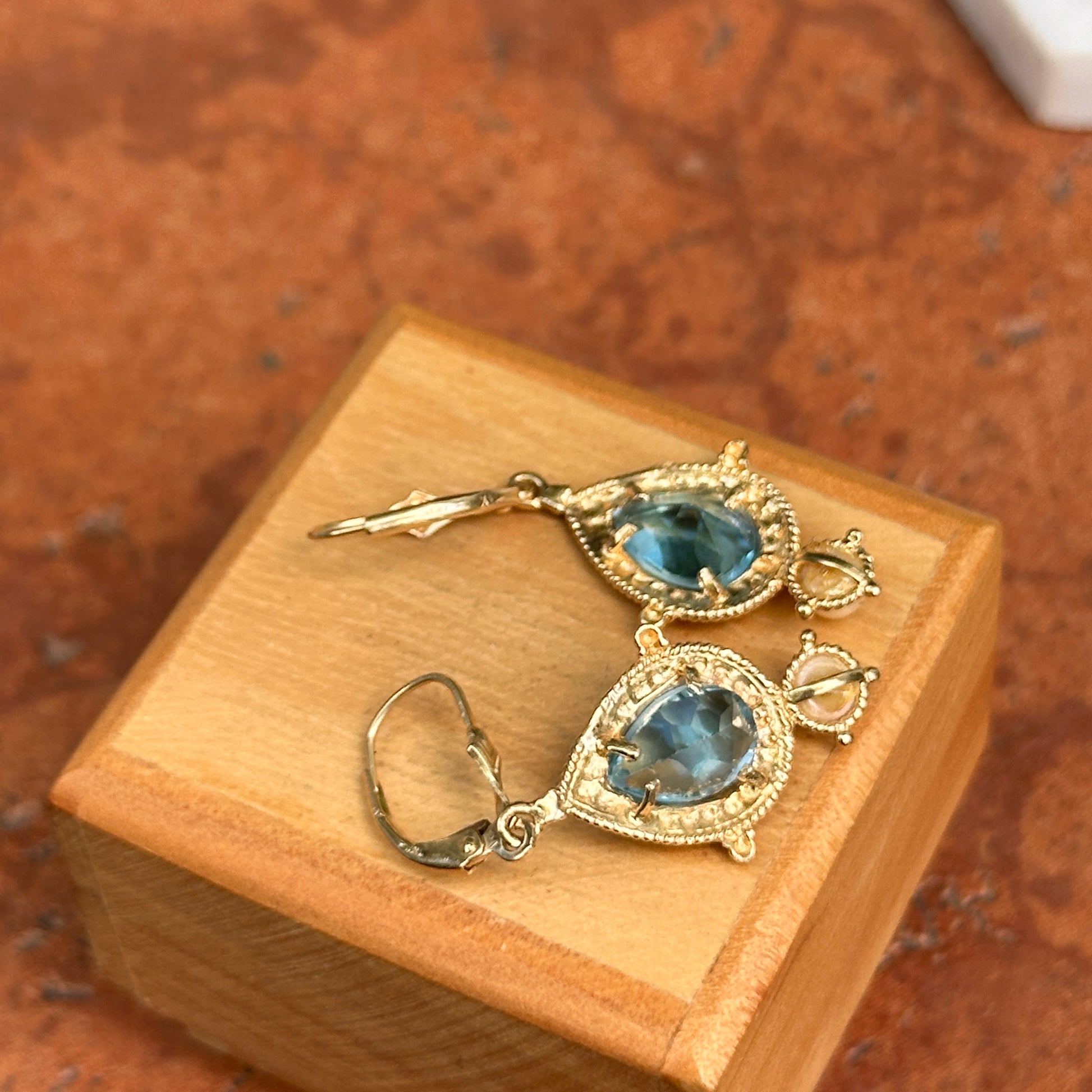 Estate 14KT Yellow Gold Pear Swiss Blue Topaz + Pearl Filigree Dangle Earrings